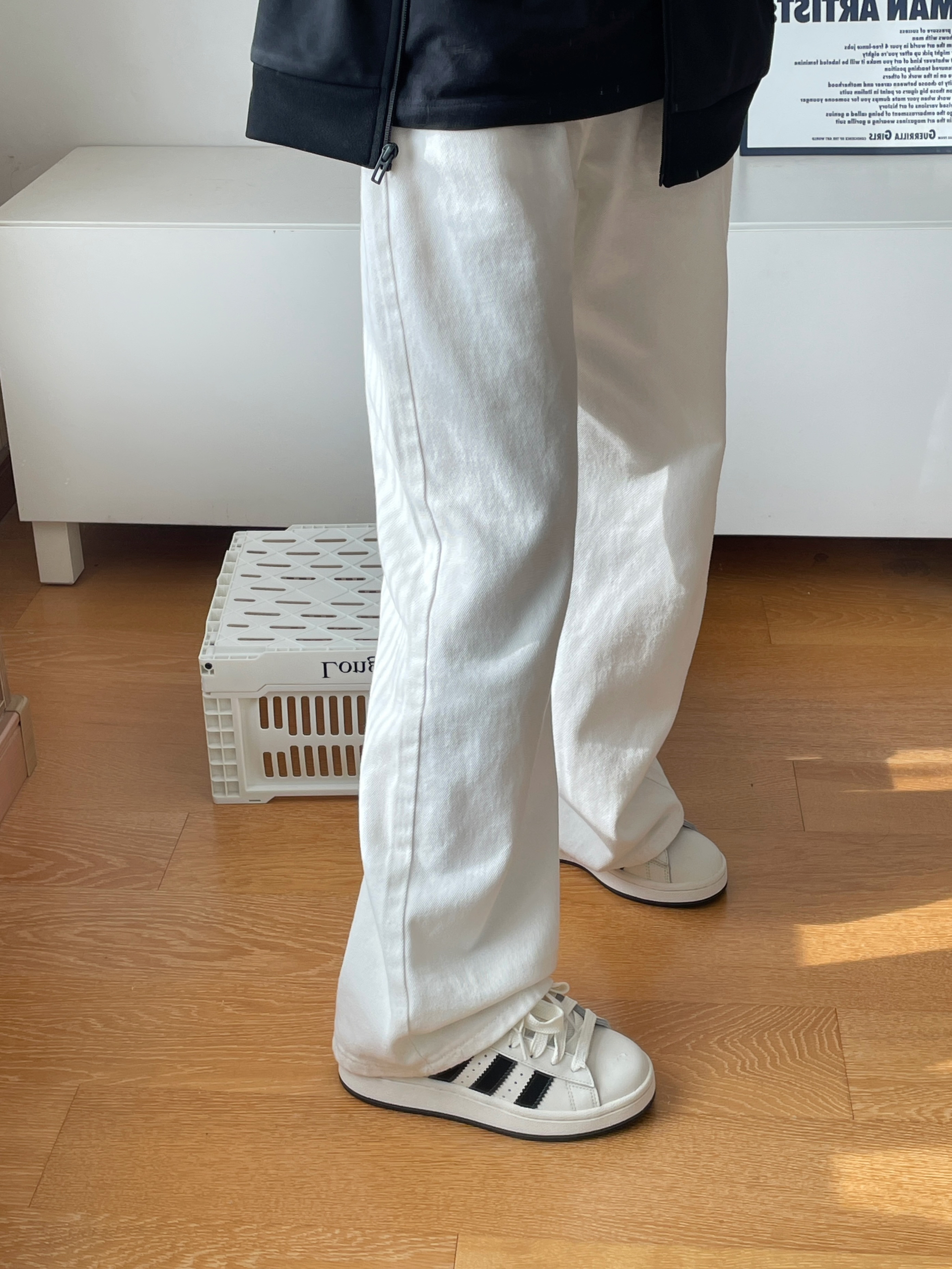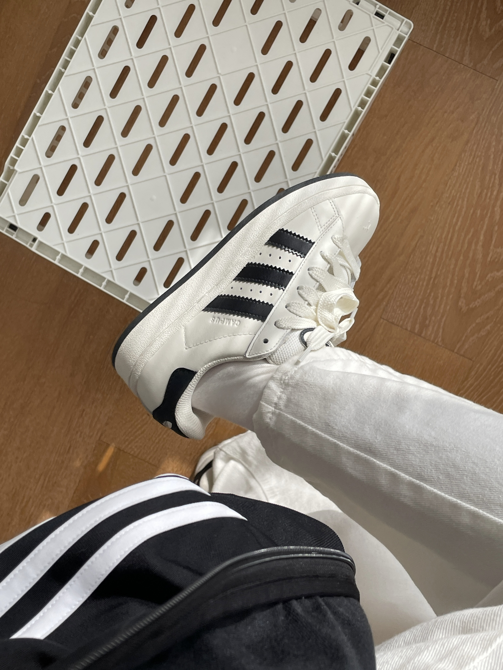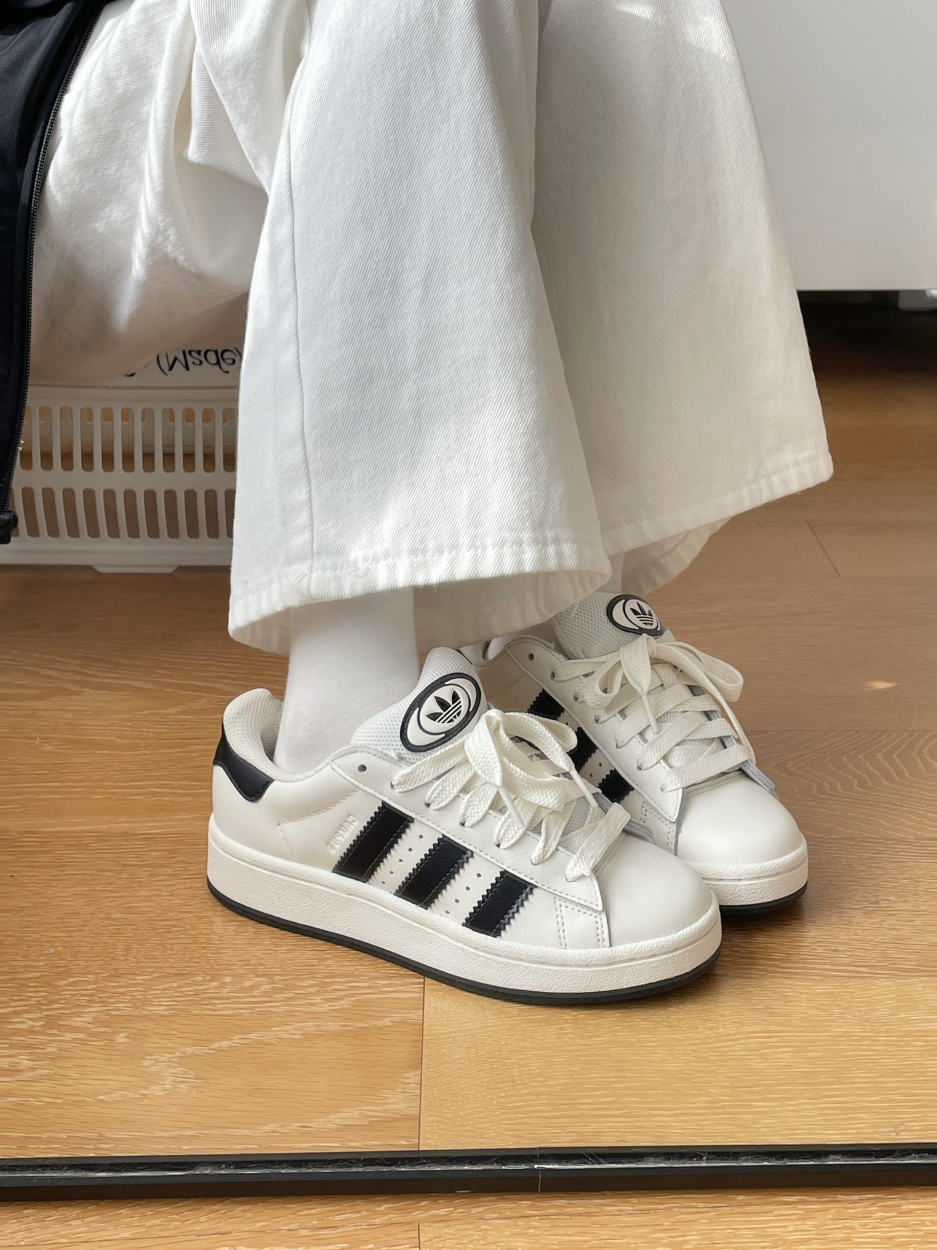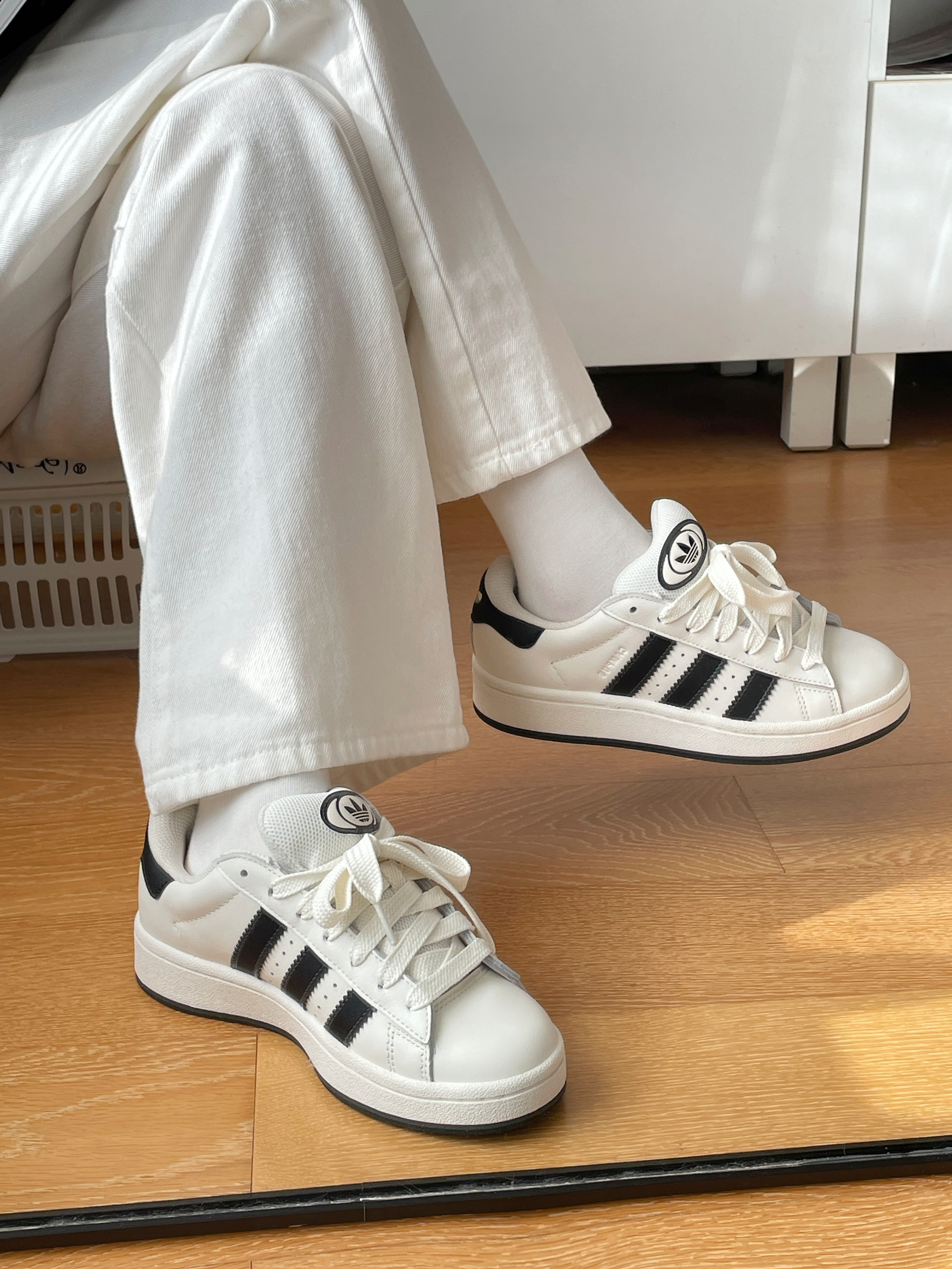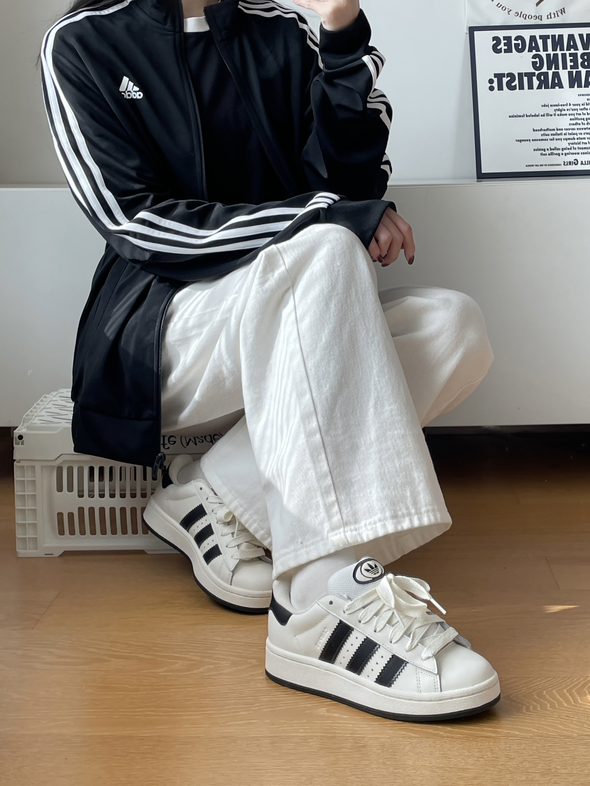 🧍♂️穿搭简介:黑白色系look 👟球鞋:黑白阿迪campus 👕上衣:阿迪黑色外套➕三叶草黑色T恤 👖裤子:白色牛仔裤