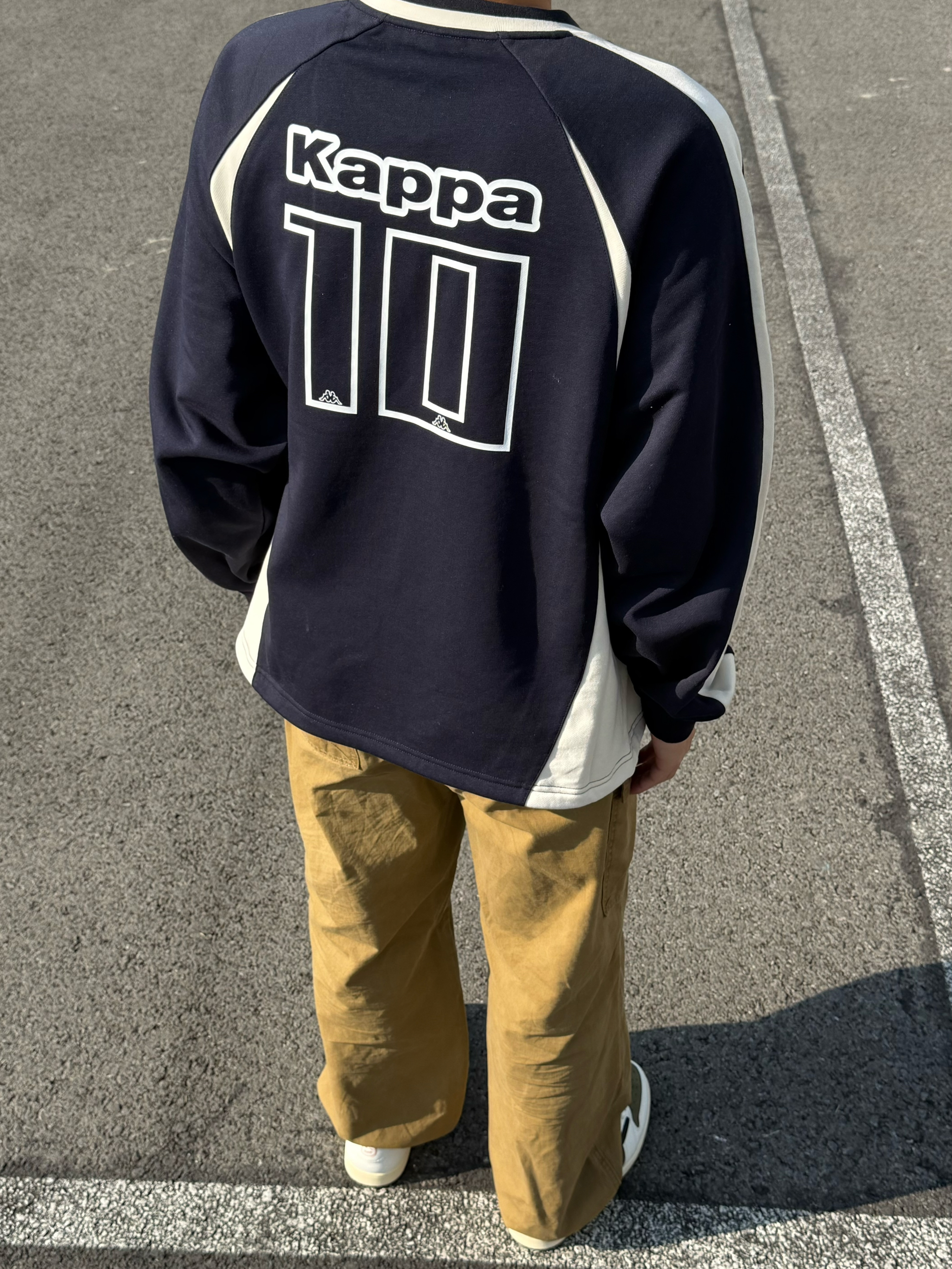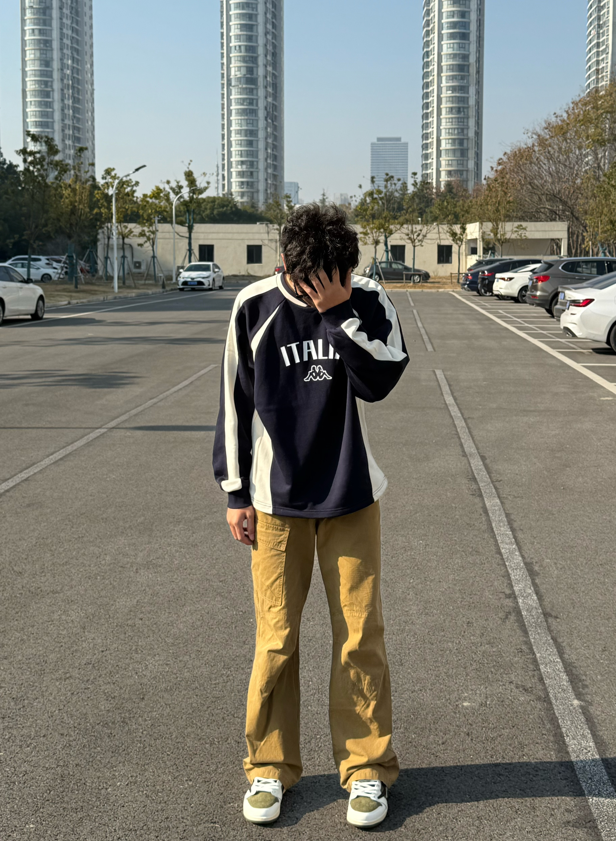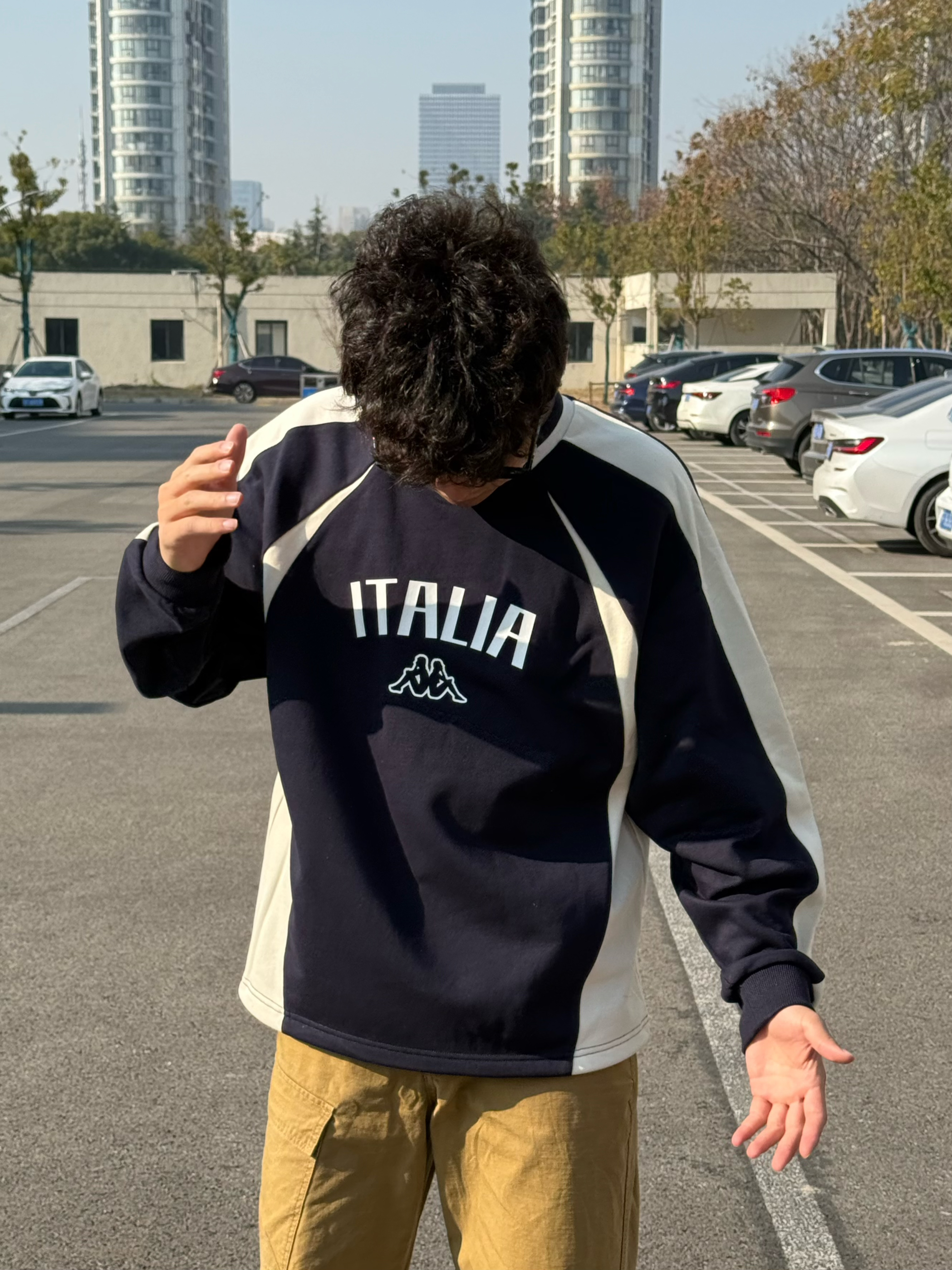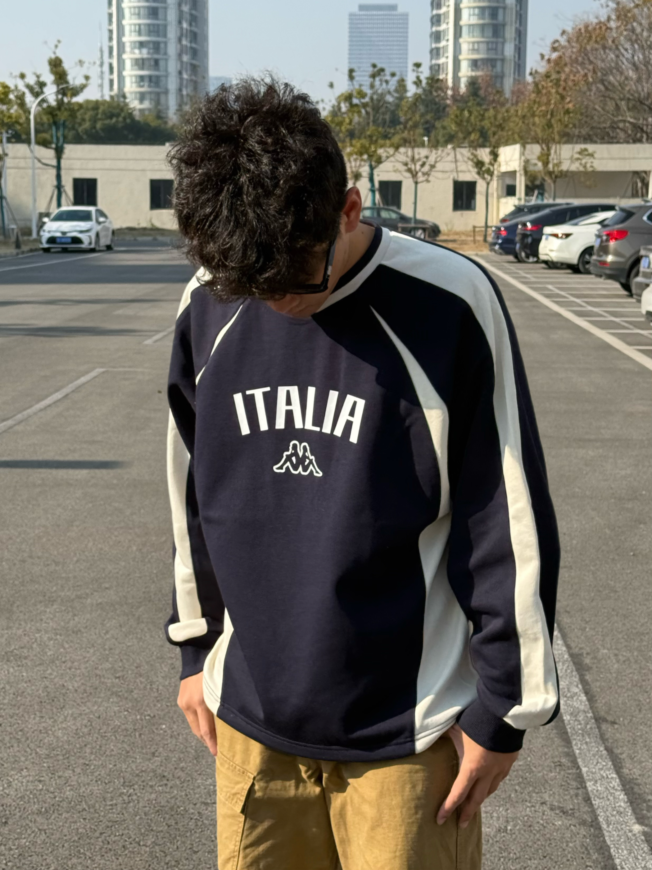 今天上身的是来自 Kappa 的长袖卫衣,经典的海军蓝与白色拼接设计,正面“ITALIA”字样搭配品牌标志,背后的“Kappa 10”字样,运动感与时尚感兼具,衣服版型略宽松,整体剪裁流畅,拉长身形比例,给人一种不经意的街头活力感[敬礼_blue][敬礼_blue][敬礼_blue] 下身搭配一条卡其色工装裤 脚踩aj1ts 真的是有点帅[强_blue][强_blue][强_blue]