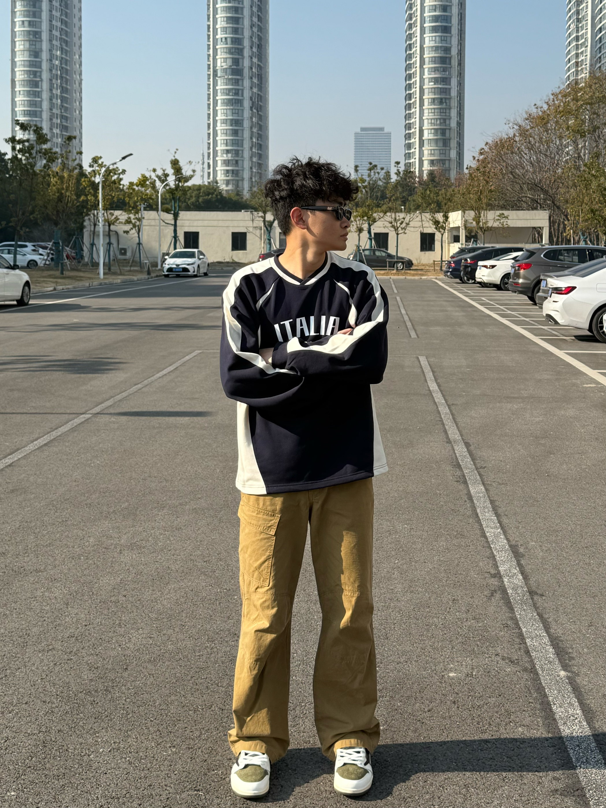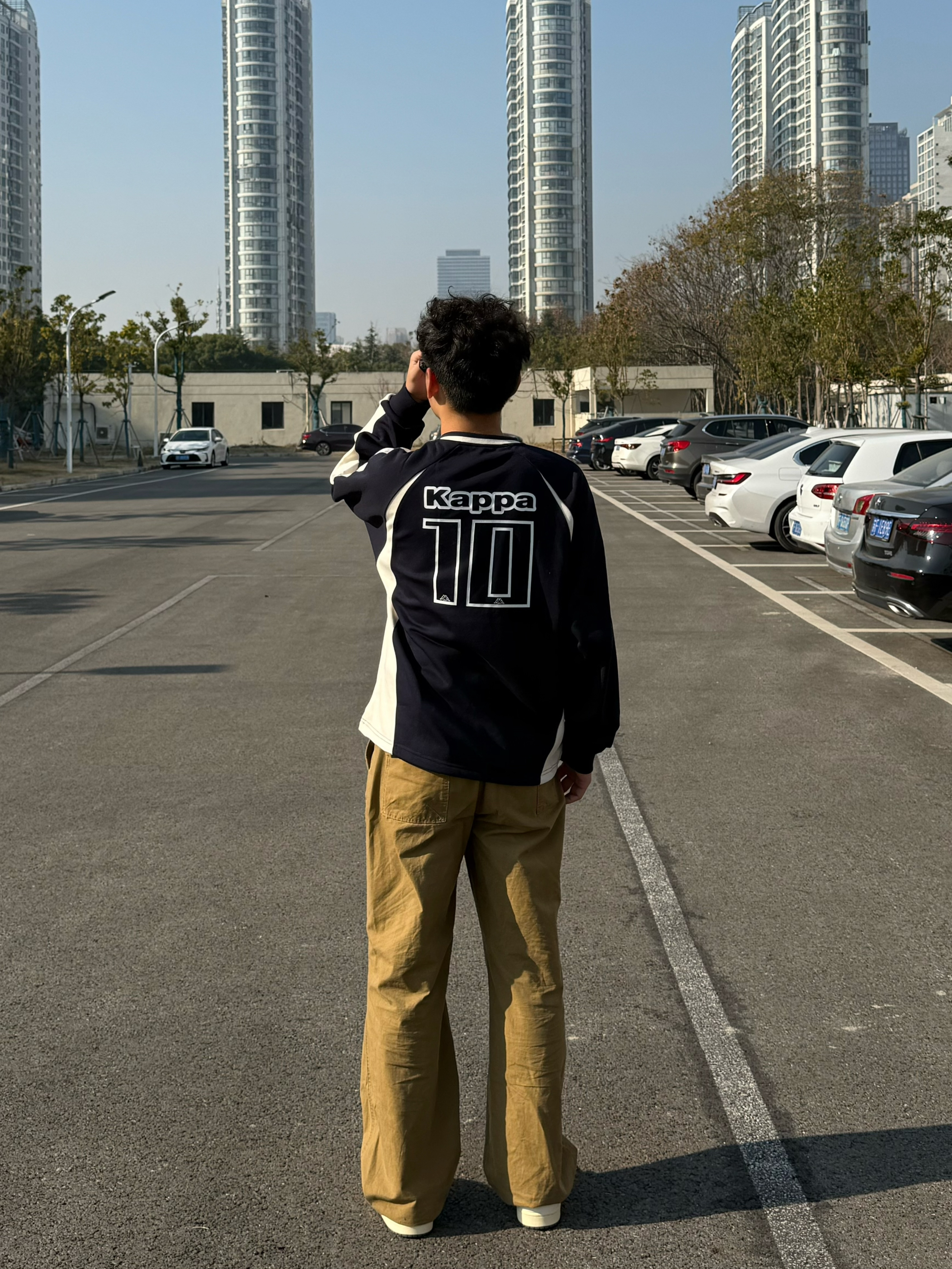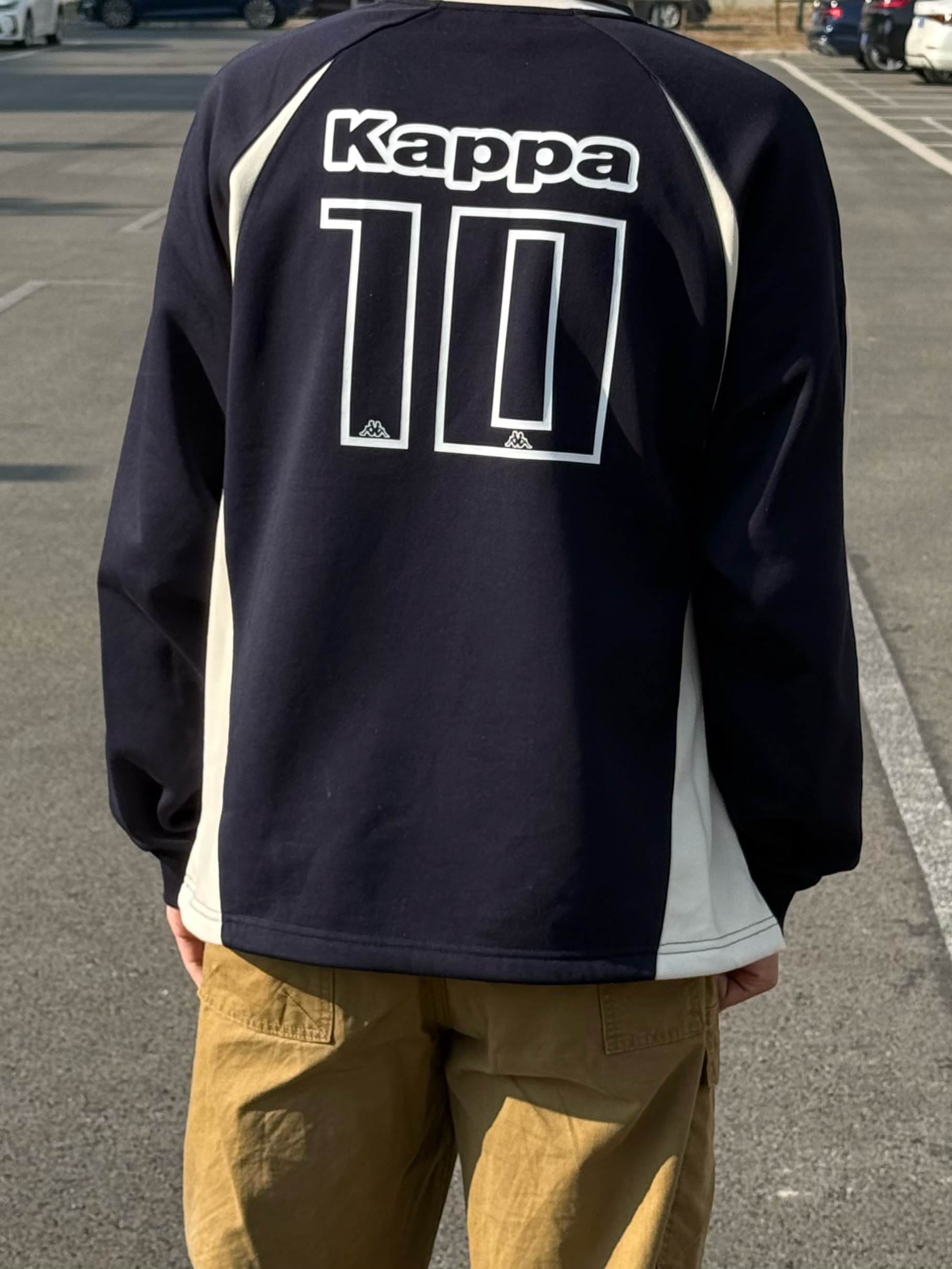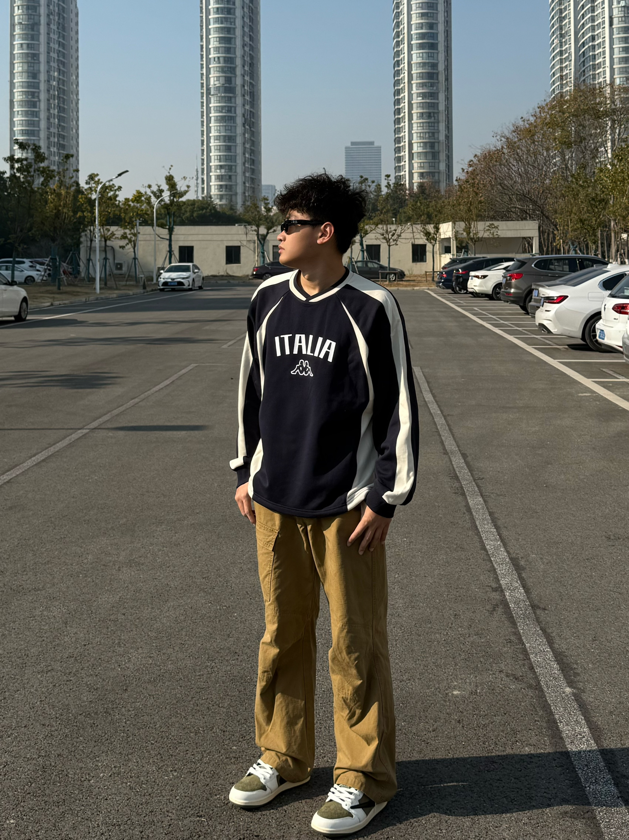 今天上身的是来自 Kappa 的长袖卫衣,经典的海军蓝与白色拼接设计,正面“ITALIA”字样搭配品牌标志,背后的“Kappa 10”字样,运动感与时尚感兼具,衣服版型略宽松,整体剪裁流畅,拉长身形比例,给人一种不经意的街头活力感[敬礼_blue][敬礼_blue][敬礼_blue] 下身搭配一条卡其色工装裤 脚踩aj1ts 真的是有点帅[强_blue][强_blue][强_blue]