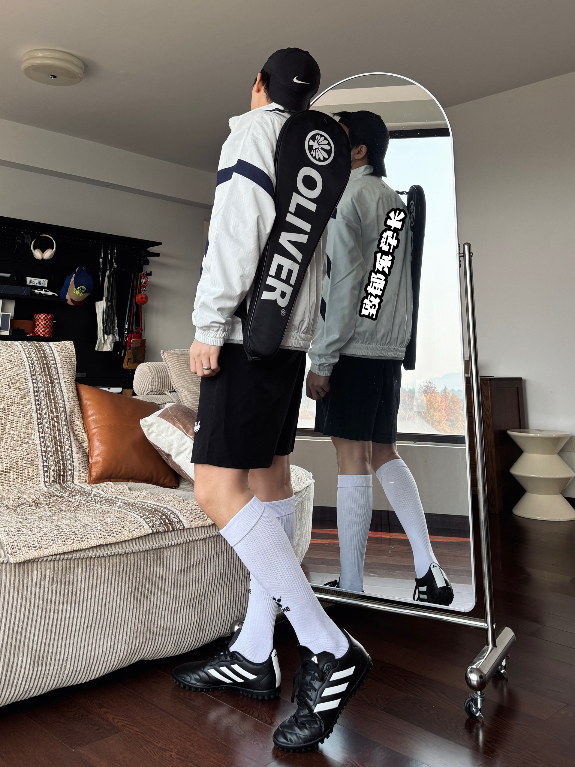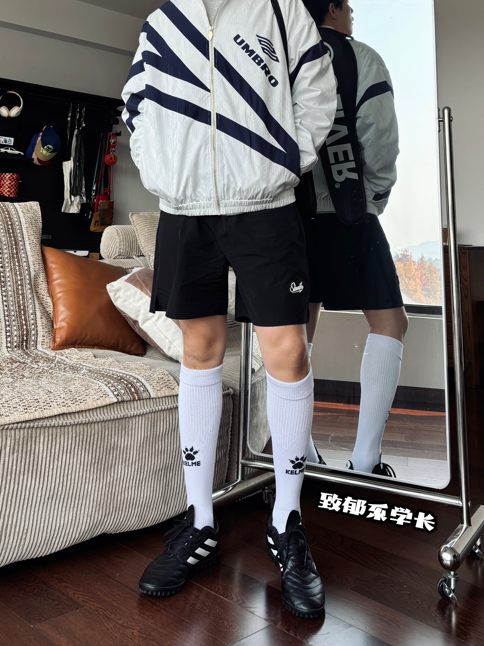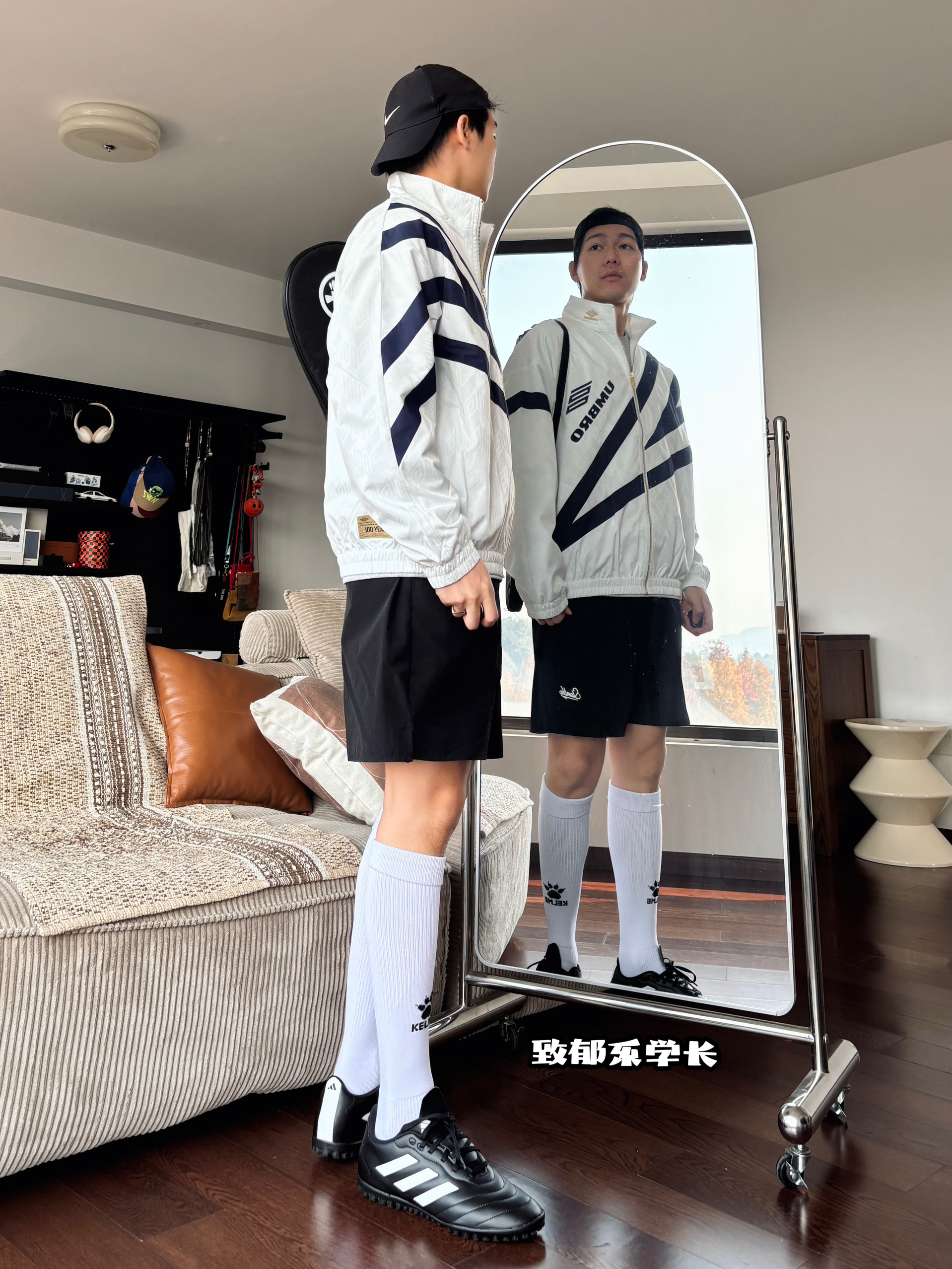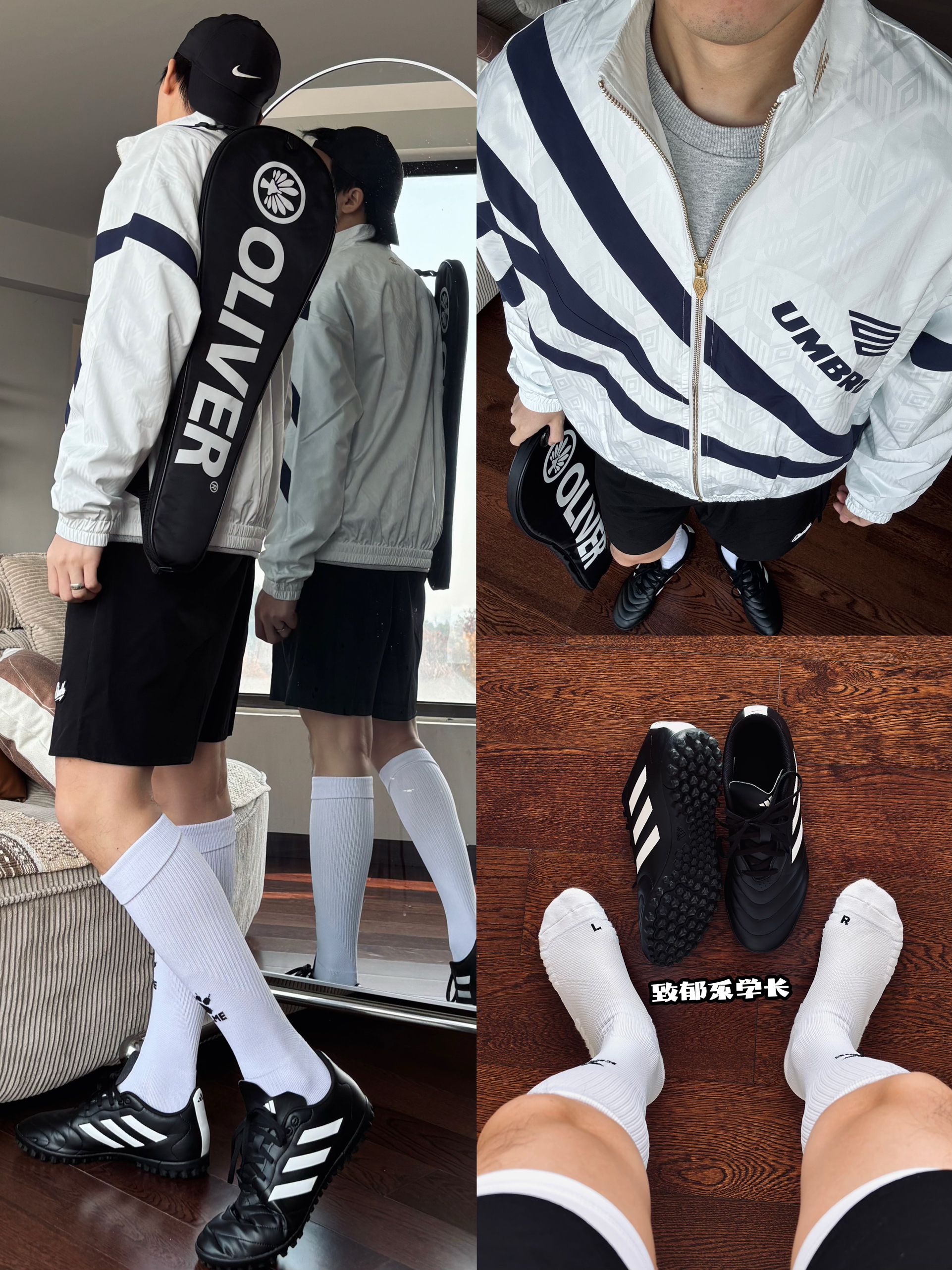 茵宝条纹印花外套,搭配黑色速干短裤、足球过膝袜、足球鞋,再背个壁球拍 真的好帅❗️真的好帅❗️真的好帅❗️ Ps:已确认为“自恋型人格”