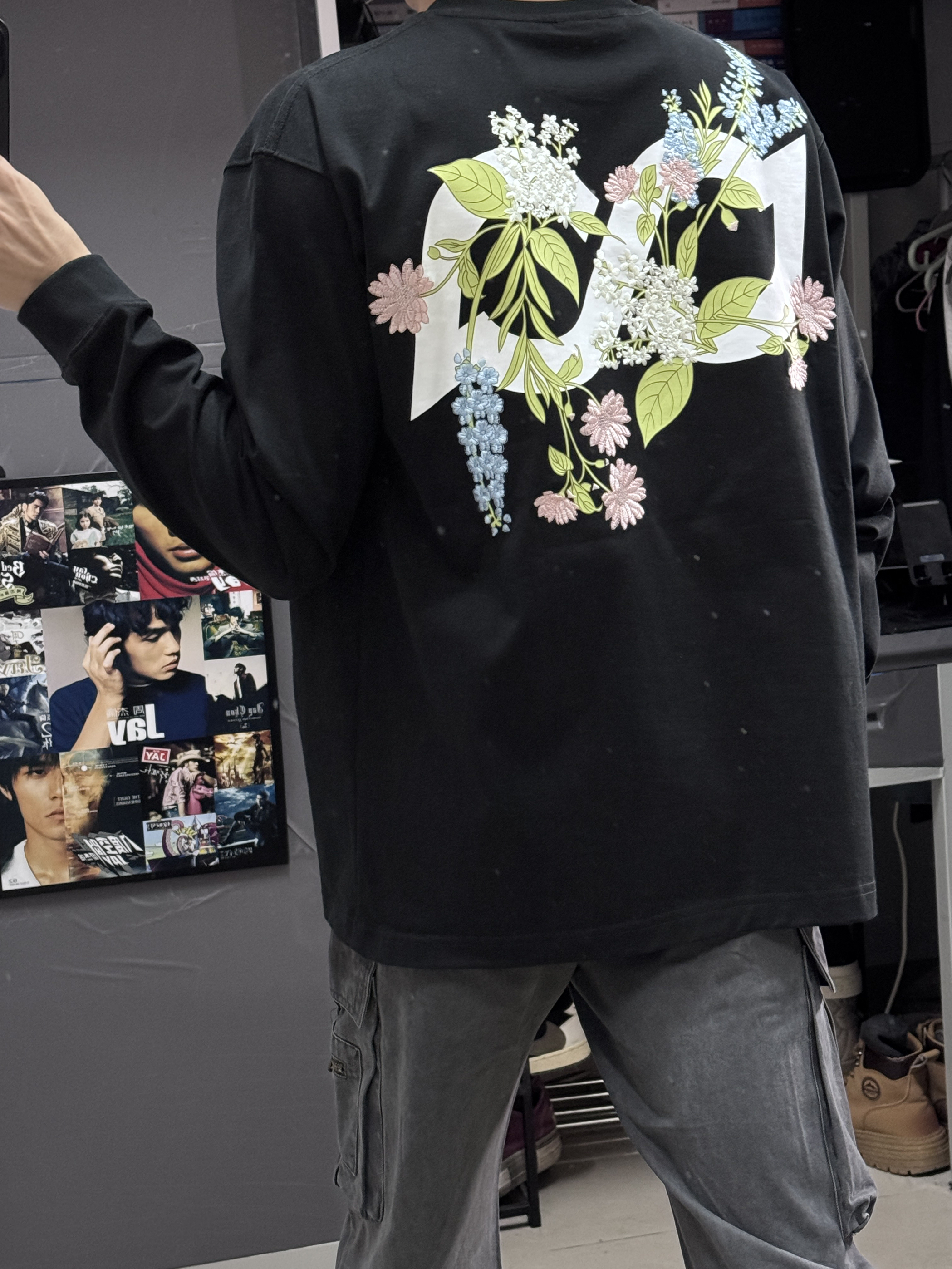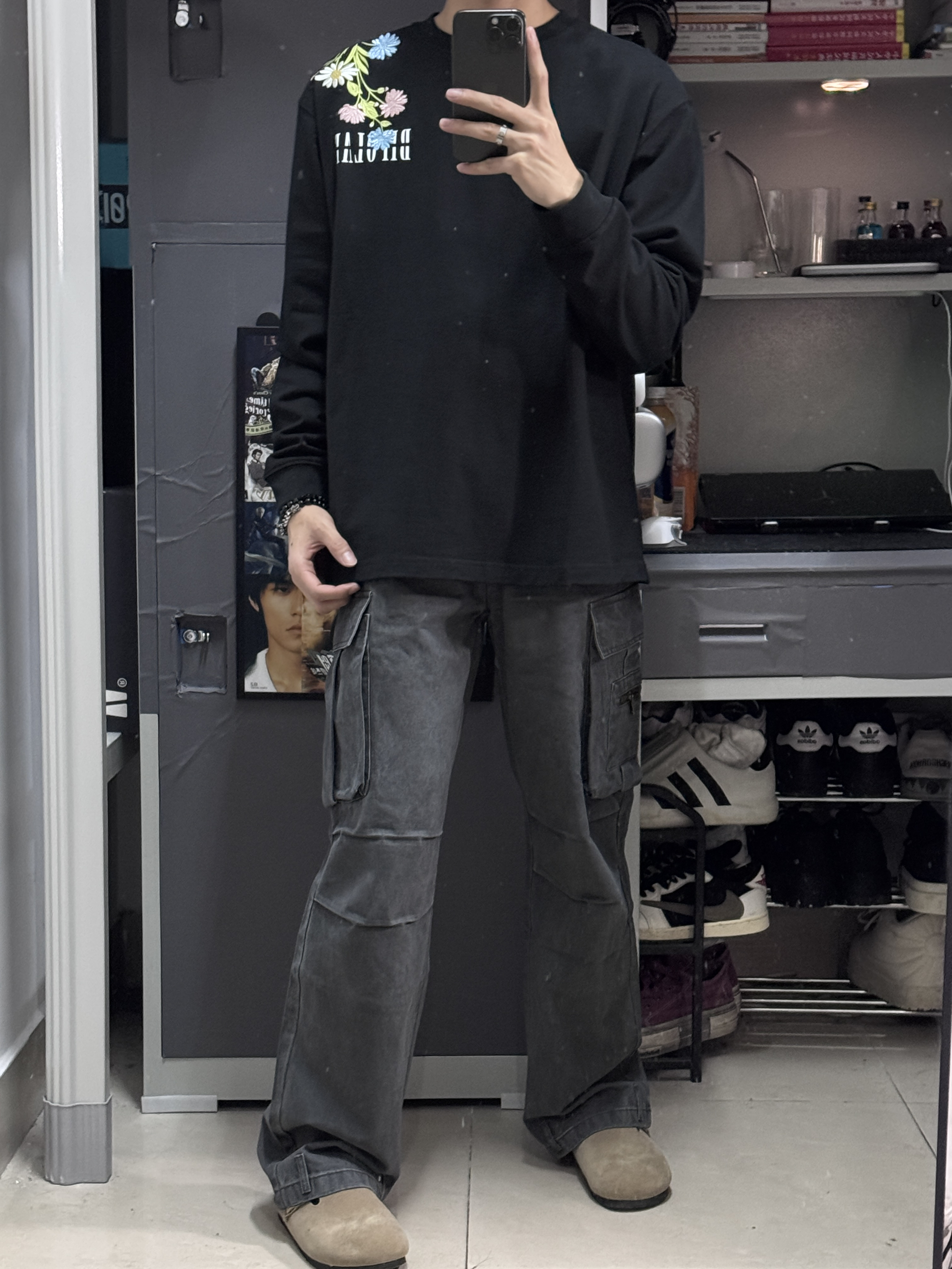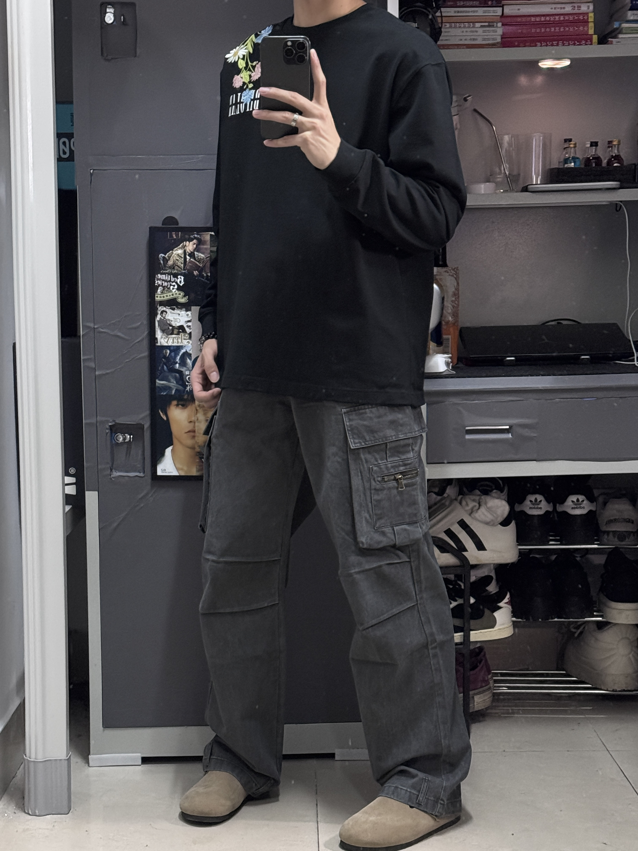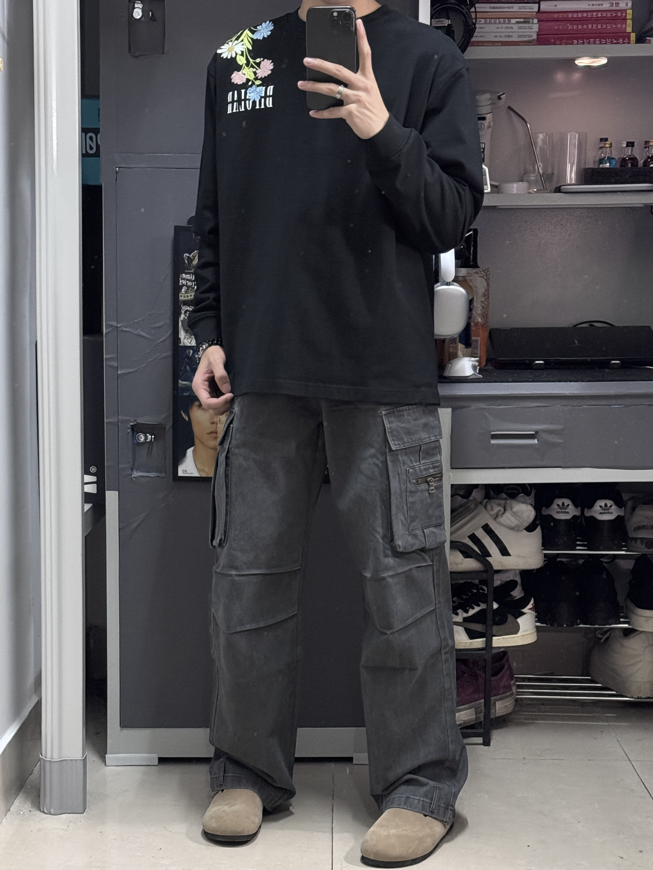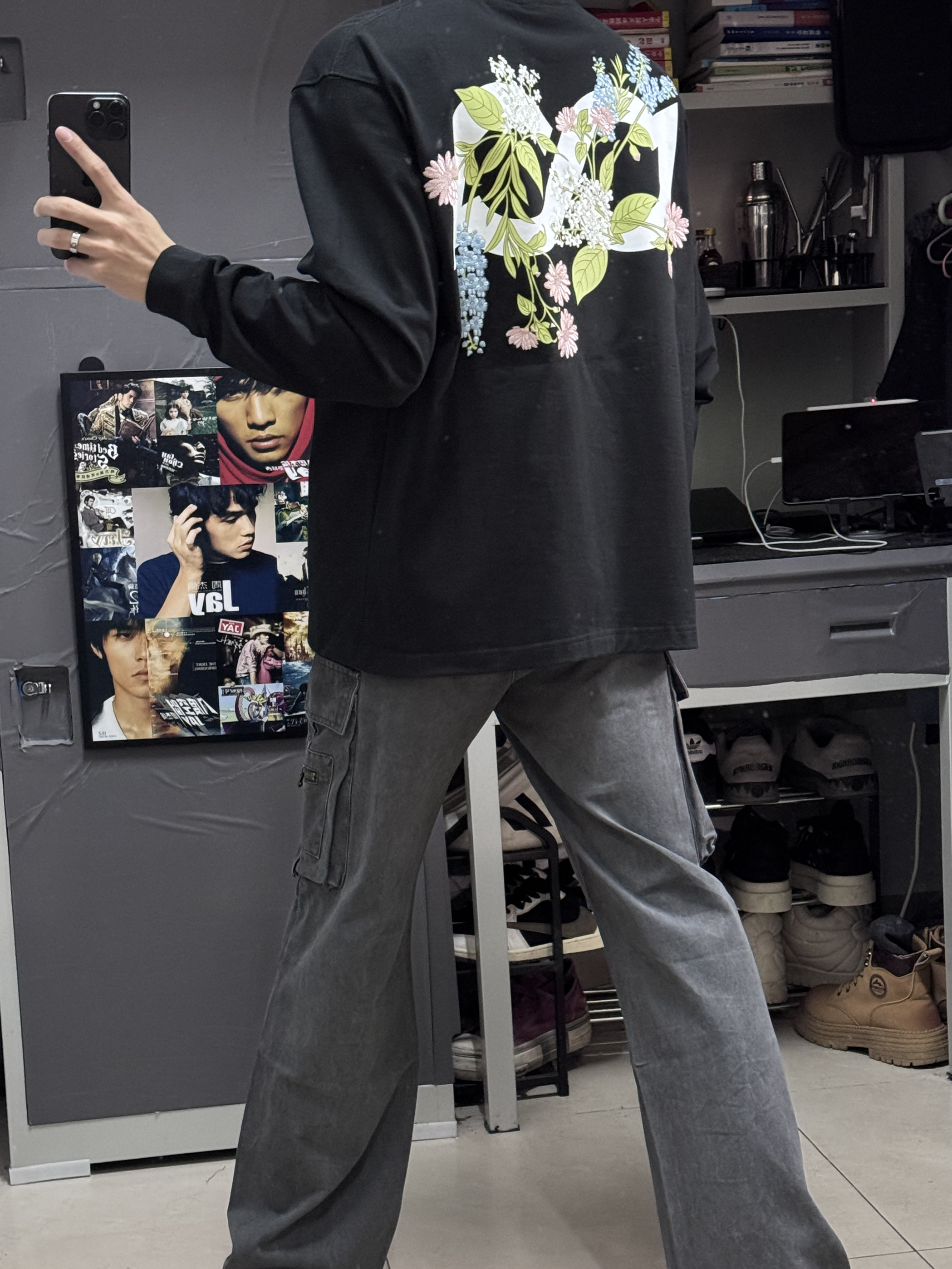 👔上身的是一件刺绣设计繁花枝叶图案的长袖,衣服上身清爽舒适,我170上身的是S码,尺码刚好合适。上身真的好看,帅气百搭! 👖裤子搭配了一件工装裤子,灰色真的是百搭裤色,工装风一直都很潮流,工装裤上身更显气质很有型!