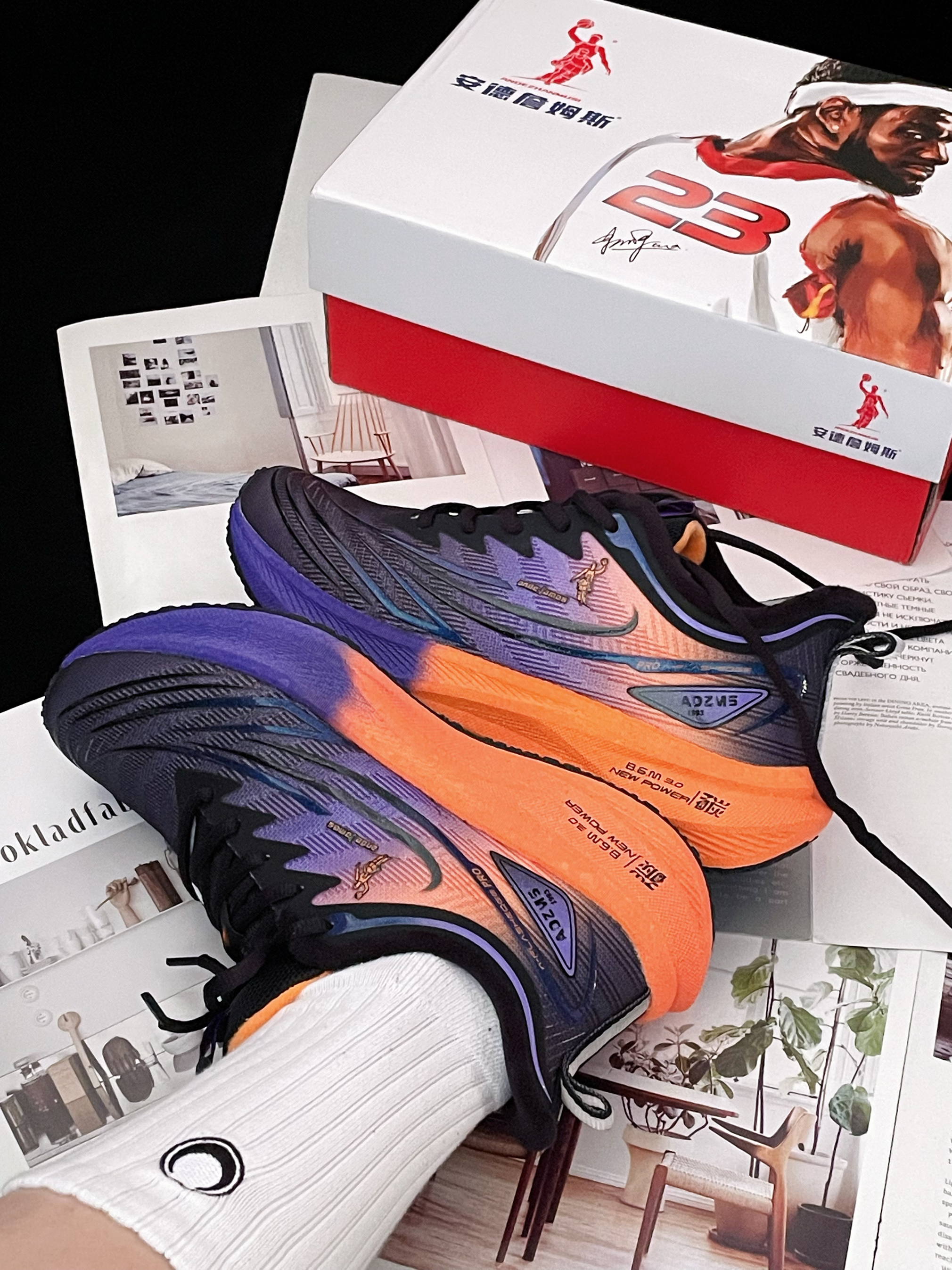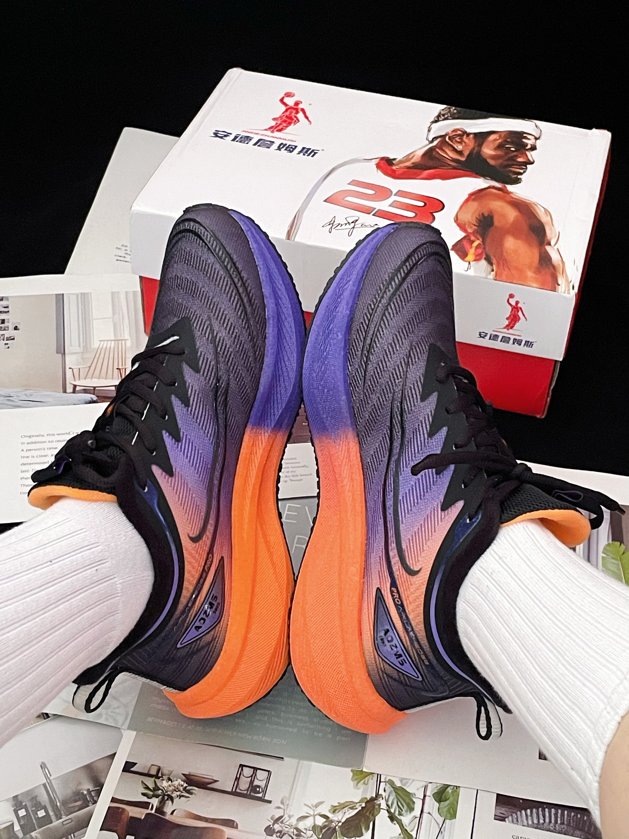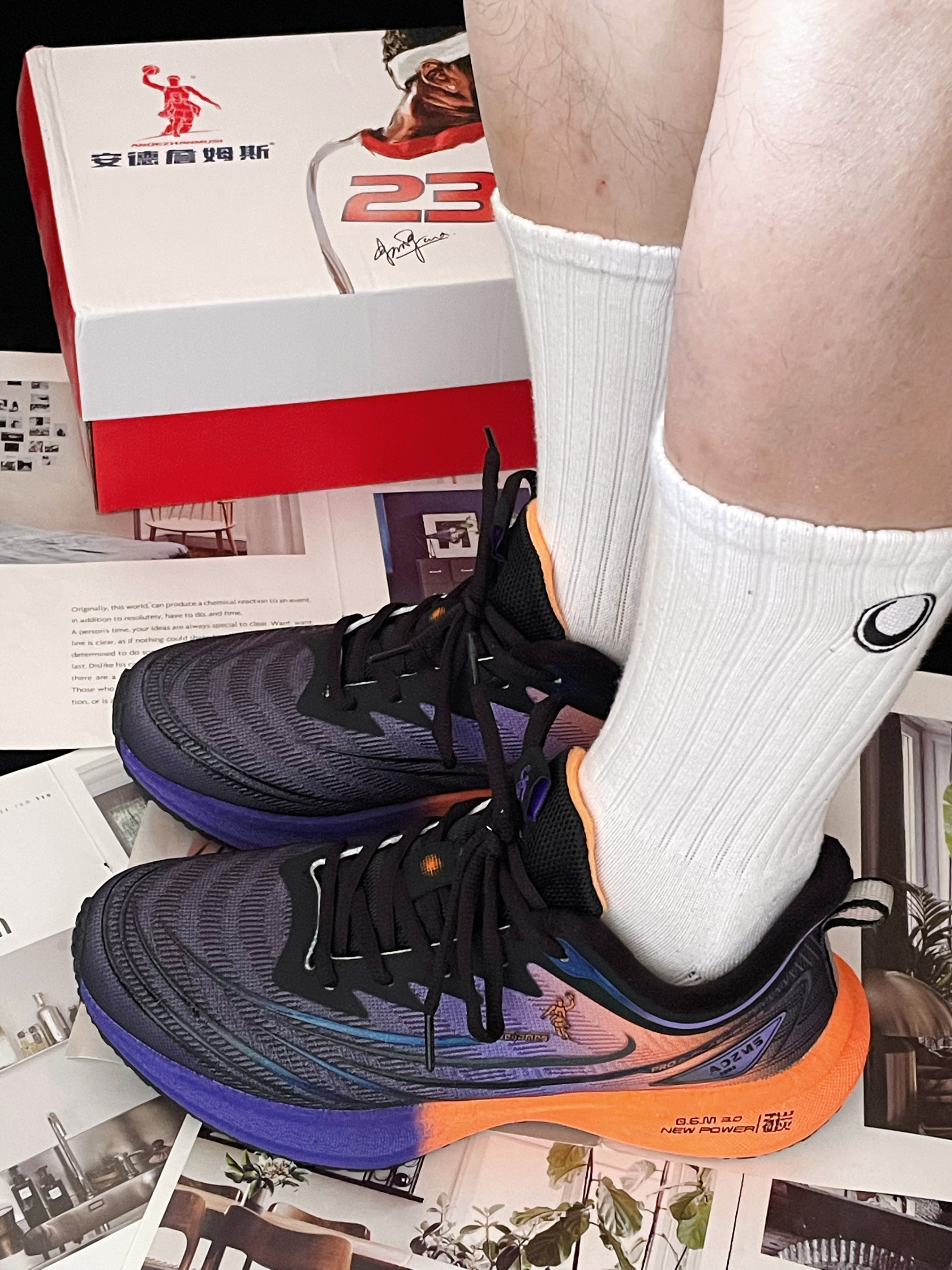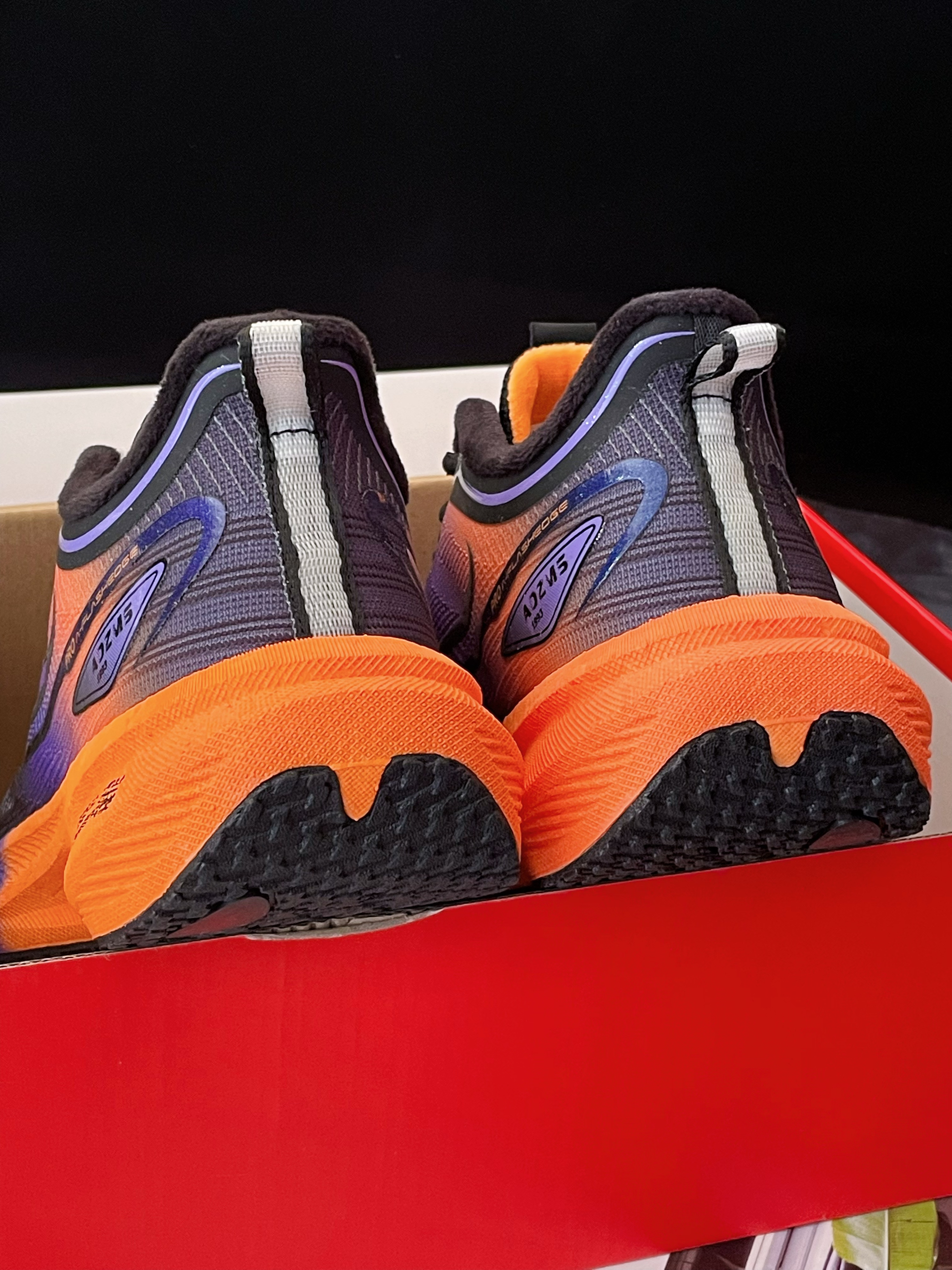 今天给大家分享这双 安德詹姆斯 全掌碳板 加绒跑步鞋 鞋款由黑紫橙渐变为主色调 整体的配色蛮酷帅的 也很有活力~ 鞋面选用了网布织物+热熔补强 不仅轻薄透气 强度和韧性也不错 加绒的内里很保暖 更适合秋冬季节~ 中底搭载了爆米花材质+全掌碳板 脚感软弹 舒适轻盈 抗扭稳定性也到位 不规则纹路大底抓地力出色 耐磨防滑没有问题 ⚠️尺码方面不偏码 建议正码选择