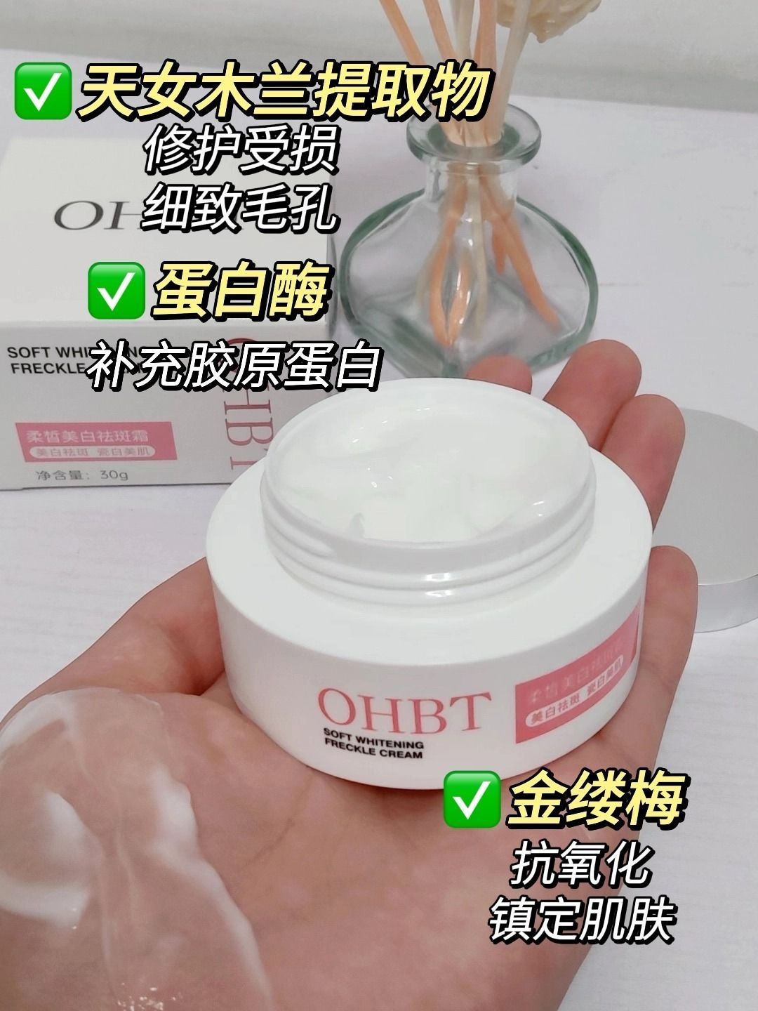 救命!这么牛的祛斑霜为什么不早点出现啊! 真的是拯救了我的油痘暗沉肌啊! 持证祛斑 实力效果在线! 添加了多种珍贵成分 从根源去黑提亮 强韧肌肤 质地轻盈 水润度高 一抹就得光感肌!熬夜党真的要买这款OHBT祛斑霜 不仅能减少暗沉 还能提亮肌肤 强韧屏障 舒缓修护肌肤 酸奶般质地 水润而不粘腻 清透易吸收 每天涂一涂 肌肤会变得更加有光泽!染上班味脸上暗沉黄气! OHBT柔皙美白祛斑霜 添加了烟酰...