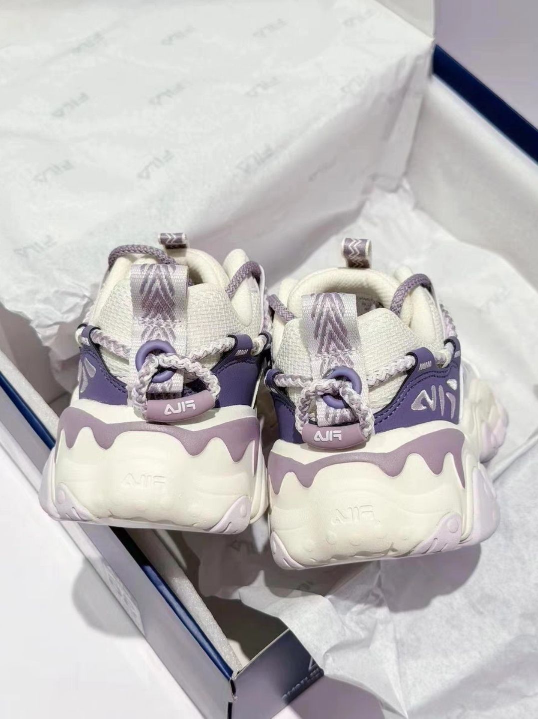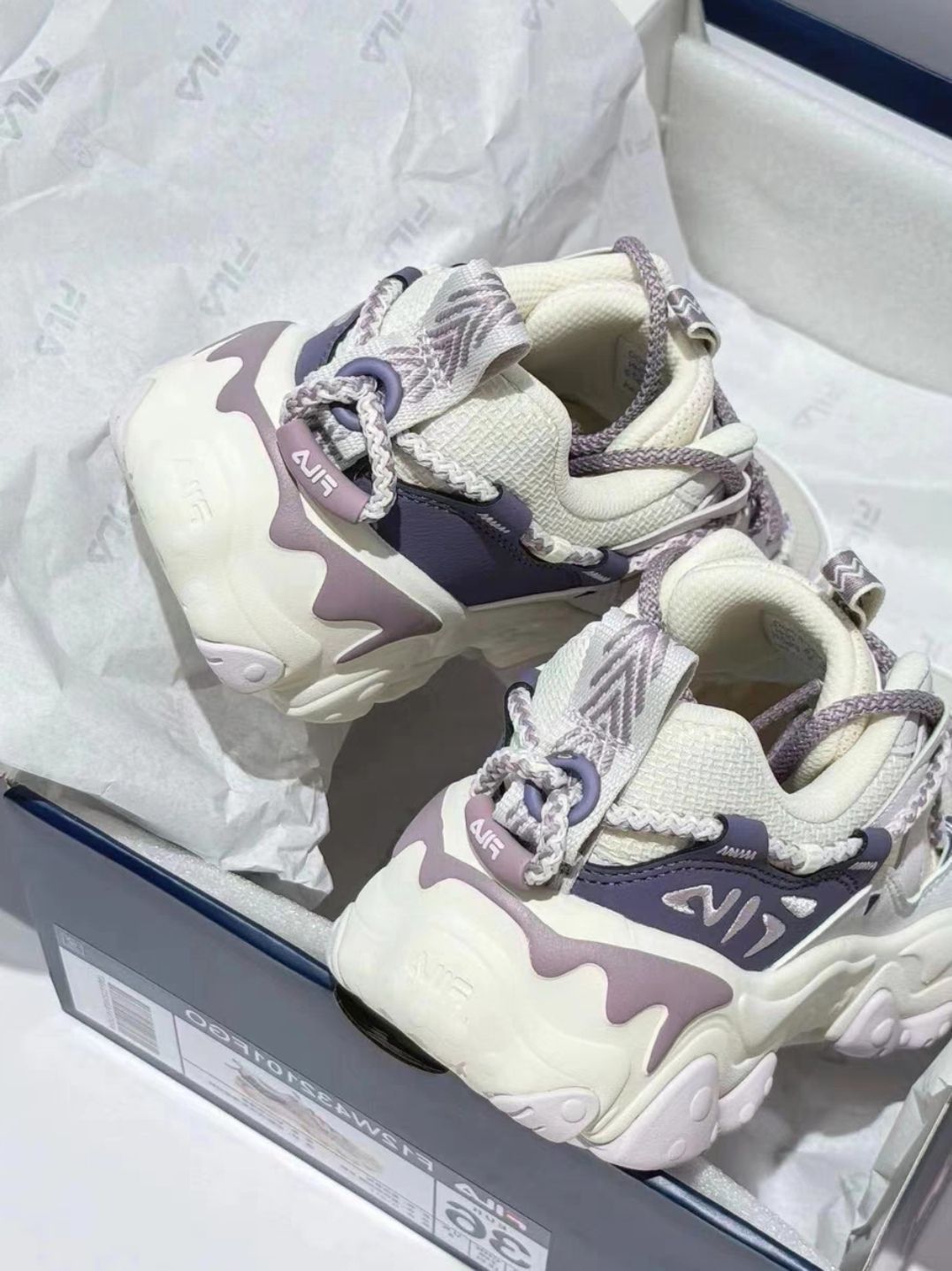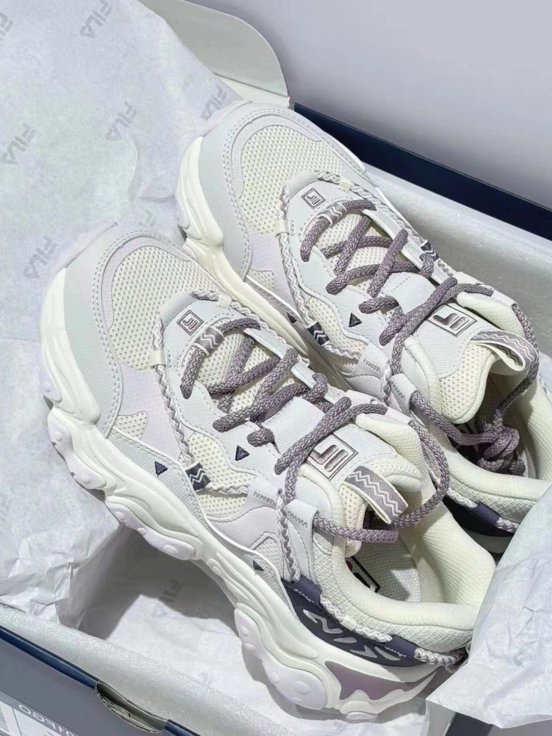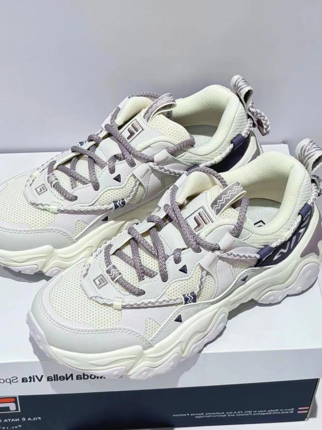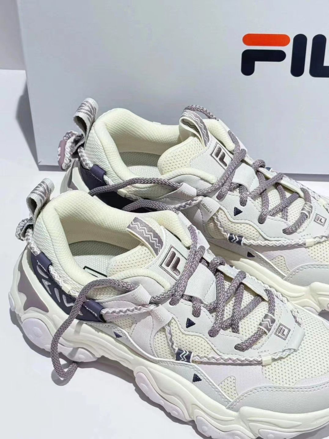 本篇笔记关联了FILA/斐乐 猫爪5代 老爹鞋 轻便增高复古厚底时尚 女款/奶白色/浪漫紫等商品,为用户提供真实的使用体验和购买参考。