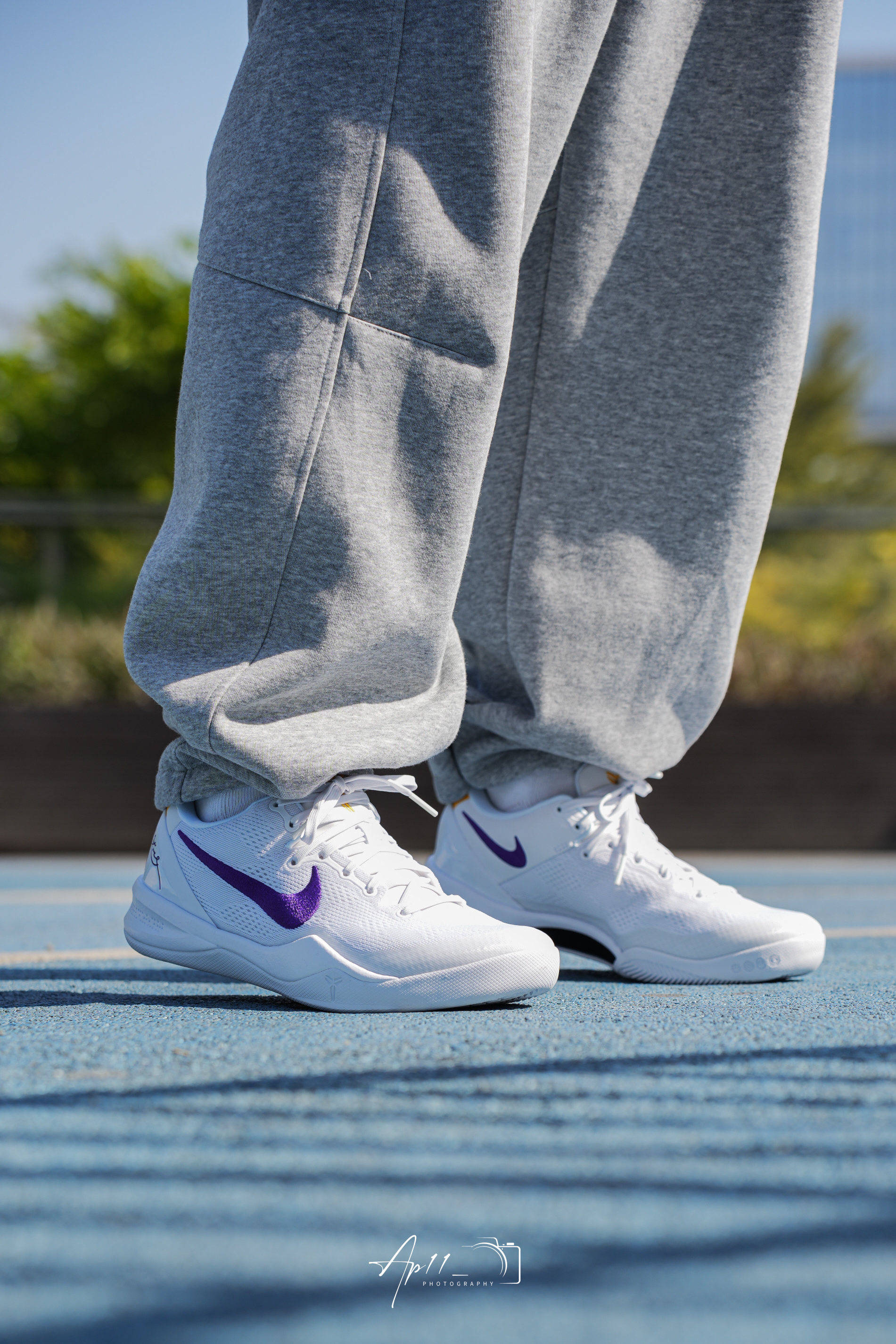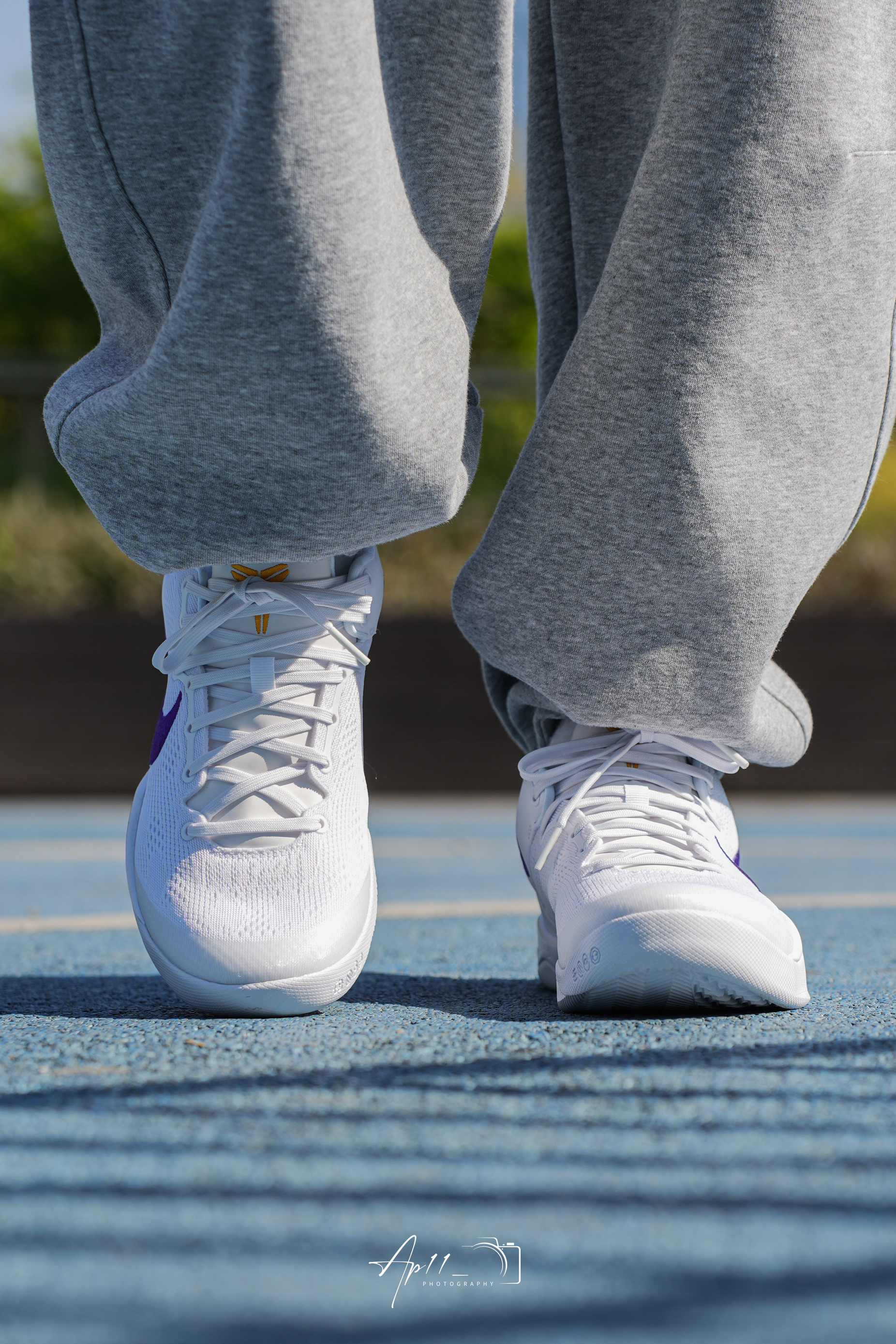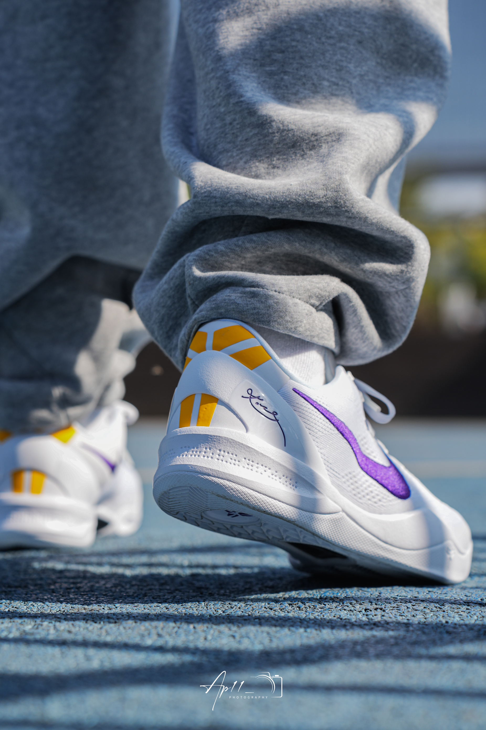 今天给大家带来这双科比8“湖人队主场”配色的上脚分享,这个配色的宗旨也是向科比湖人生涯致敬,科比在湖人征战20个赛季,带来了五座NBA总冠军,诠释了一个人一座城。主色调以白色为主,细节方面黄色、紫色来点缀。侧面印上紫色耐克的Swoosh标志,衬托白色鞋面。