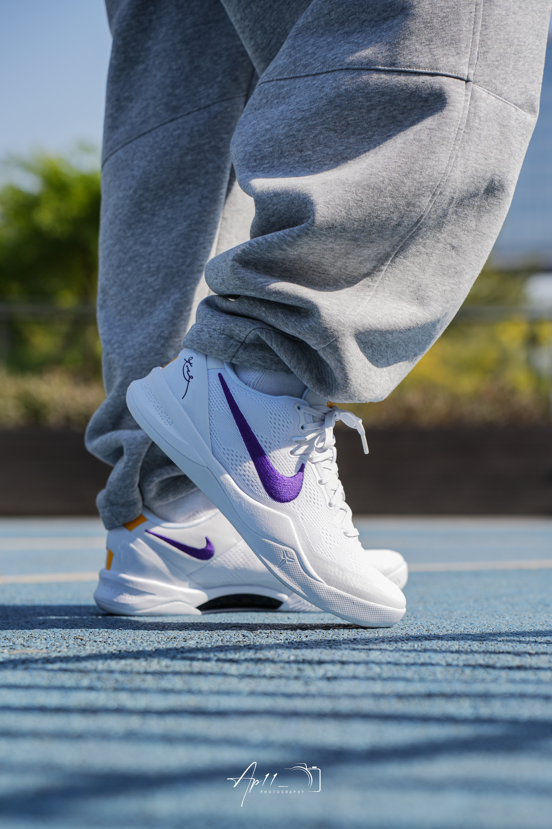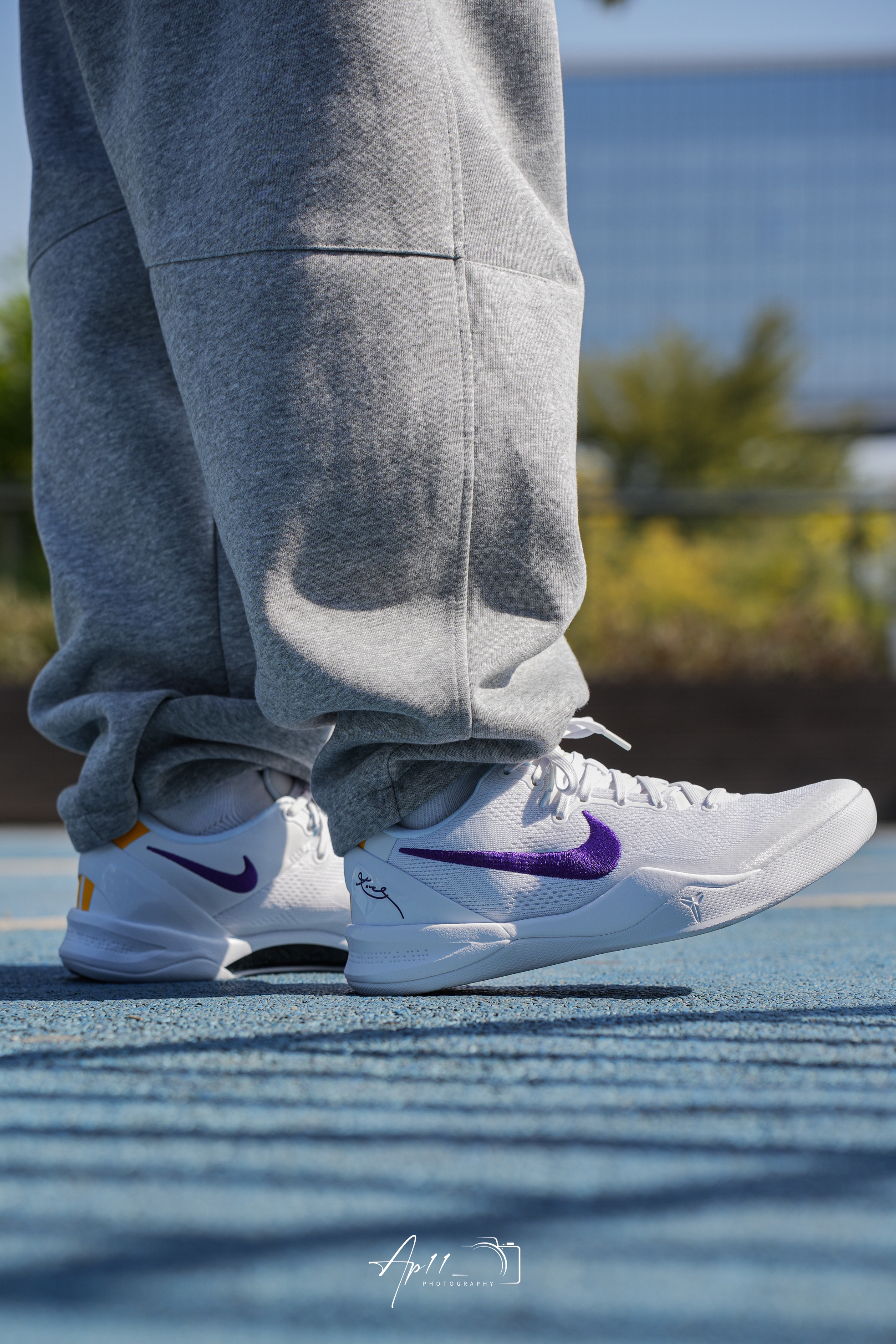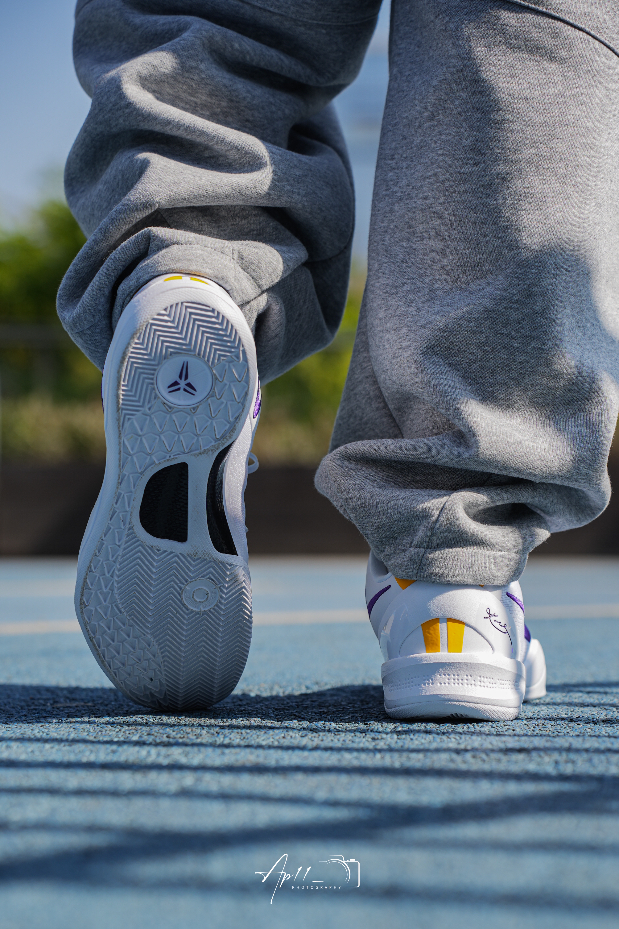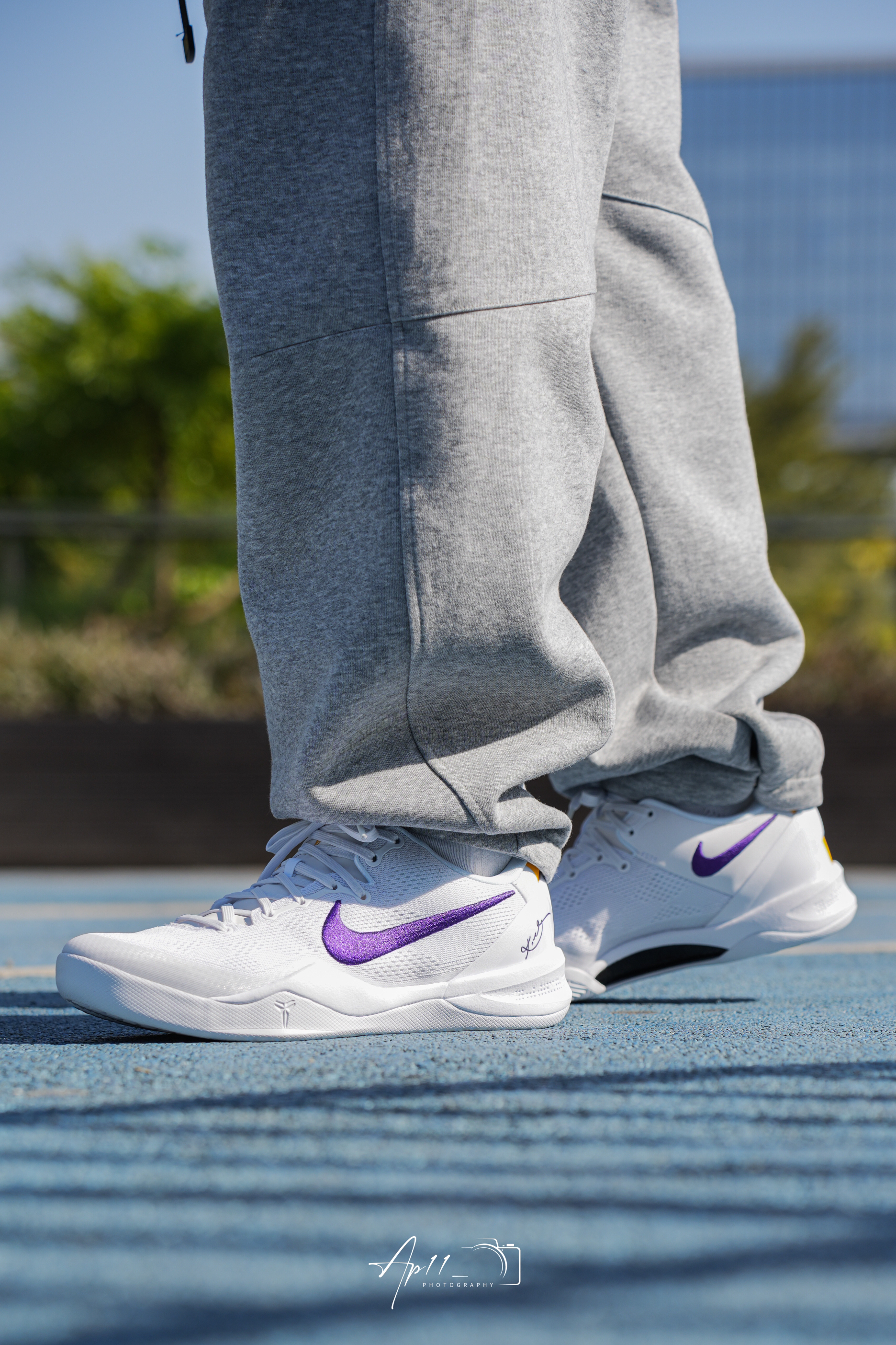 今天给大家带来这双科比8“湖人队主场”配色的上脚分享,这个配色的宗旨也是向科比湖人生涯致敬,科比在湖人征战20个赛季,带来了五座NBA总冠军,诠释了一个人一座城。主色调以白色为主,细节方面黄色、紫色来点缀。侧面印上紫色耐克的Swoosh标志,衬托白色鞋面。