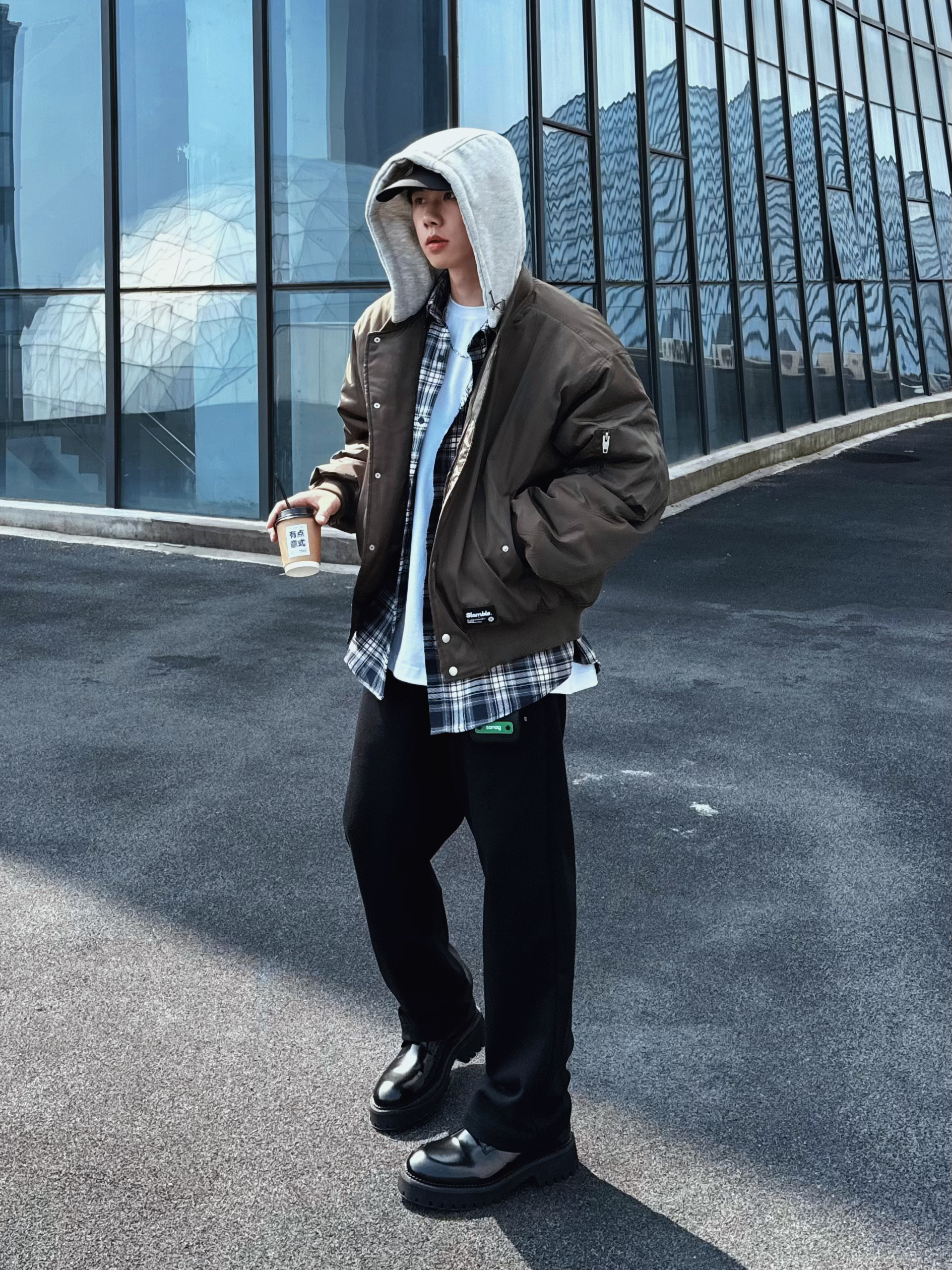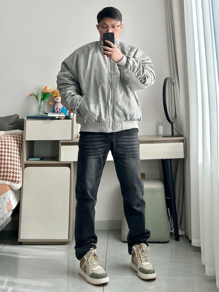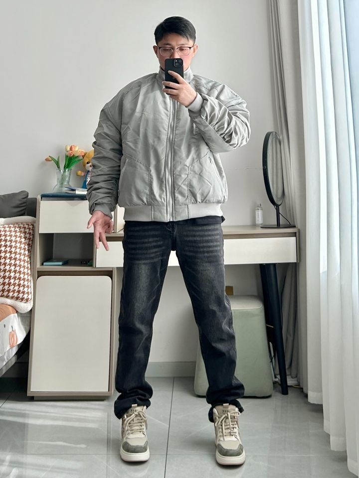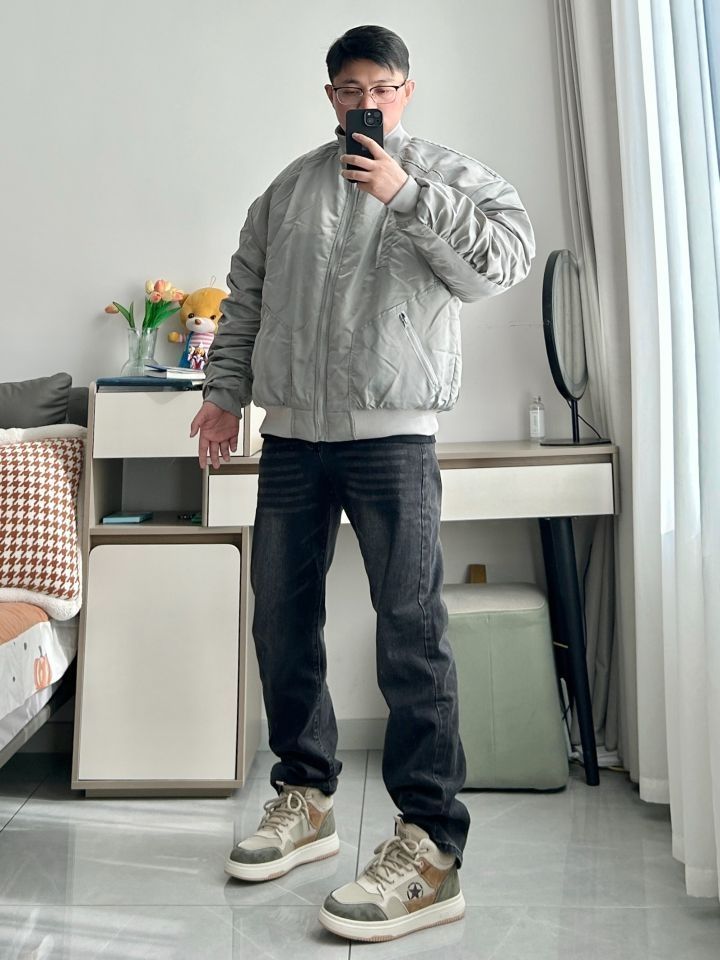 今天出门这么搭 一件新因素灰色飞行夹克棉服外套 宽松版型,上身酷感个性 加厚棉服很保暖 搭一条新因素牛仔裤 鞋子 JEEP SPIRIT 厚底高帮板鞋 加绒加厚很保暖
