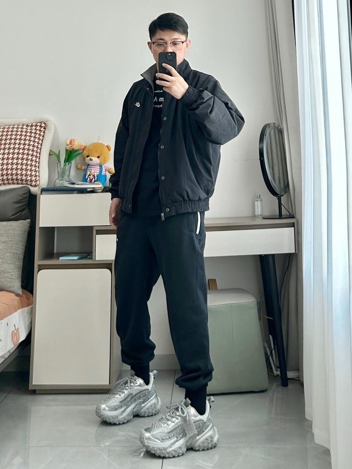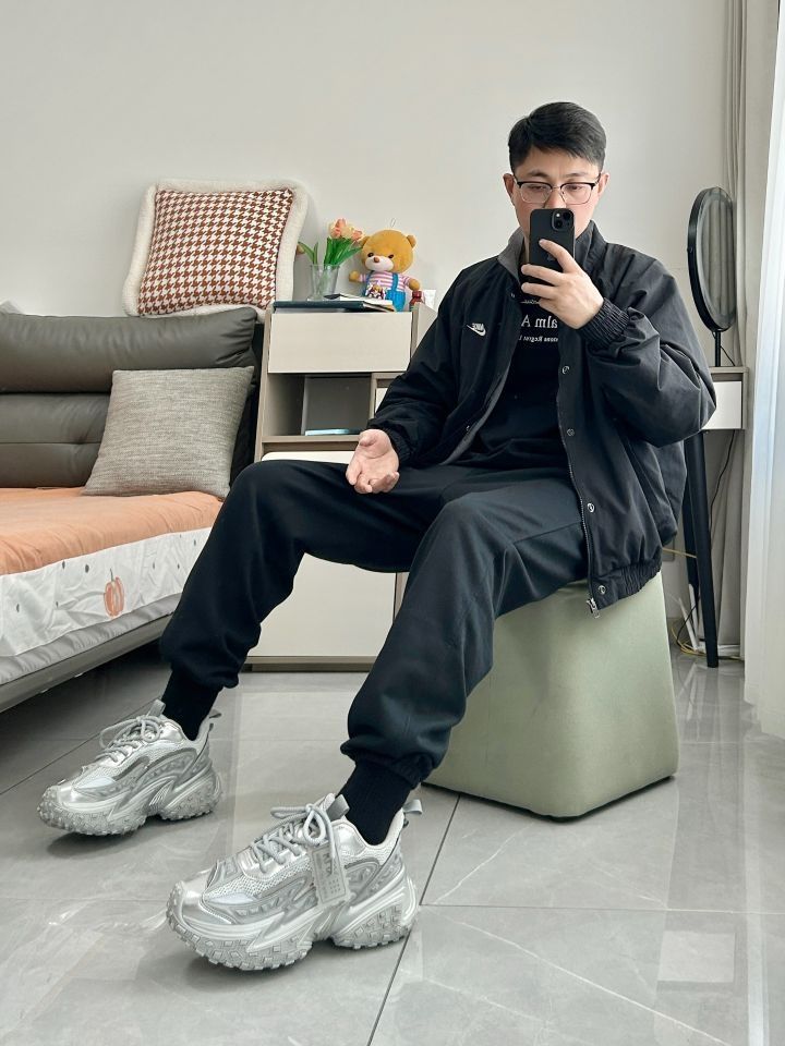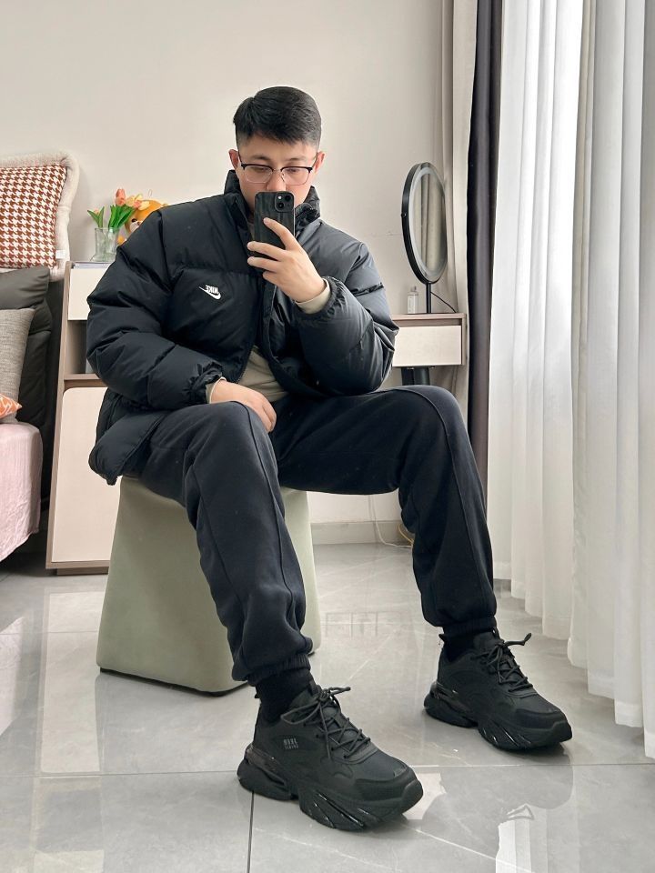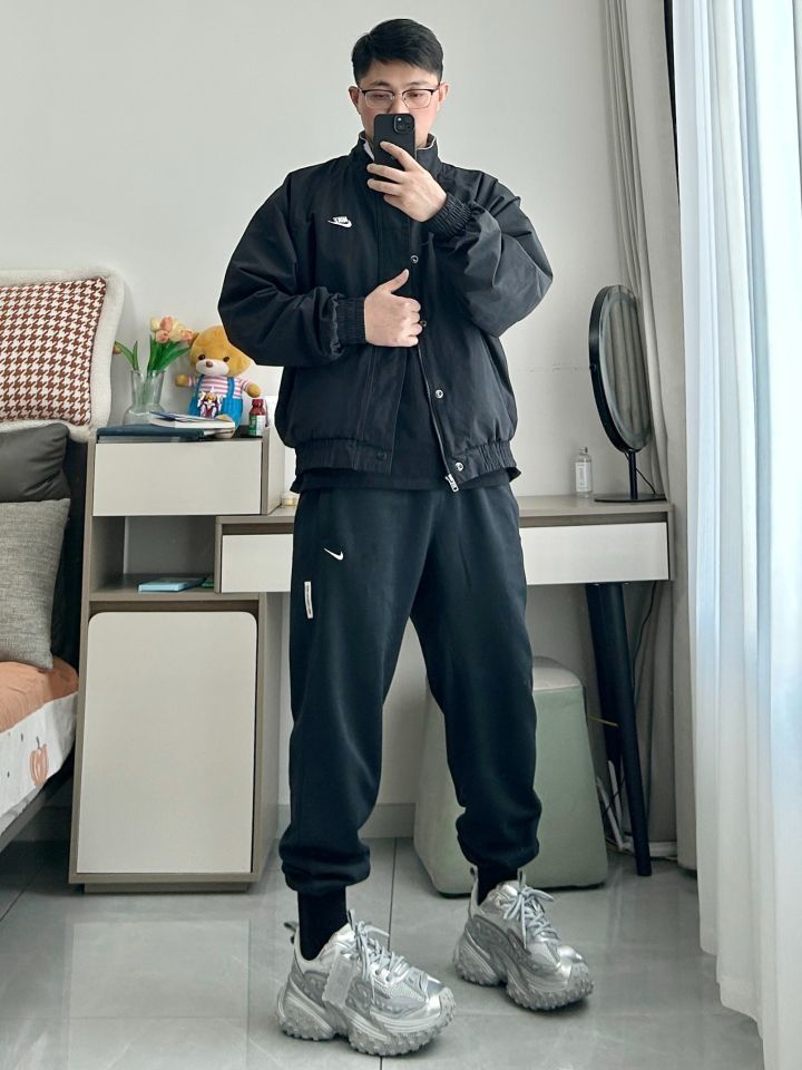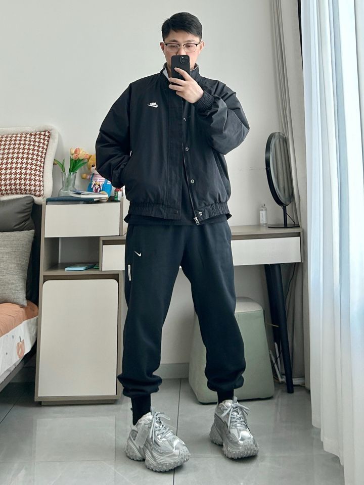 一件耐克立领夹克外套 蓬松柔软,宽松舒适保暖 搭一条耐克黑色宽松束脚裤 一双 KUX 轮胎厚底银色机能感老爹鞋 银色皮革网面鞋面,很亮眼,质感很好 上脚很好看,机能潮流酷感个性 内里柔软保暖舒适 加厚防滑耐磨鞋底,显高又舒适