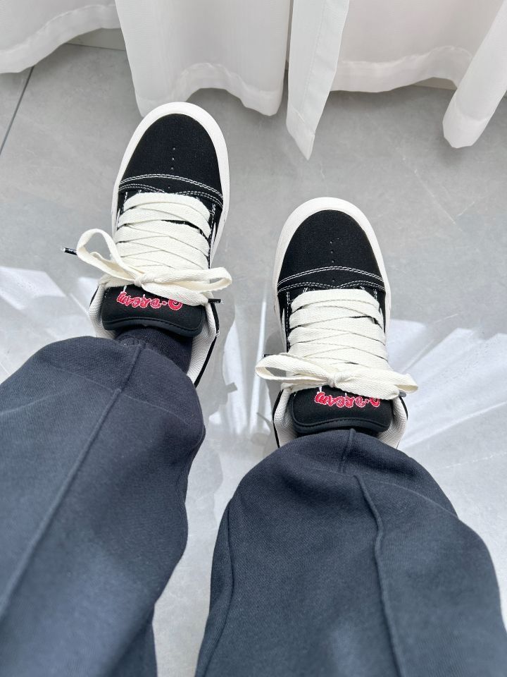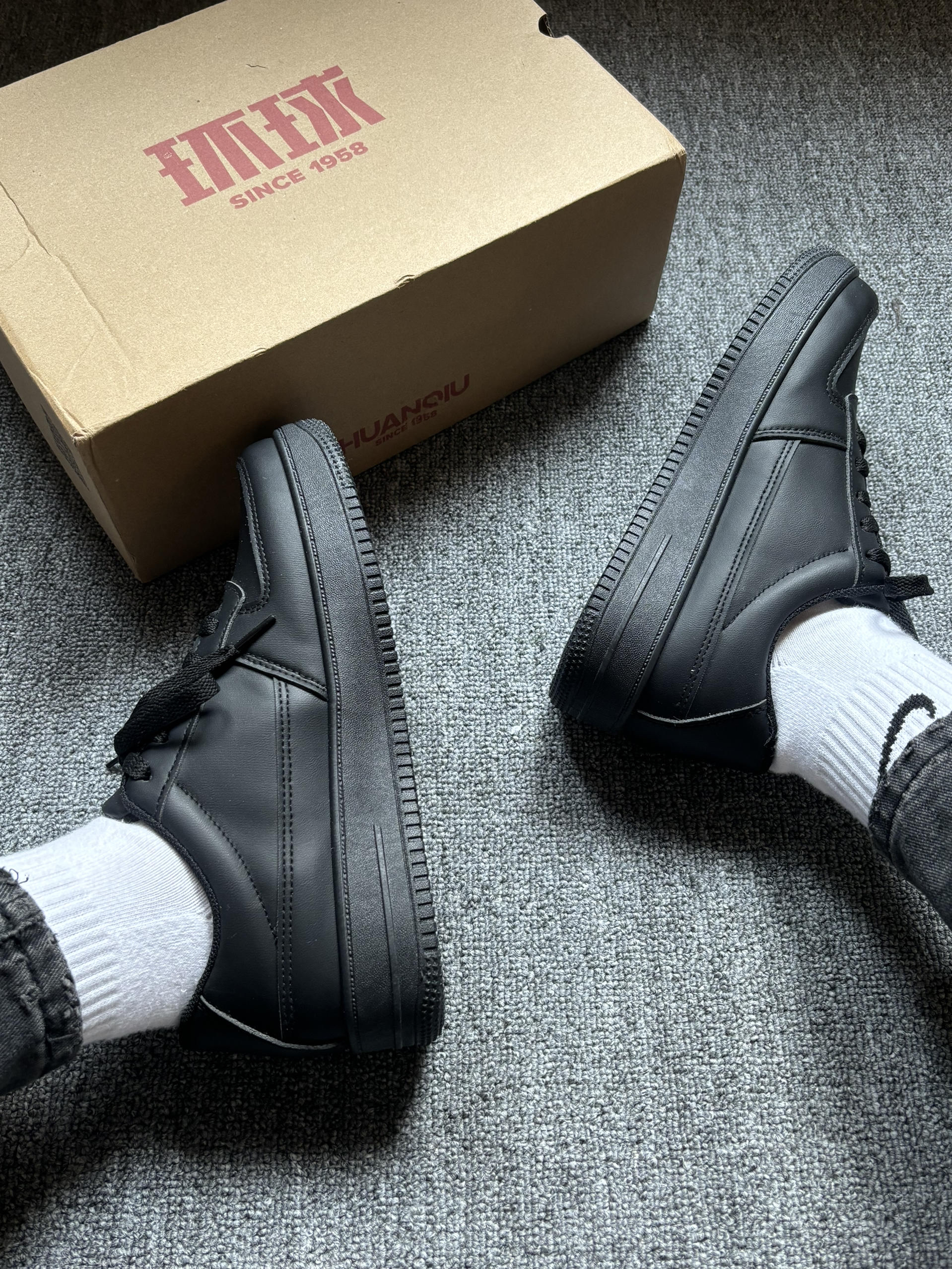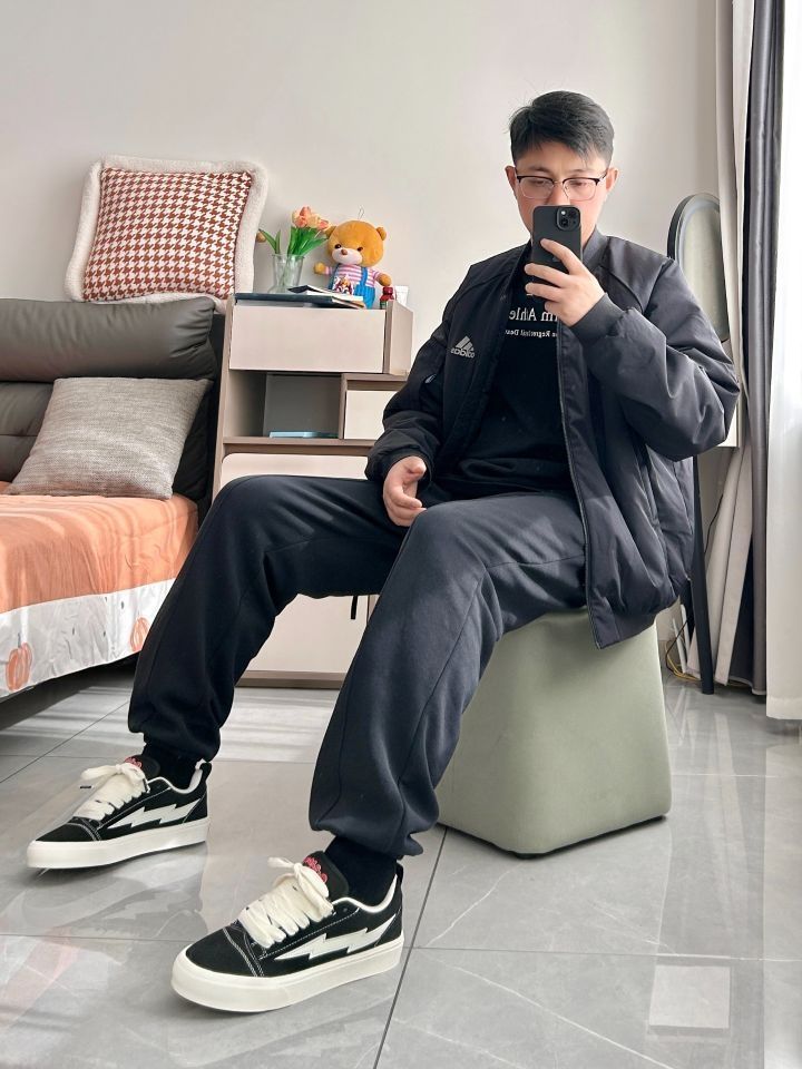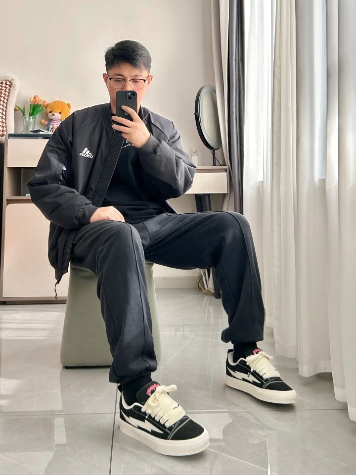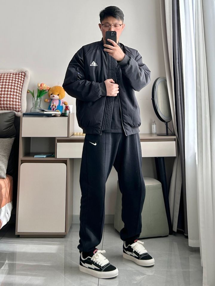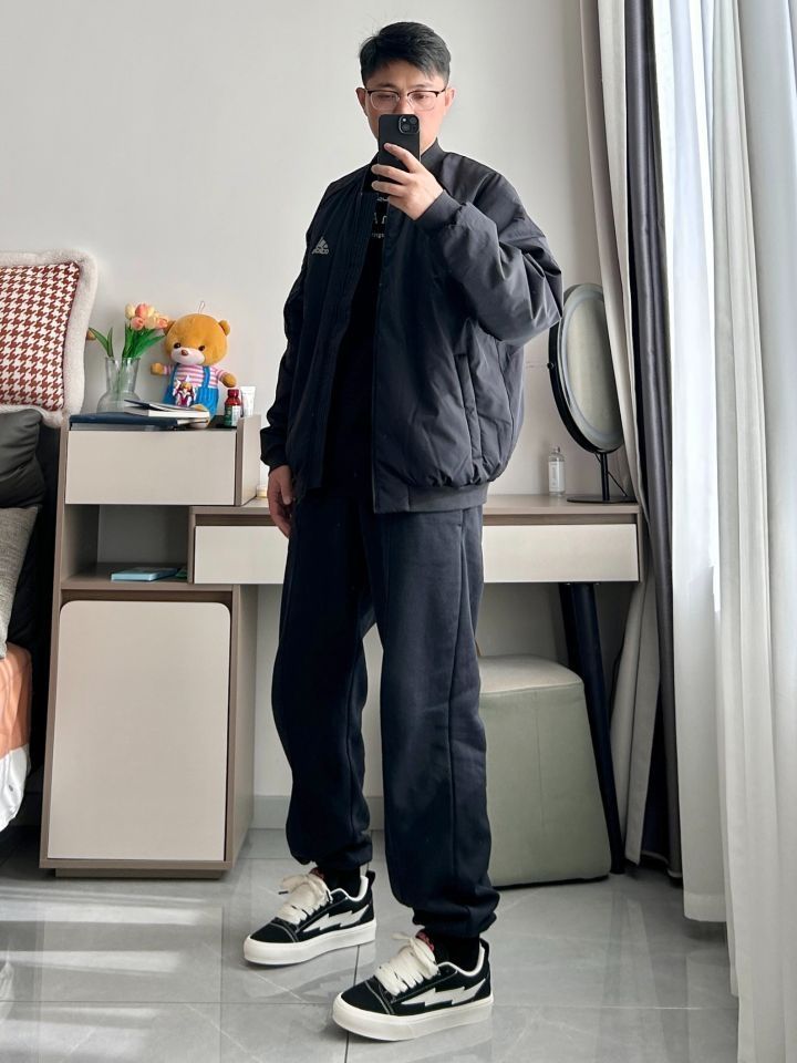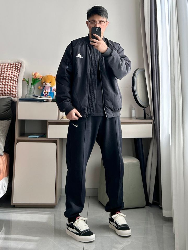 一件黑色阿迪达斯棉服飞行夹克 宽松版型很保暖 搭一条黑色耐克束脚裤 鞋子是 TINMUU 厚底低帮面包鞋板鞋 黑色帆布鞋面,质感很好 简约黑白配色,厚鞋舌酷感个性 内里加厚,冬季穿很暖和 厚底显高脚感轻便舒适 搭配运动裤很好看