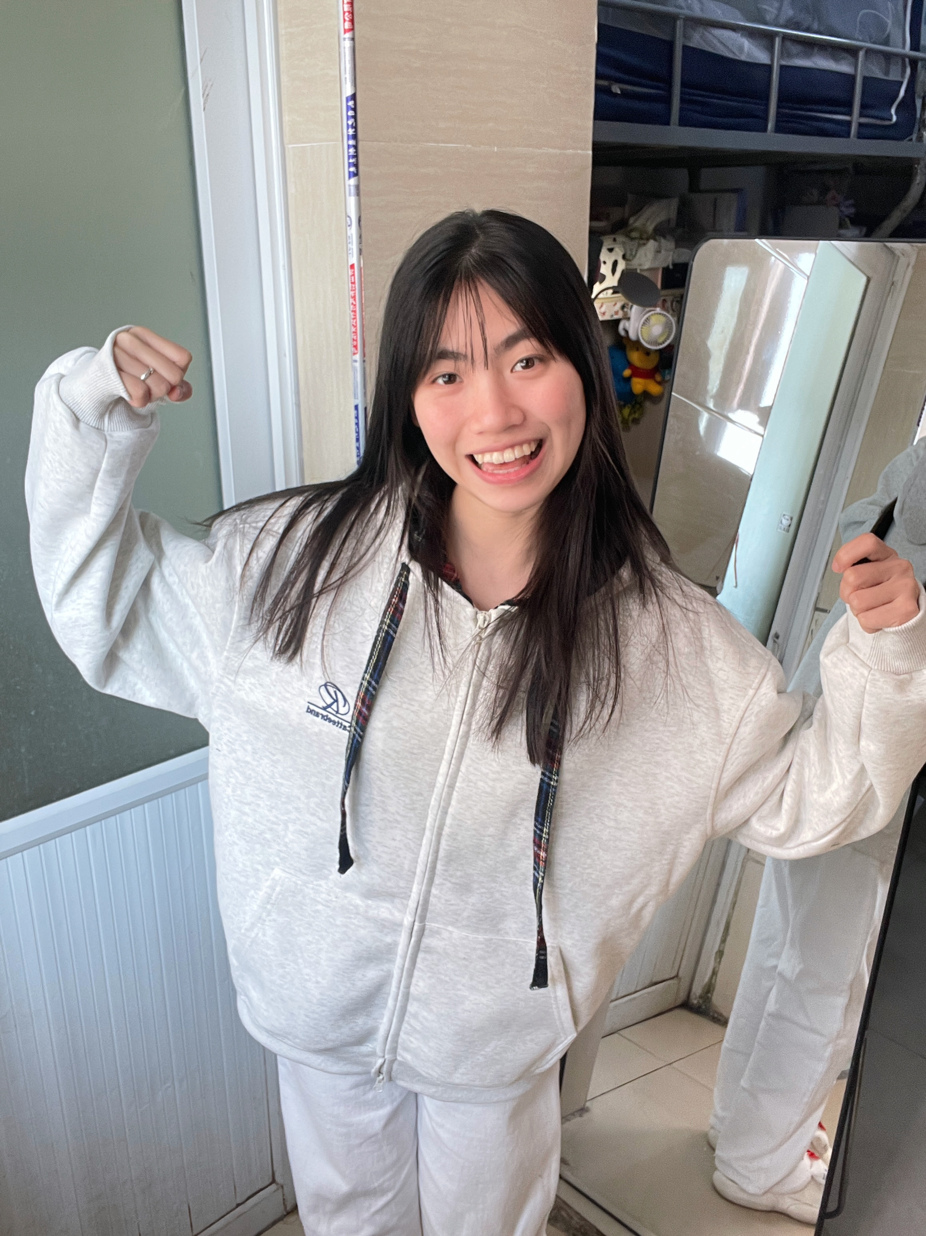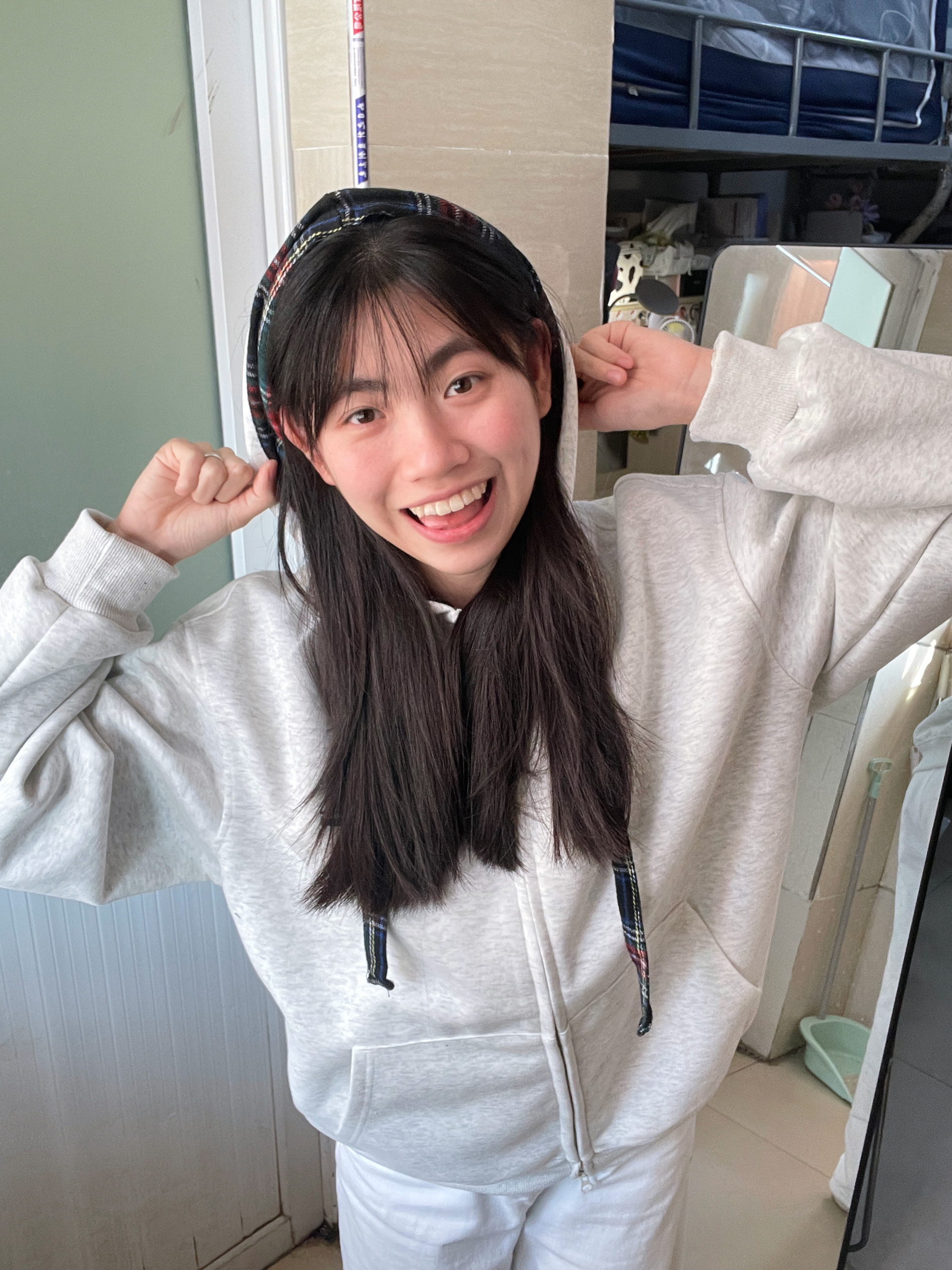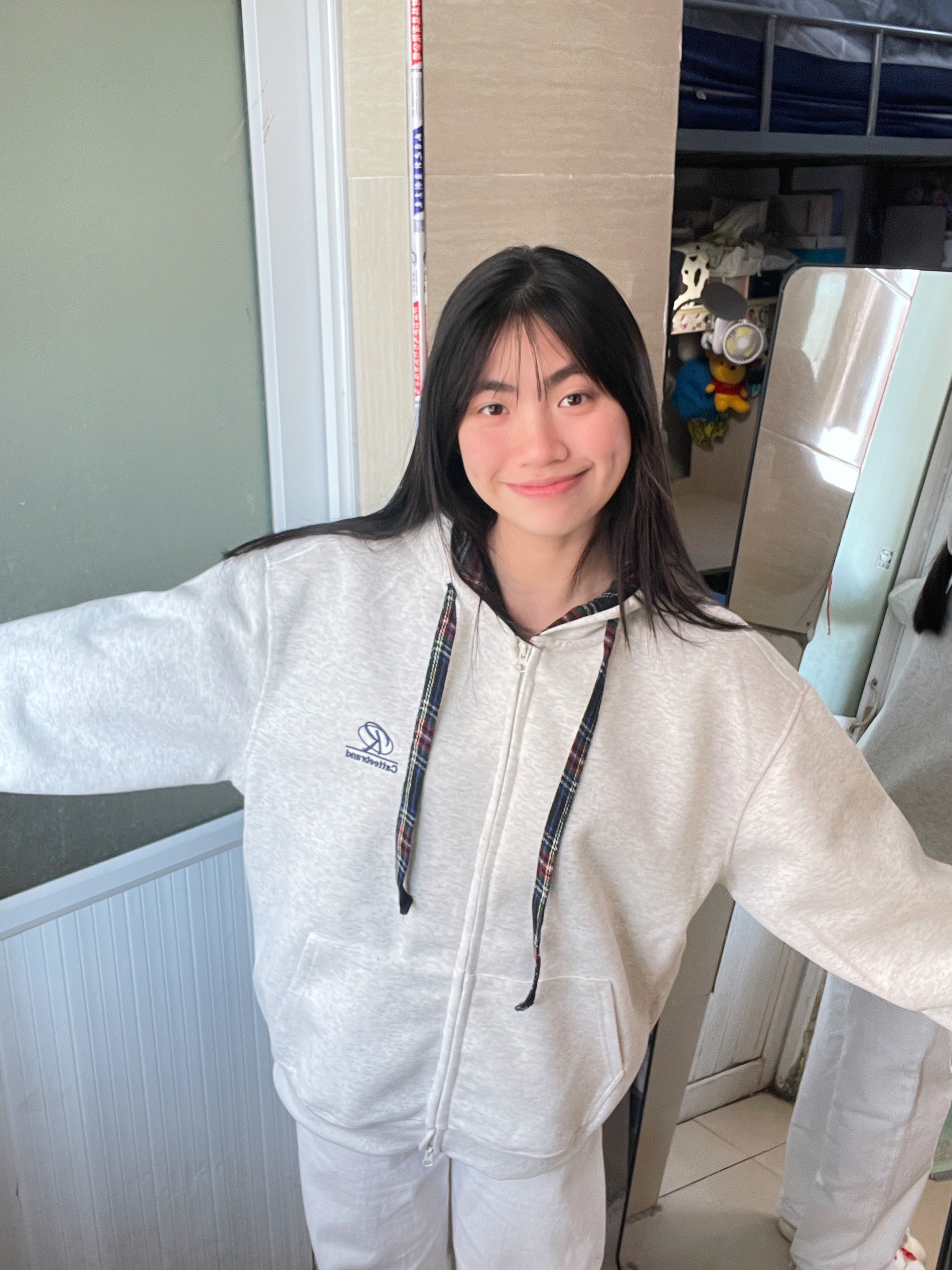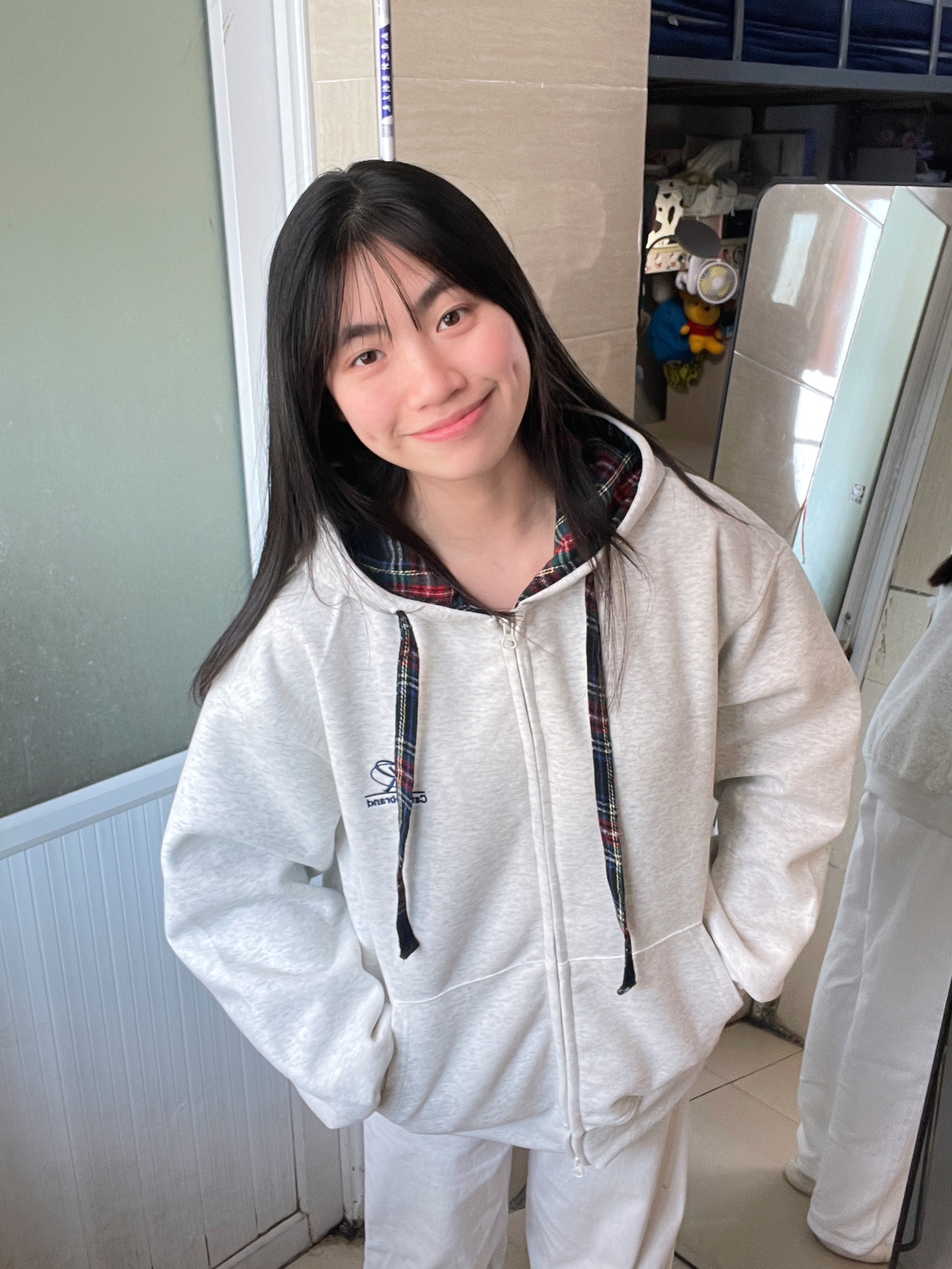 166 102穿的是L码 帽子做了彩格拼接 看起来没那么单调更有层次感了!是不加绒的哦 适合初春的时候穿呢 搭配牛仔裤或者运动裤都是很干净舒服的穿搭 想穿出cleanfit的一定要试试!!!喜欢的宝宝可以参考一下哦
