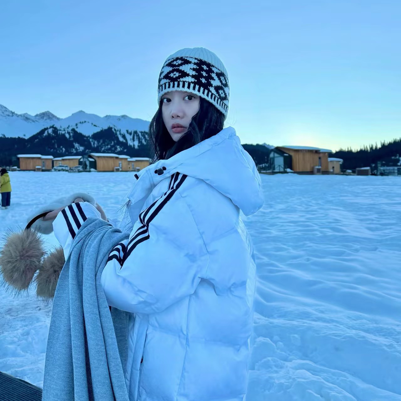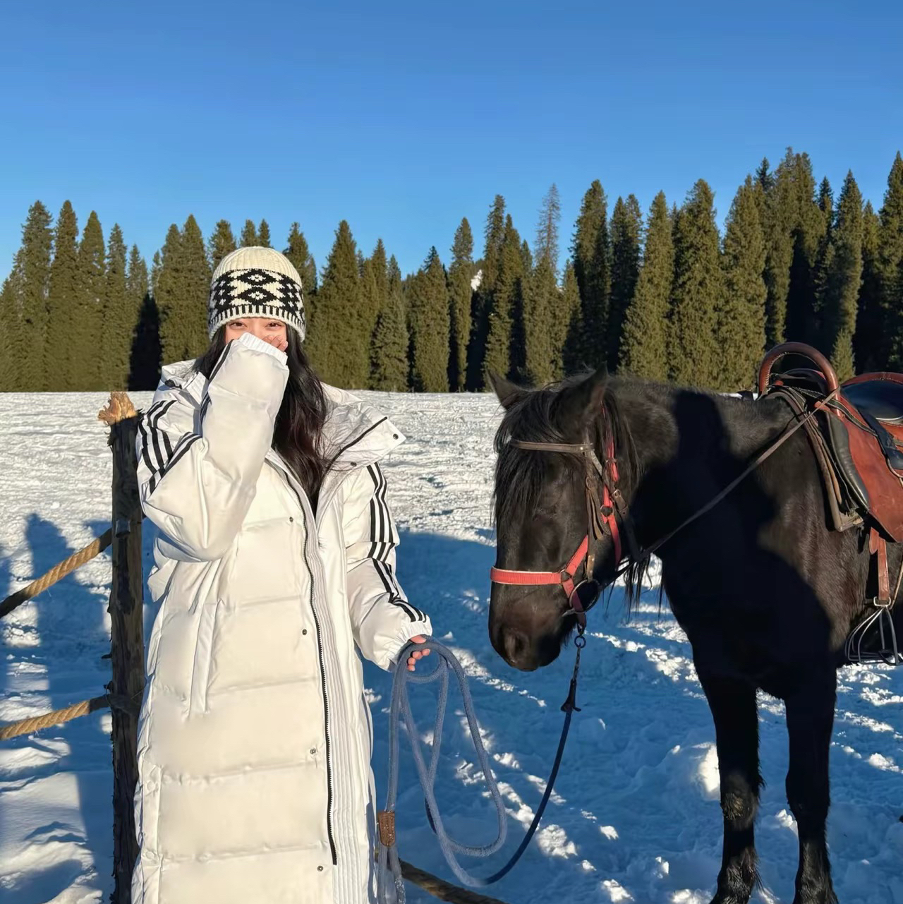 穿搭分享:在新疆的冬日,保暖是首要任务。我选择了一件长款白色羽绒服,它不仅保暖,还能在雪地里形成美丽的对比。搭配灰色运动裤和白色运动鞋,既舒适又时尚。当然,少不了一顶黑白相间的针织帽,它不仅保护我的耳朵不受寒风侵袭。新疆的冬天,是一幅壮丽的画卷。蓝天白云下,连绵的雪山和广袤的森林构成了一幅动人的景色。在这里,我不仅堆了雪人,还体验了骑马的乐趣。与当地的动物们亲密接触,让我感受到了大自然的和谐与美好...