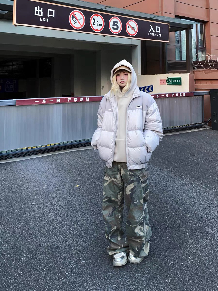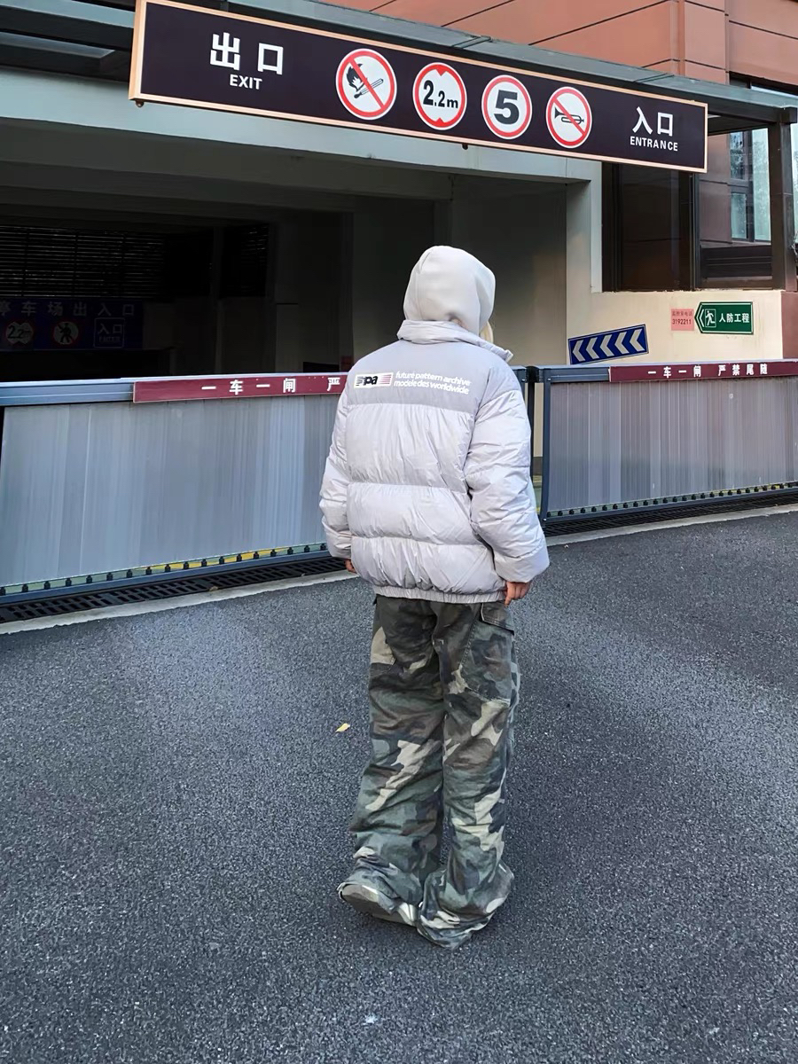 这款灰色棉服胸前和后背的旗帜字母印花,简单又好看。雾面哑光的面料看着简直不要太高级,充棉量hin足,上身也不会觉得很臃肿,冬天穿这件好暖和~下身搭配迷彩工装裤,这样一身真的绝了! (图片来自网络,侵删)