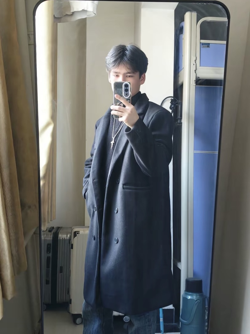 宽松风衣大衣真的是干净又帅气📋 搭配蓝色牛仔裤氛围感不就来了嘛 大衣面料是防羊毛加厚的,摸起来很舒服 我个人觉得不扣扣子比较好看一点☺️ 大衣也是不压个子哦@Dai菠罗🪆