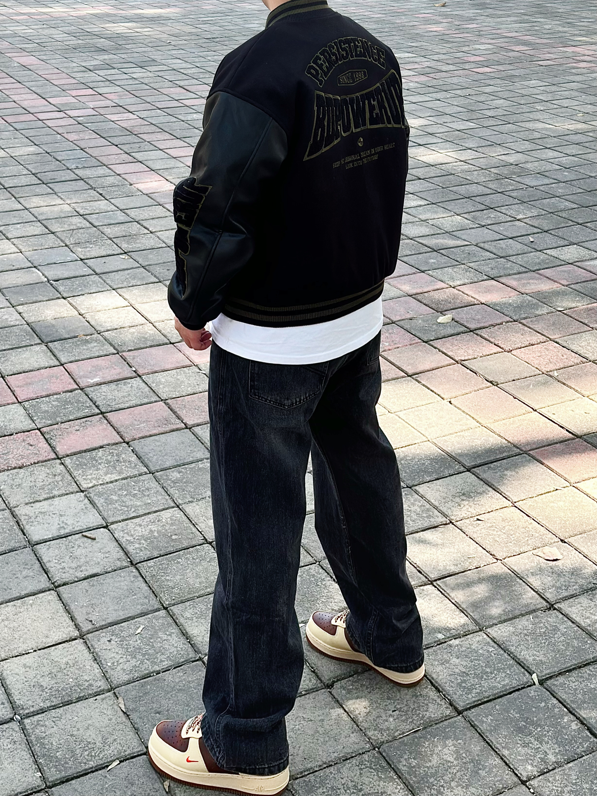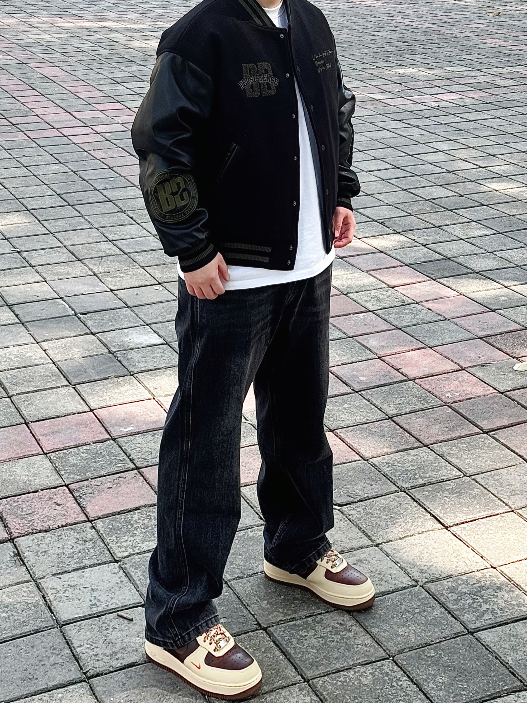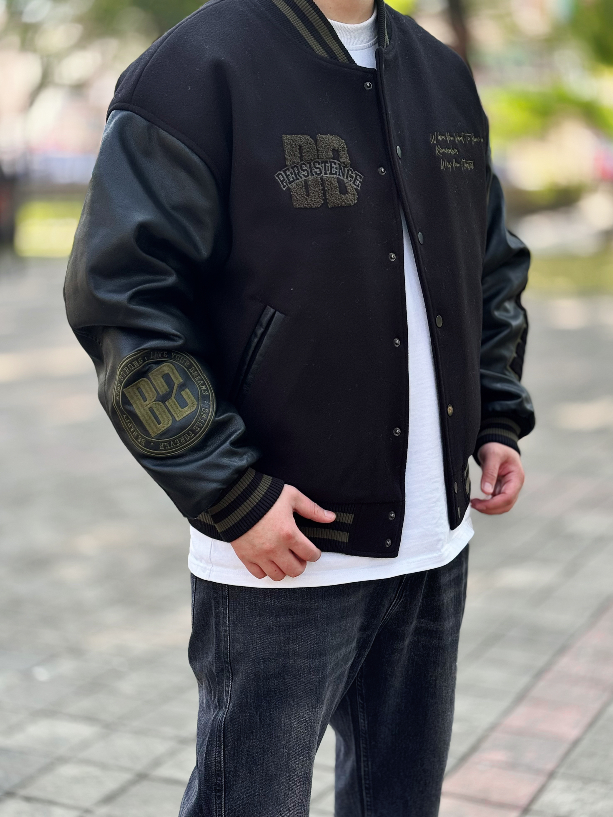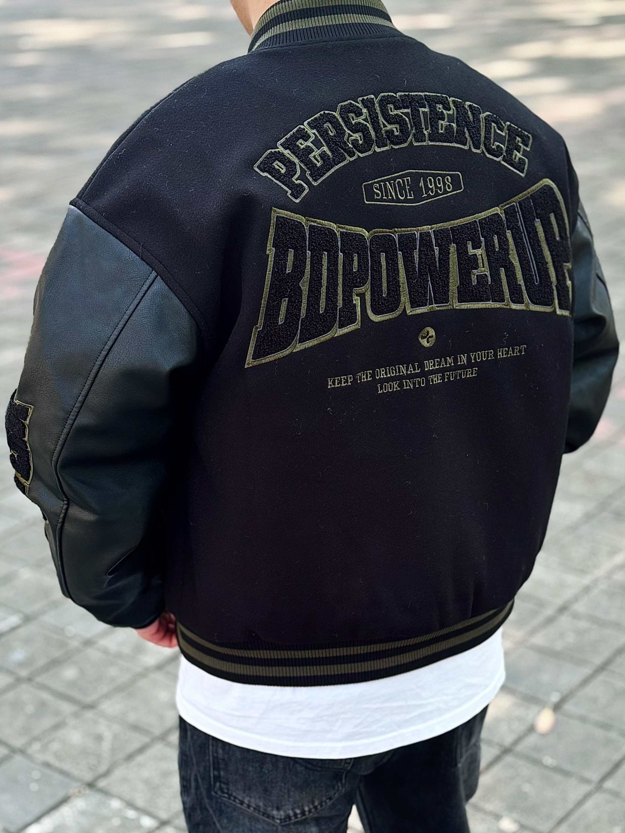 棒球服永远不会出错 一穿一个不吱声 !! BDPOWERUP 复古拼接pu皮棒球棉服 版型很硬挺 前后的刺绣logo也很有质感 内里加厚 抗风又保暖 整体看起来很硬朗 配上一条做旧水洗黑牛仔裤和一双板鞋 这么穿想不帅都很难 !! 身高丨体重丨尺码 : 178丨90kg丨L(版型偏大)