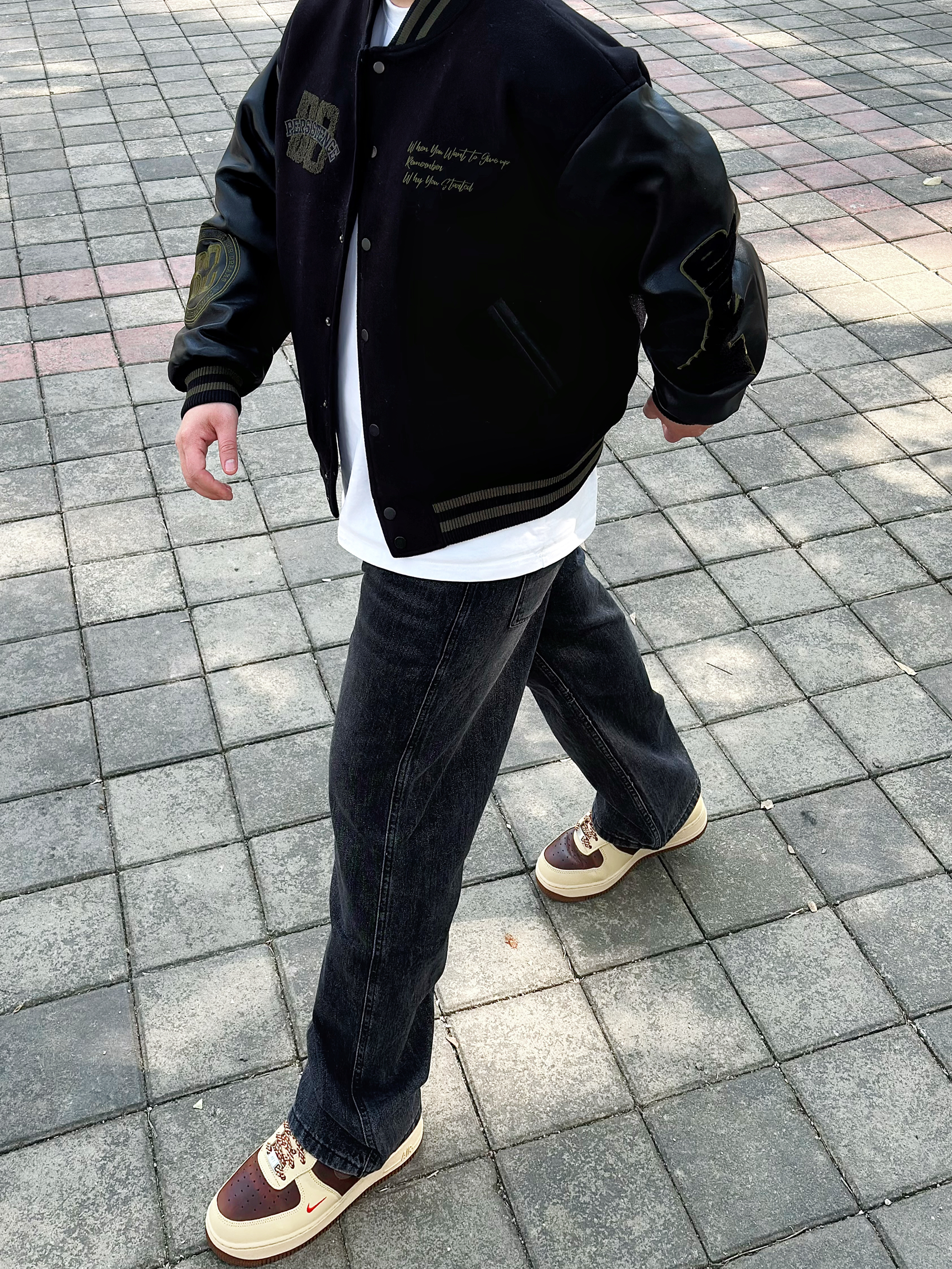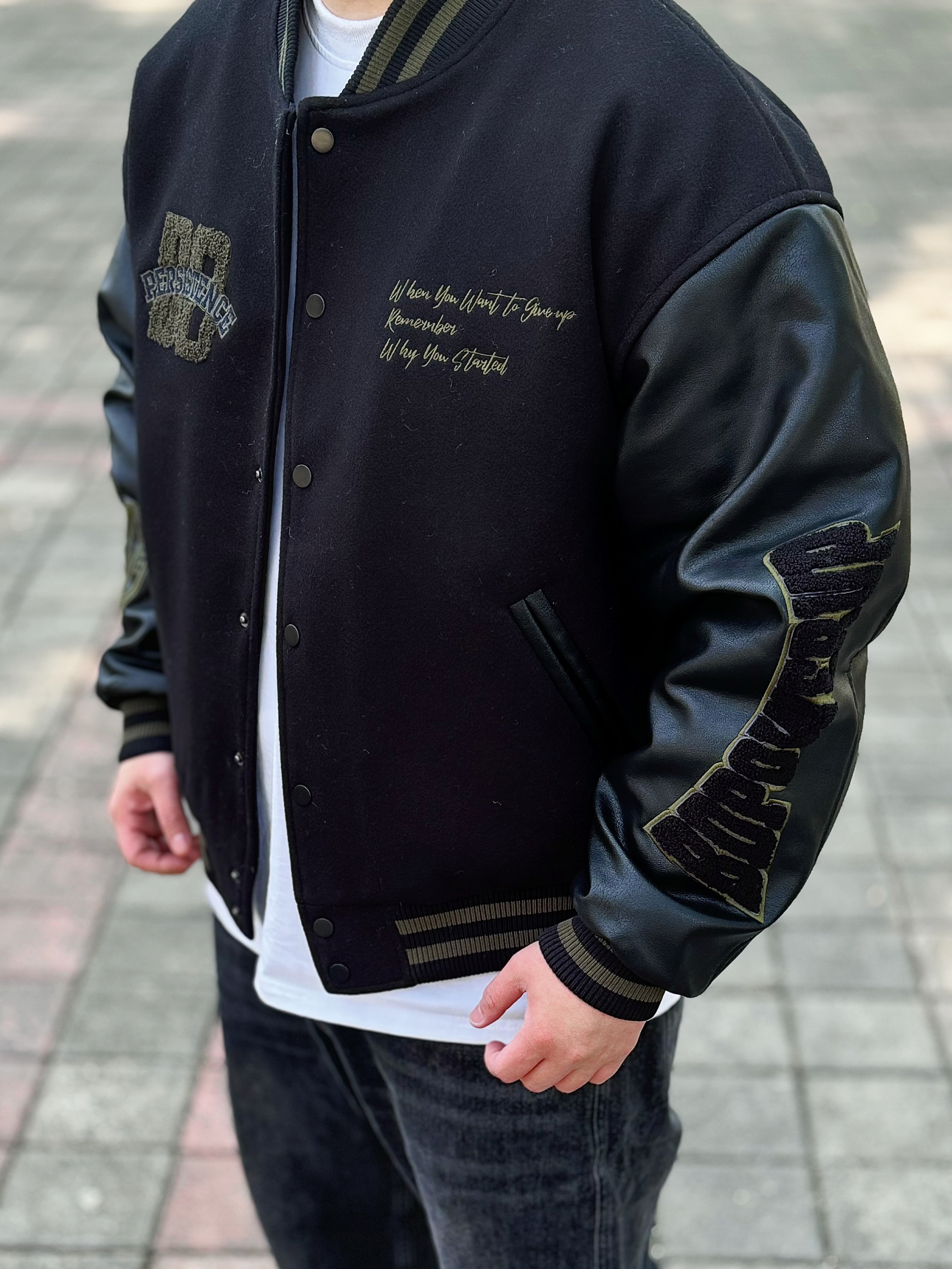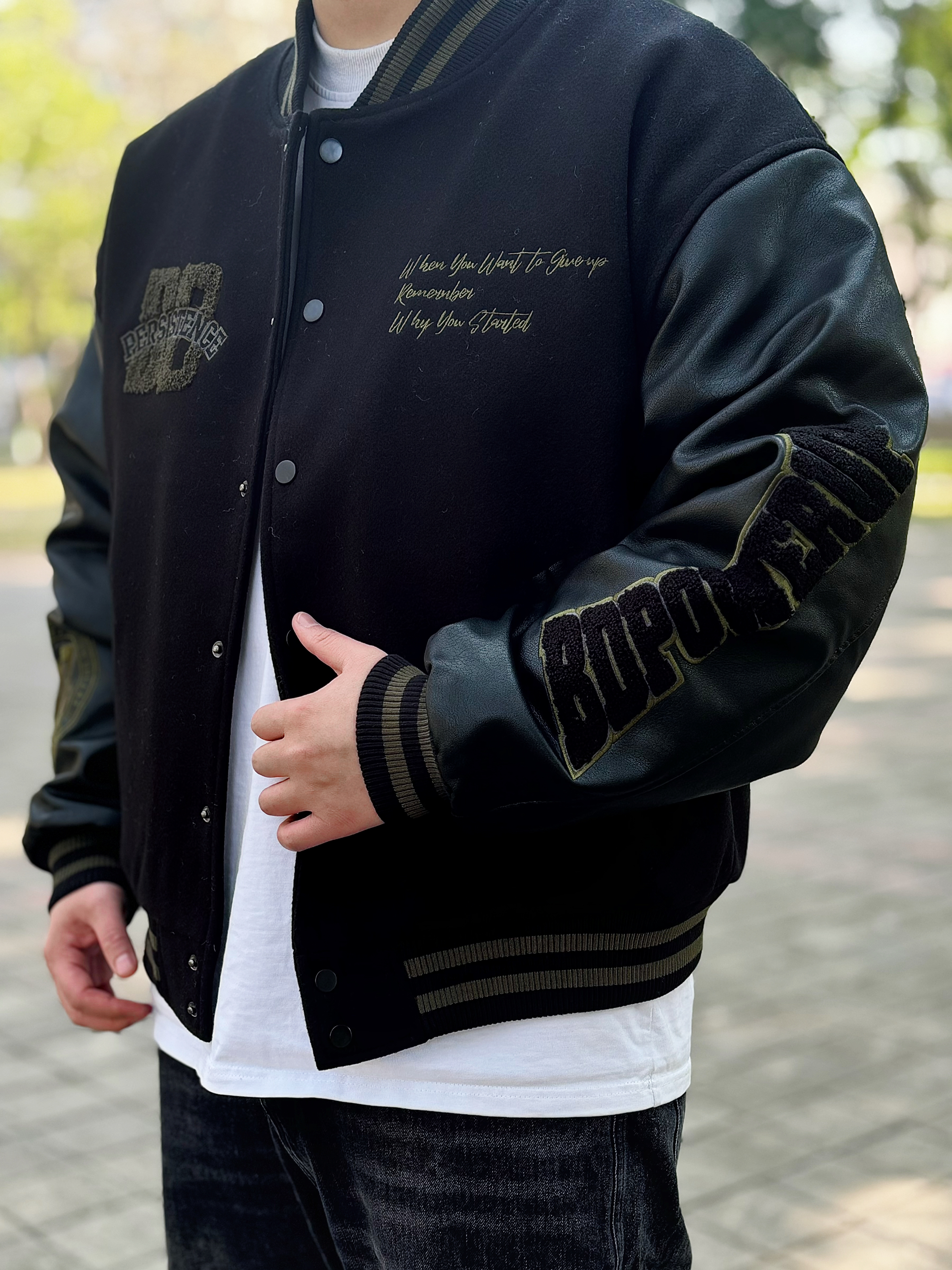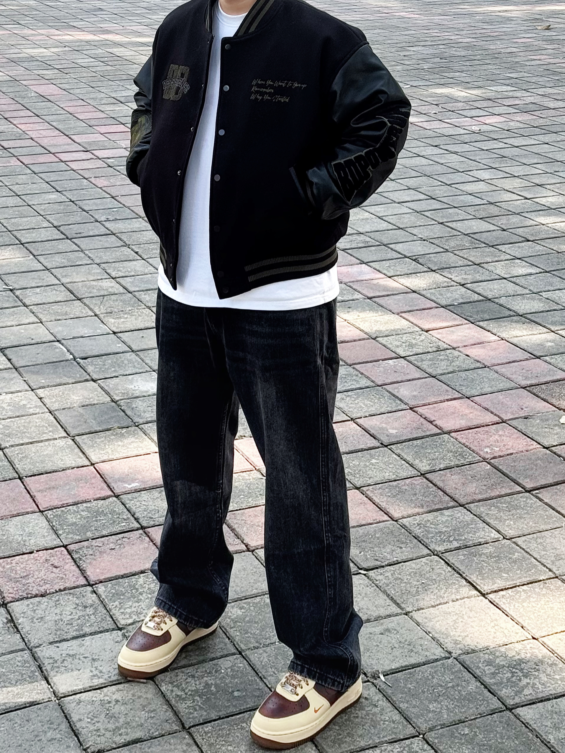棒球服永远不会出错 一穿一个不吱声 !! BDPOWERUP 复古拼接pu皮棒球棉服 版型很硬挺 前后的刺绣logo也很有质感 内里加厚 抗风又保暖 整体看起来很硬朗 配上一条做旧水洗黑牛仔裤和一双板鞋 这么穿想不帅都很难 !! 身高丨体重丨尺码 : 178丨90kg丨L(版型偏大)