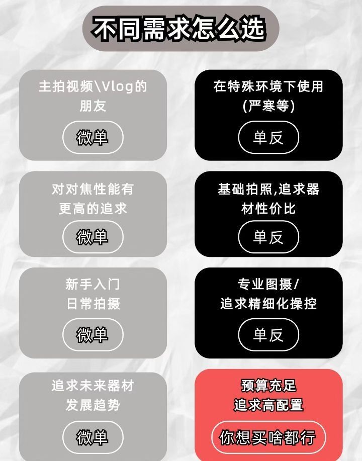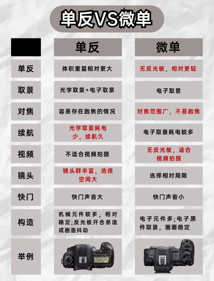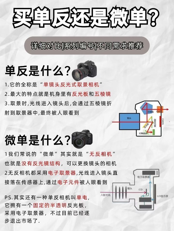 微单、单反怎么区分~今天就来给大家科普下,顺便聊聊应该怎么挑到一台合适自己的单反or微单🌟单反和微单的定义📷单反①它的全称是“单镜头反光式取景相机”②特点就是机身里有反光板和五棱镜③取景时,光线进入镜头后,会通过五棱镜折射到取景器中,然后被人眼看到📷微单①我们常说的“微单”其实就是“无反相机”,也就是没有反光镜结构,可以更换镜头的相机②无反相机都采用电子取景器,让光线进入镜头,直接落在传感器上,通...