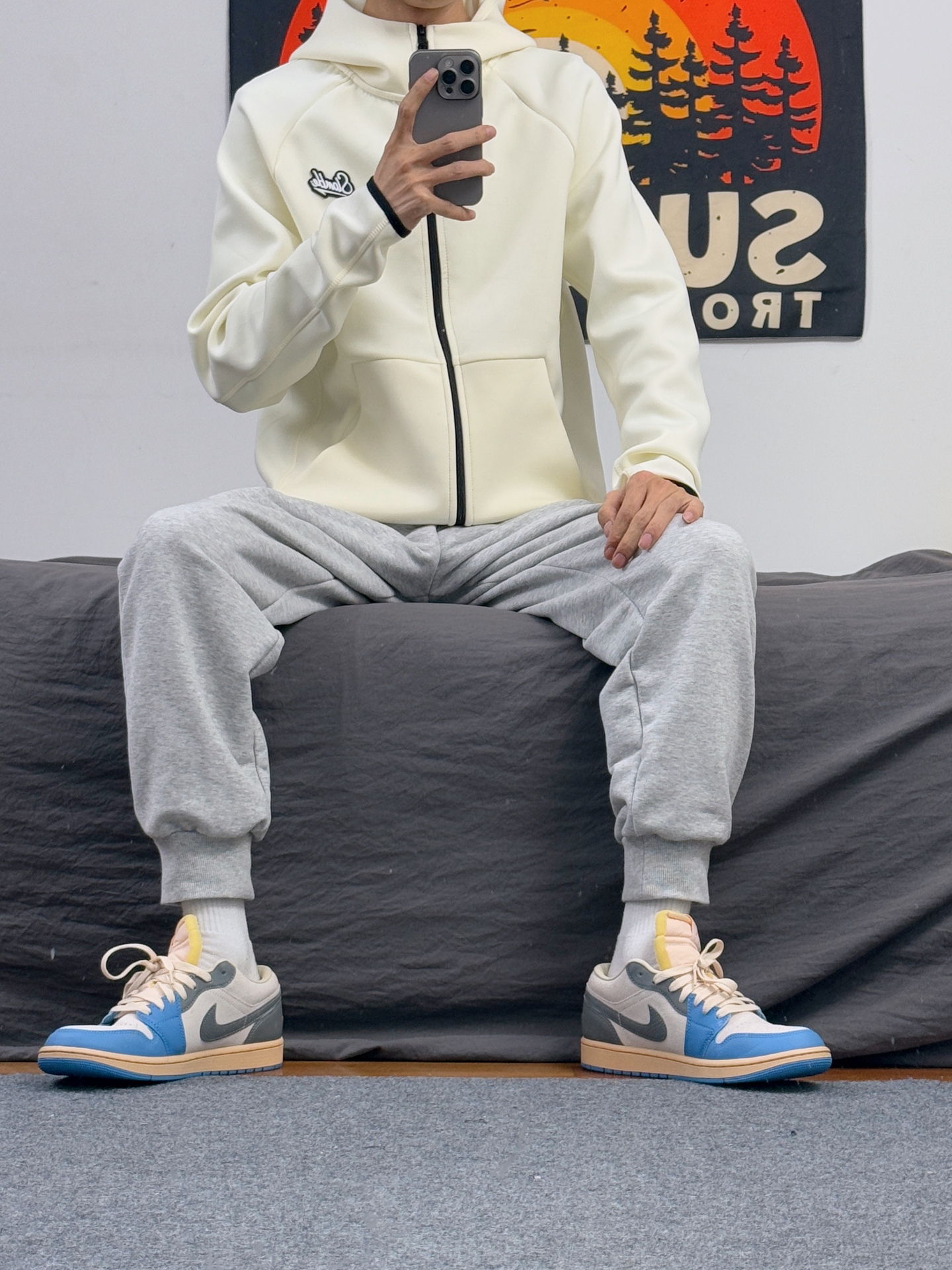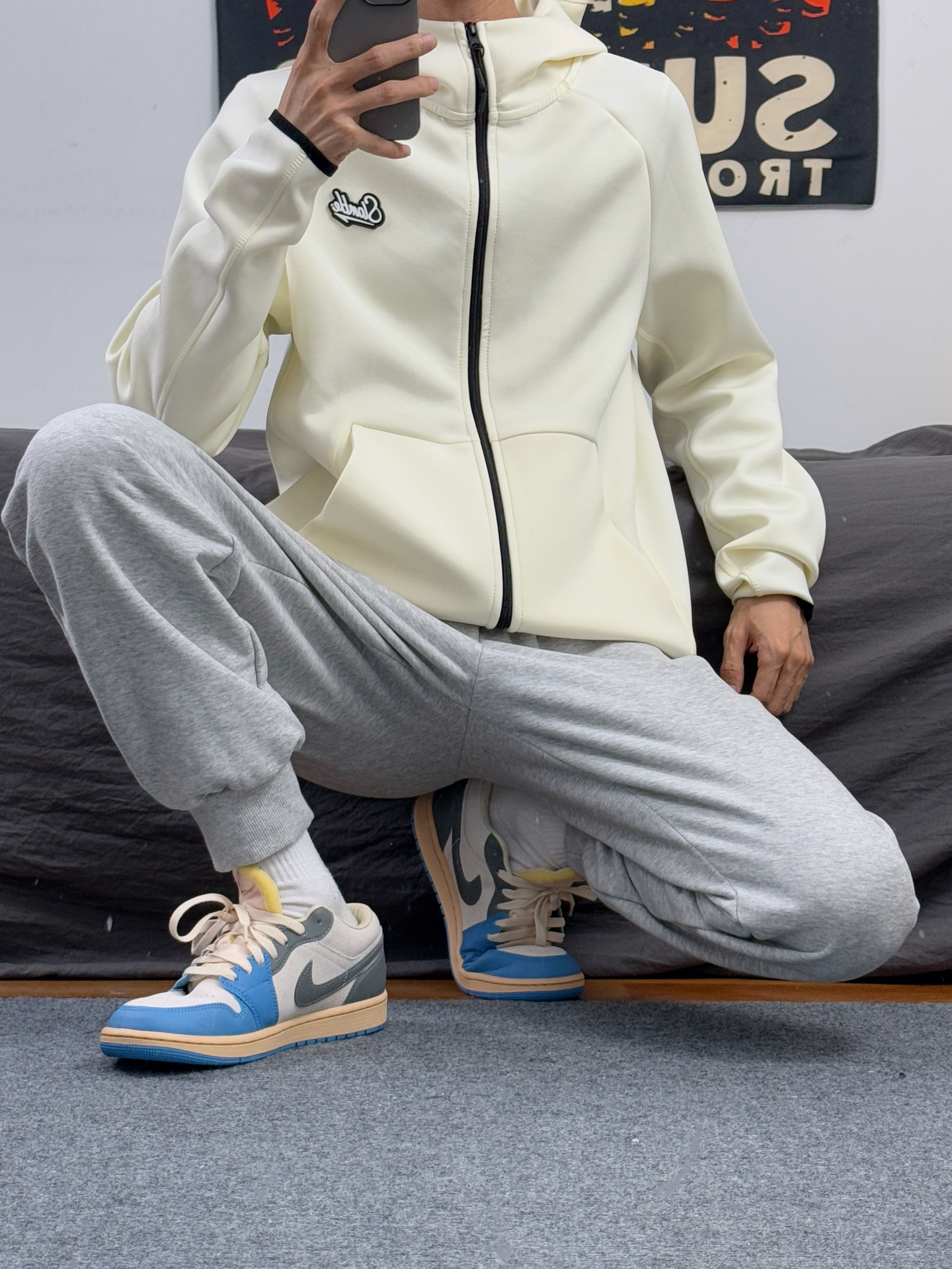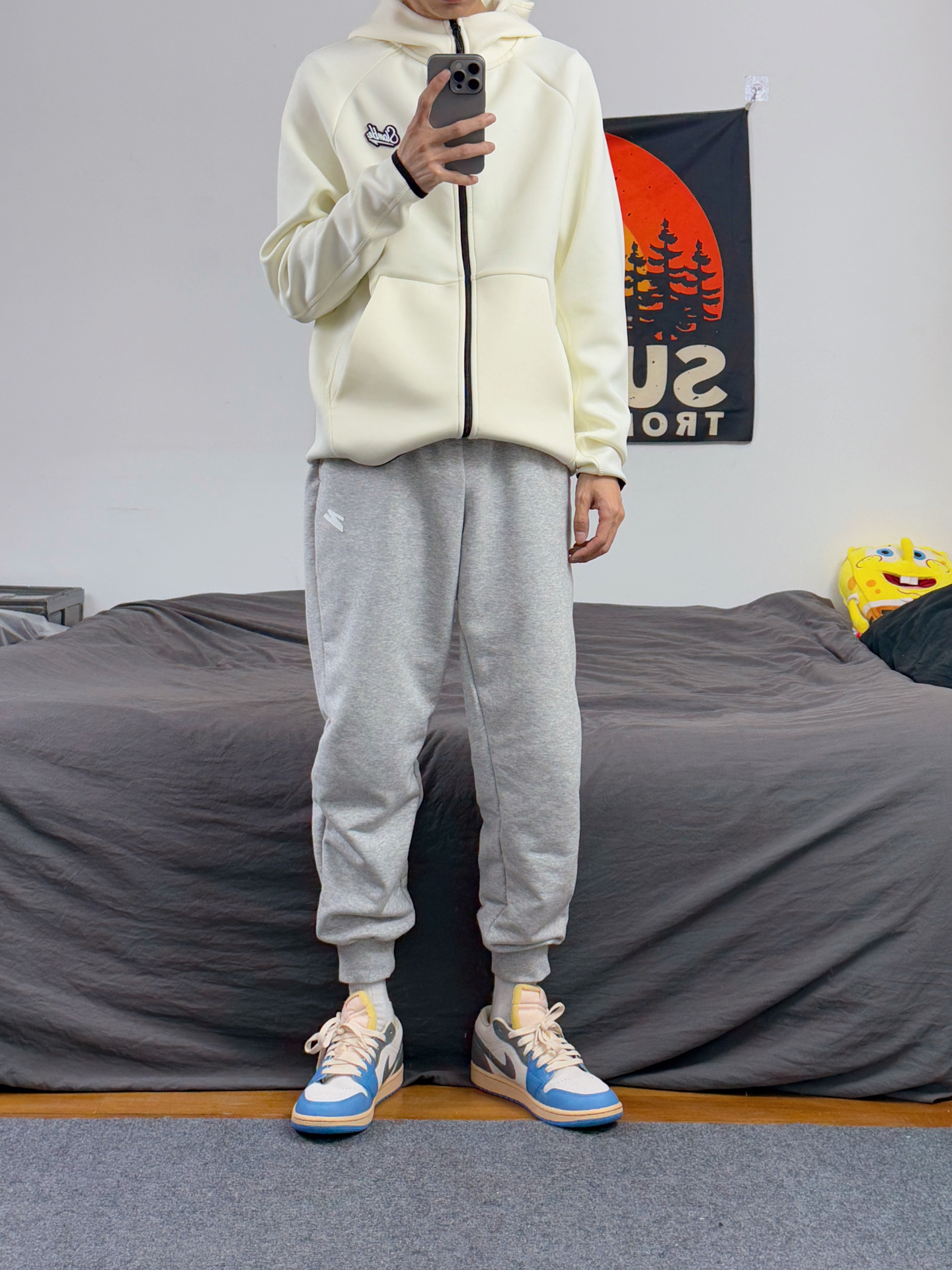 身高174体重48kg 今日上身 长袖卫衣+束腿裤+aj1蓝灰 👔是 #slamble 家的连帽卫衣 简约纯色拉链设计 胸口有小logo 上身还蛮百搭的 不管是日常还是运动穿都可以 上身m码 👖搭配了一条灰色束腿裤 美式复古风格 束腿设计 上身特别显得腿长 👟是aj1蓝灰 简约灰色穿搭搭配一双撞色鞋 上脚就特别吸引眼球 #男生冬季穿搭OOTD #宝藏卫衣分享 #Slamble #校园少年感...