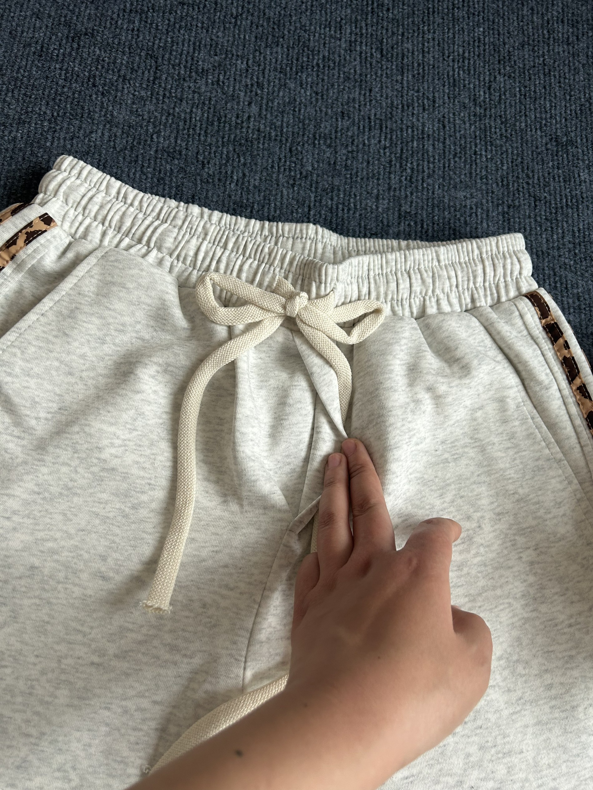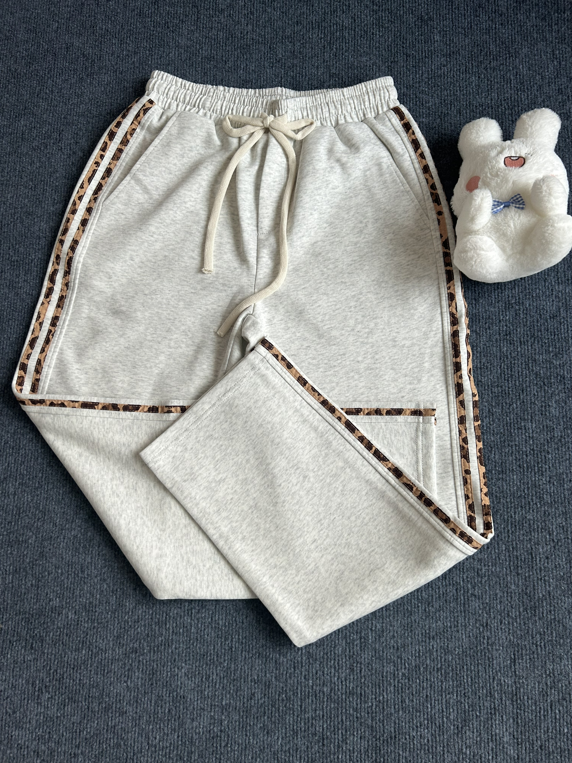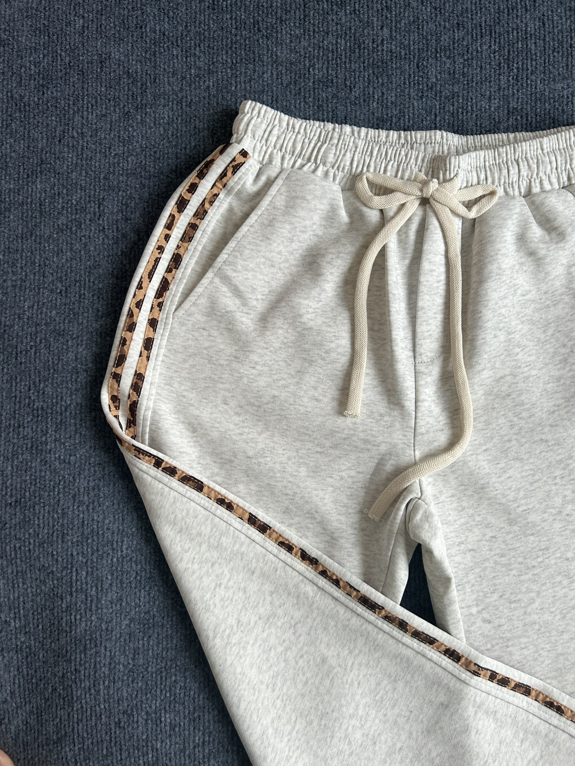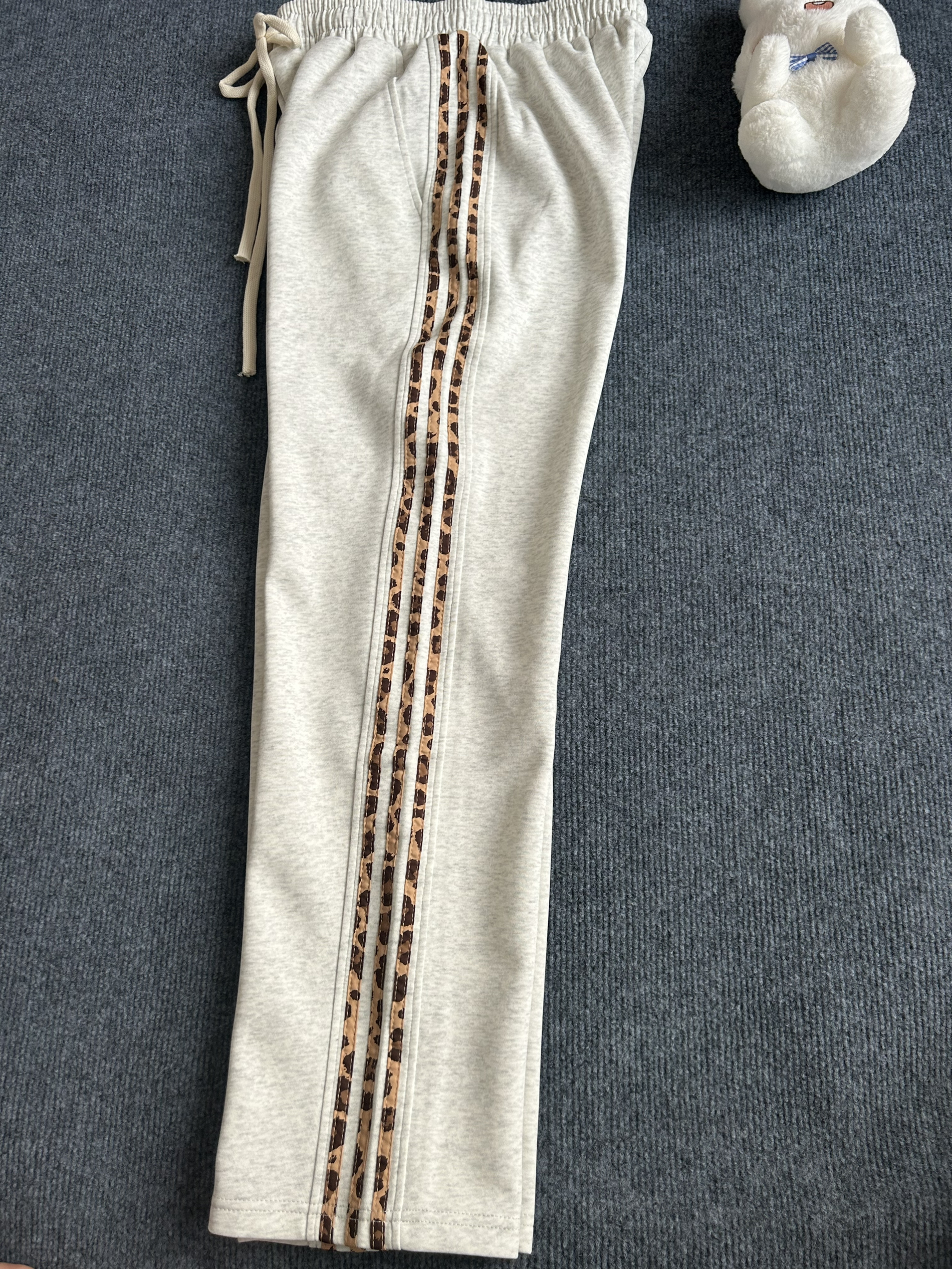 这是一款美式复古条纹直筒休闲长裤,腰部有松紧,采用了空心粗腰绳设计,可调节松紧,避免裤子松垮掉落,侧边是选用了好看的豹纹设计,和裤子搭配在一起真的很协调,穿在身上的垂度可以的,一点也不臃肿哦,期待穿着这件衣服出去逛街