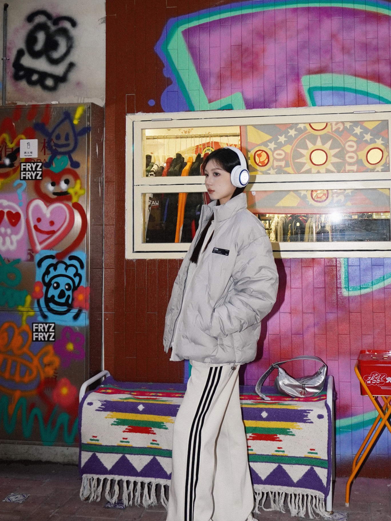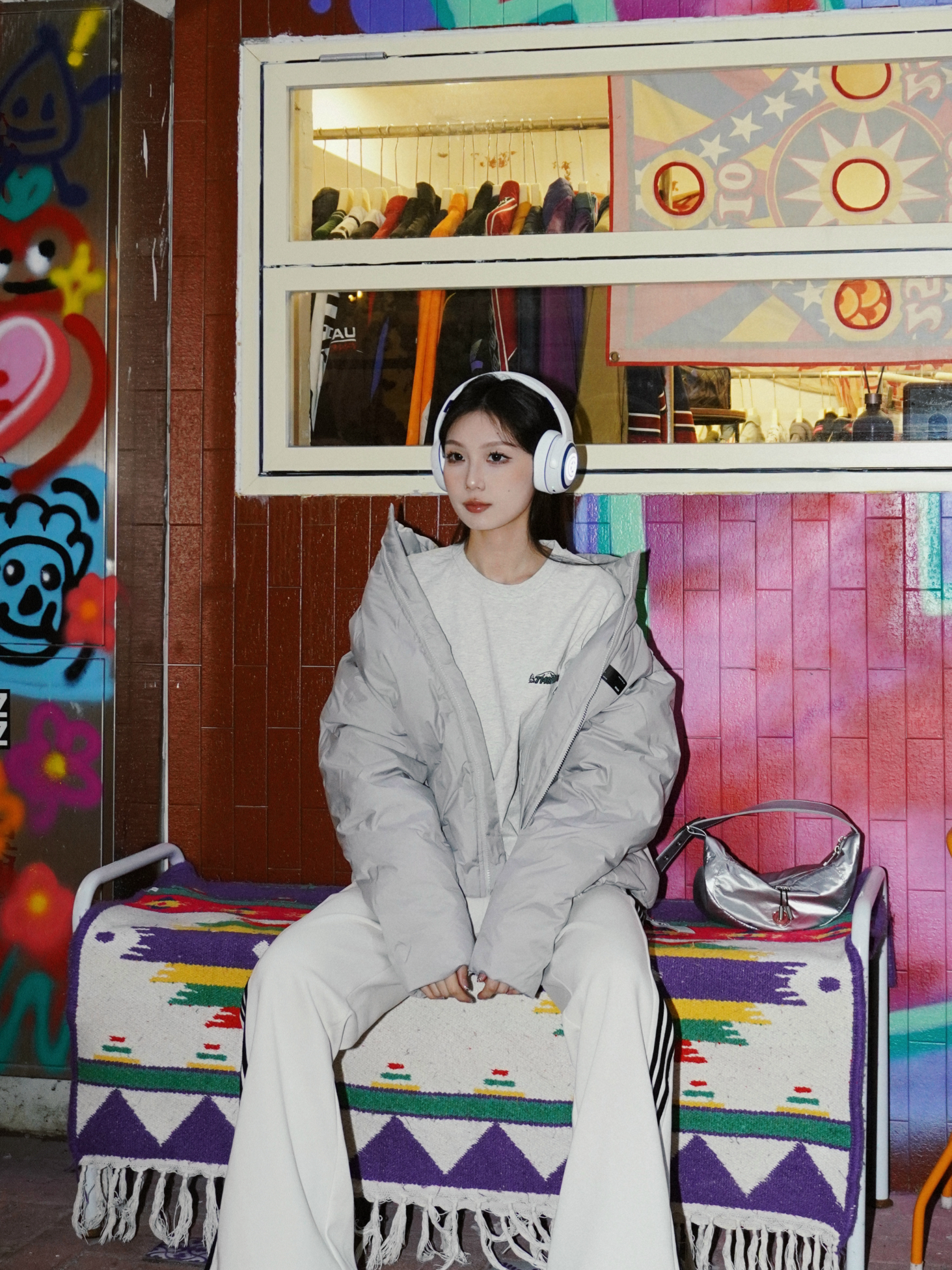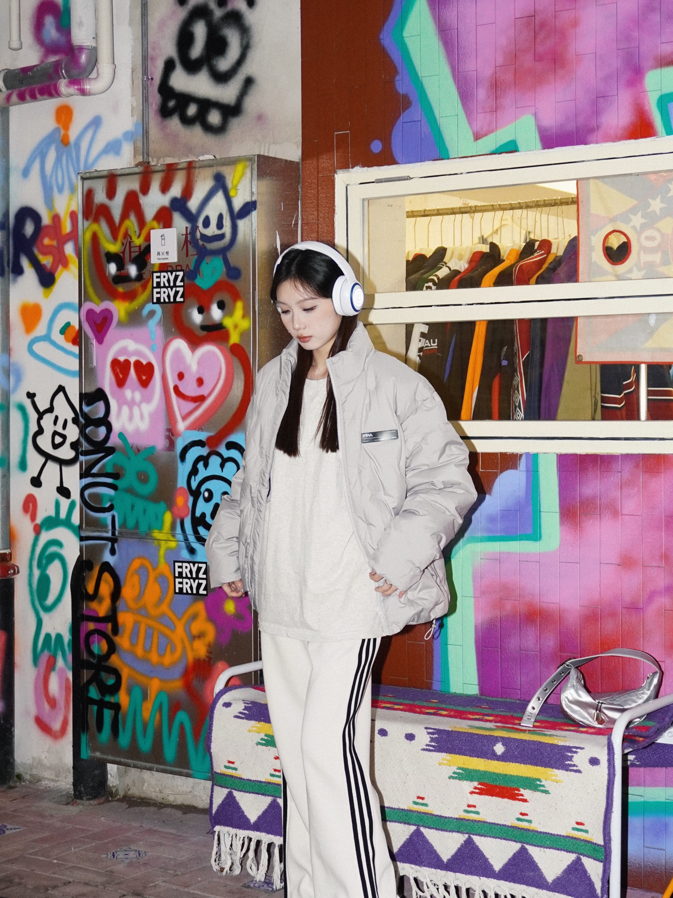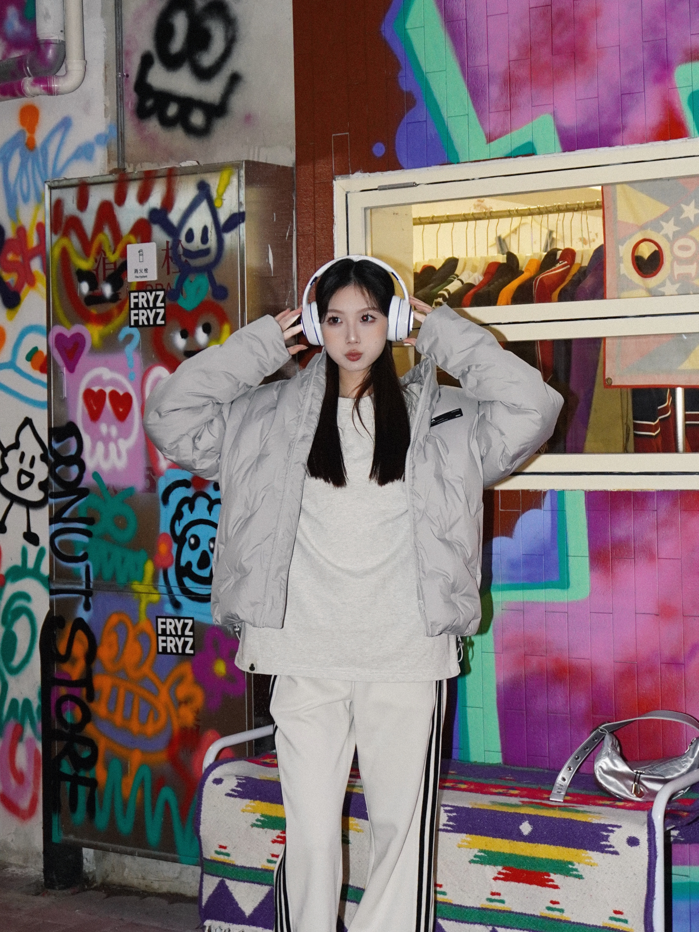 又找到了一处特别好拍的涂鸦区域🖌 非常用心的装饰 适合内啡肽穿搭 又或者是运动型风格的拍摄打卡地🎬 单穿羽绒服如果觉得太单调就可以加上一些配饰 例如随时都可以摆拍的白色耳机🎧 时髦度直接加满 冬天这么穿保暖又时尚