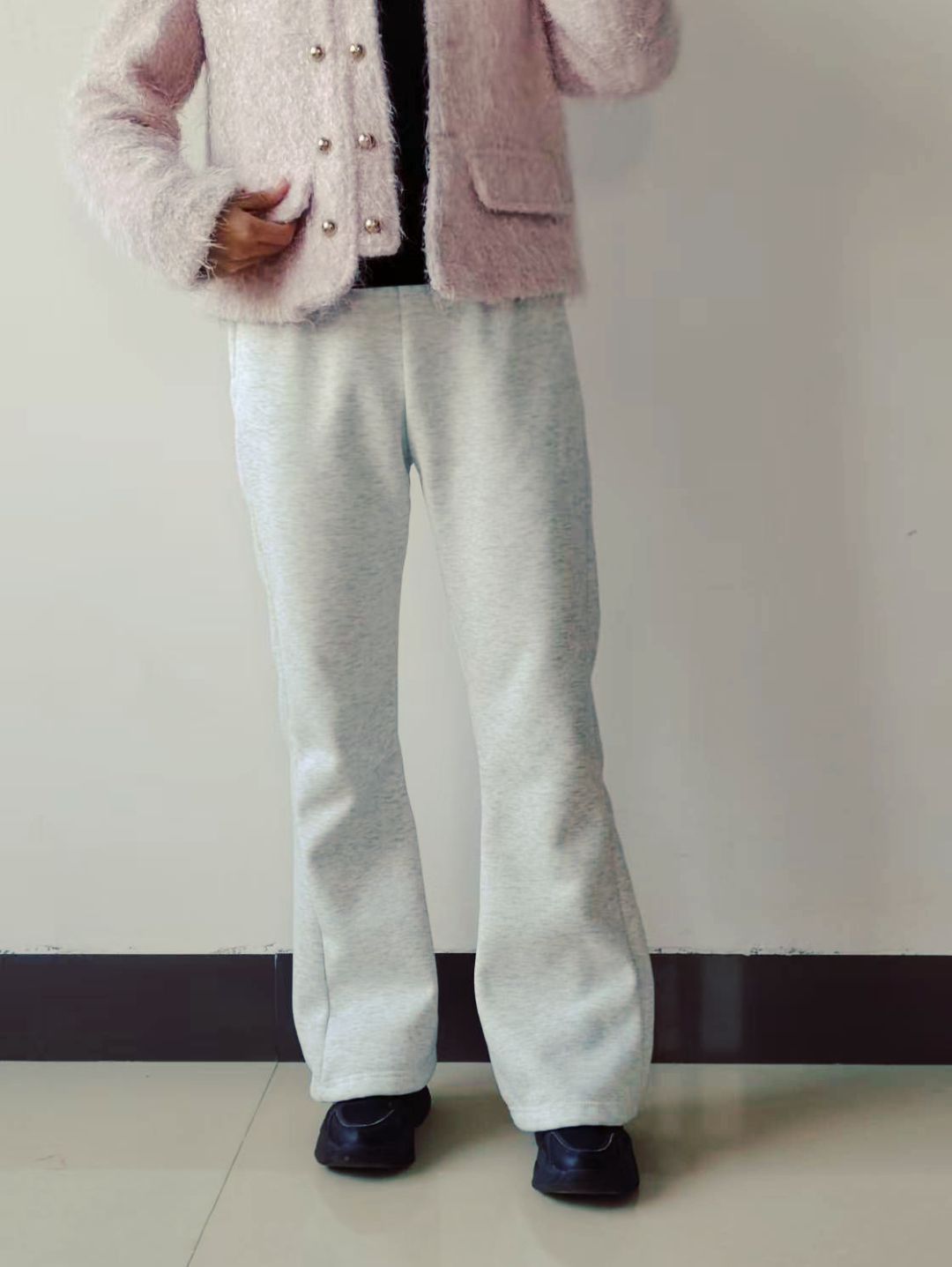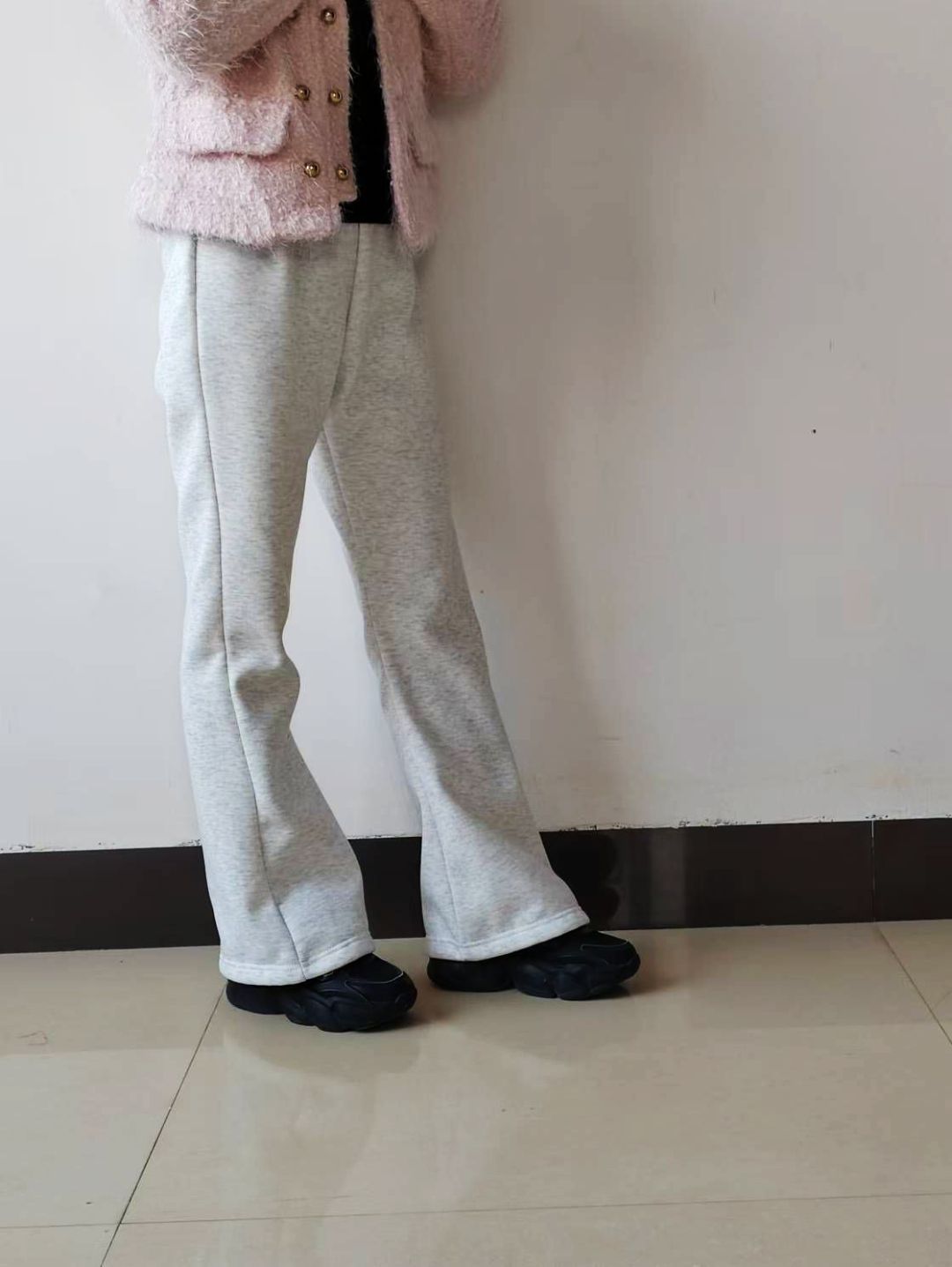 增高!遮腿!保暖!百搭!!!一定要选这款微喇休闲裤 搭配黑色厚底老爹鞋,显瘦又增高。搭配厚底棉鞋保暖又舒适。搭配板鞋小白鞋都是妥妥的🥰🥰🥰 上身搭配短款棉服羽绒服,搭配卫衣,毛毛外套🧥都是很百搭的,怎么穿都好看😘😘😘 158 95斤的小个子穿很友好,长度刚好,m码很合适。 穿多黑色的姐妹直接选灰白色,更有不一样的感觉哟 灰白色不太耐脏,但是上班穿也是没问题👌