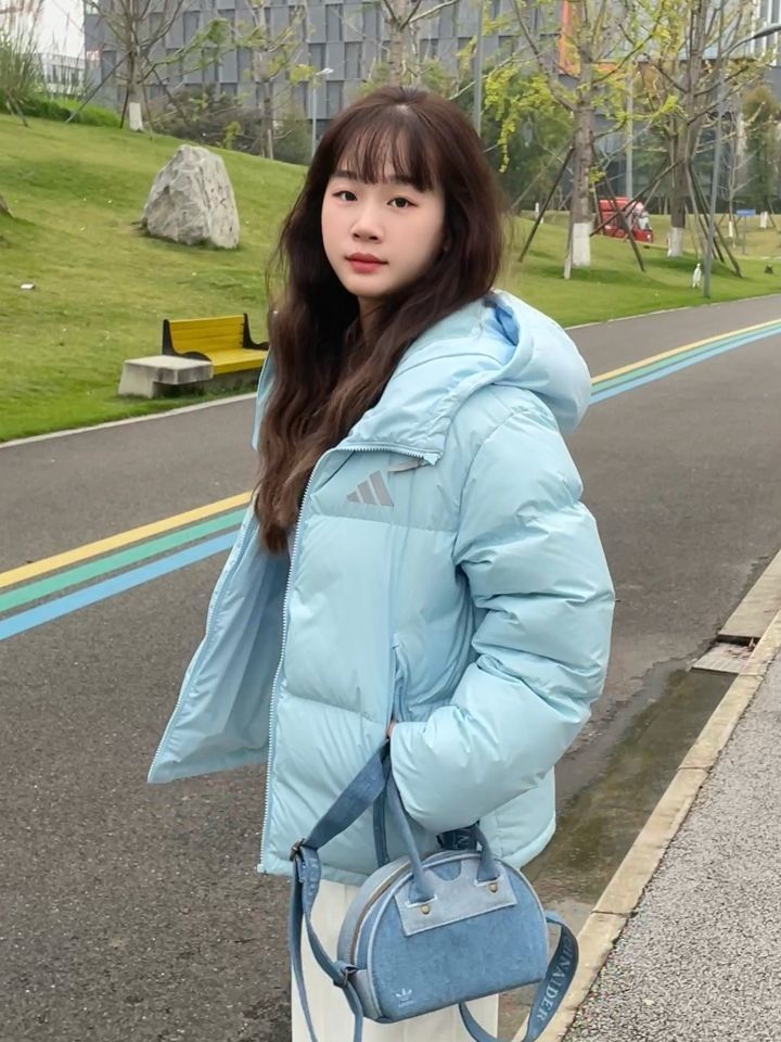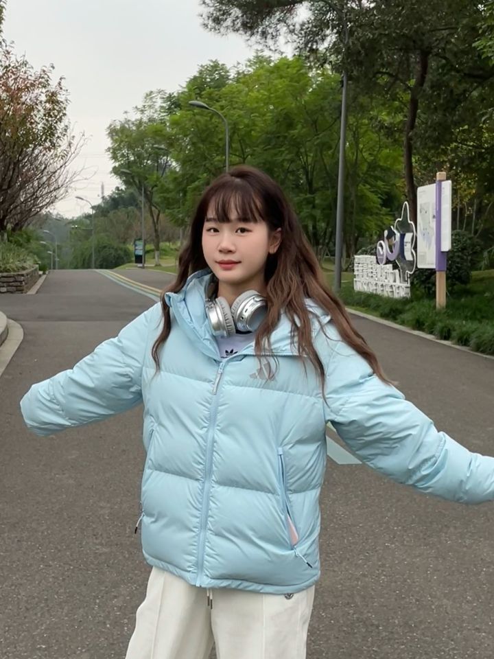这件好清新,好显嫩,又很厚实很保暖,需要一件亮色羽绒服超级小清新的蓝色羽绒服发配白色灯芯绒长裤+经典三条纹T恤韩味十足