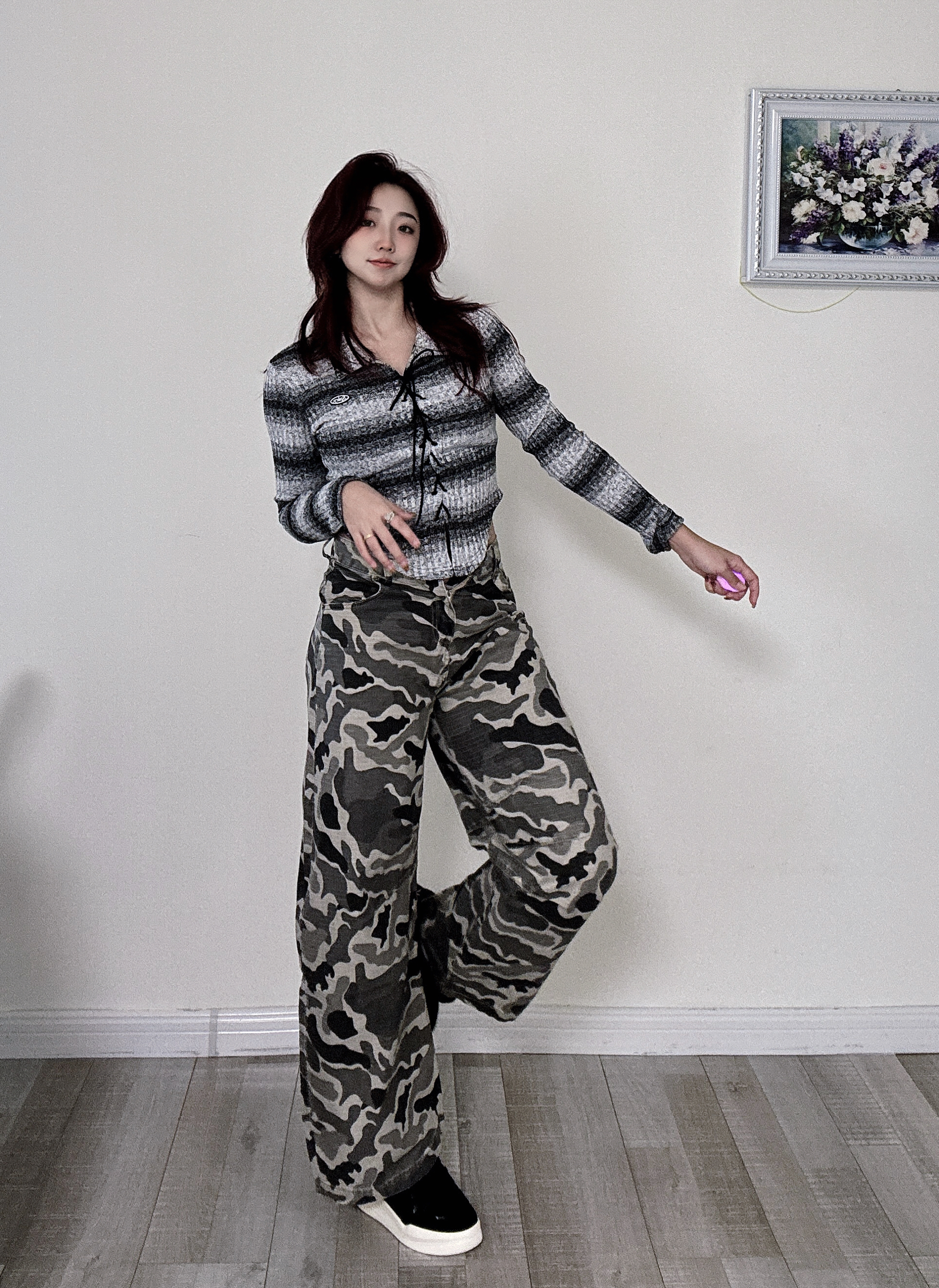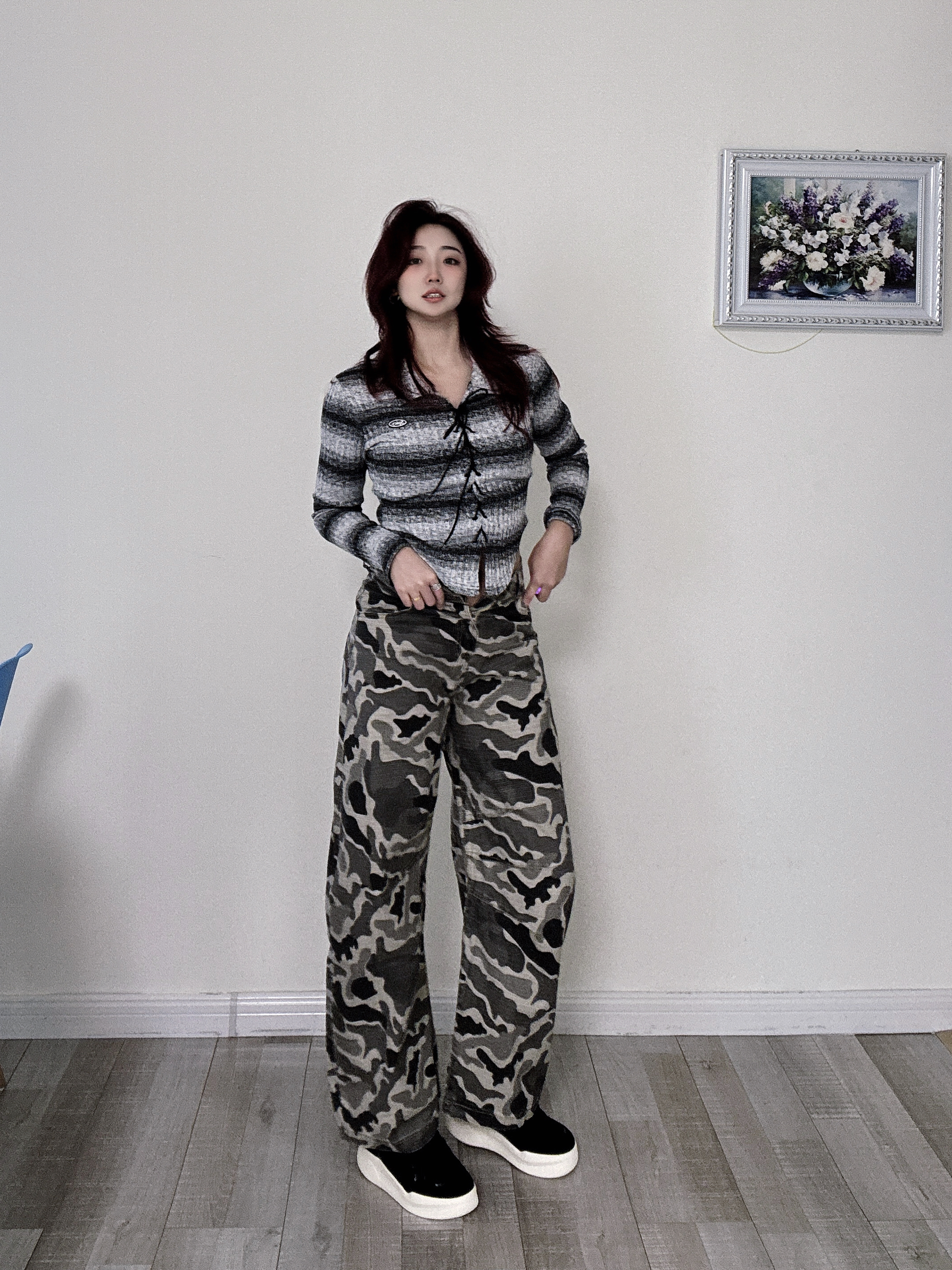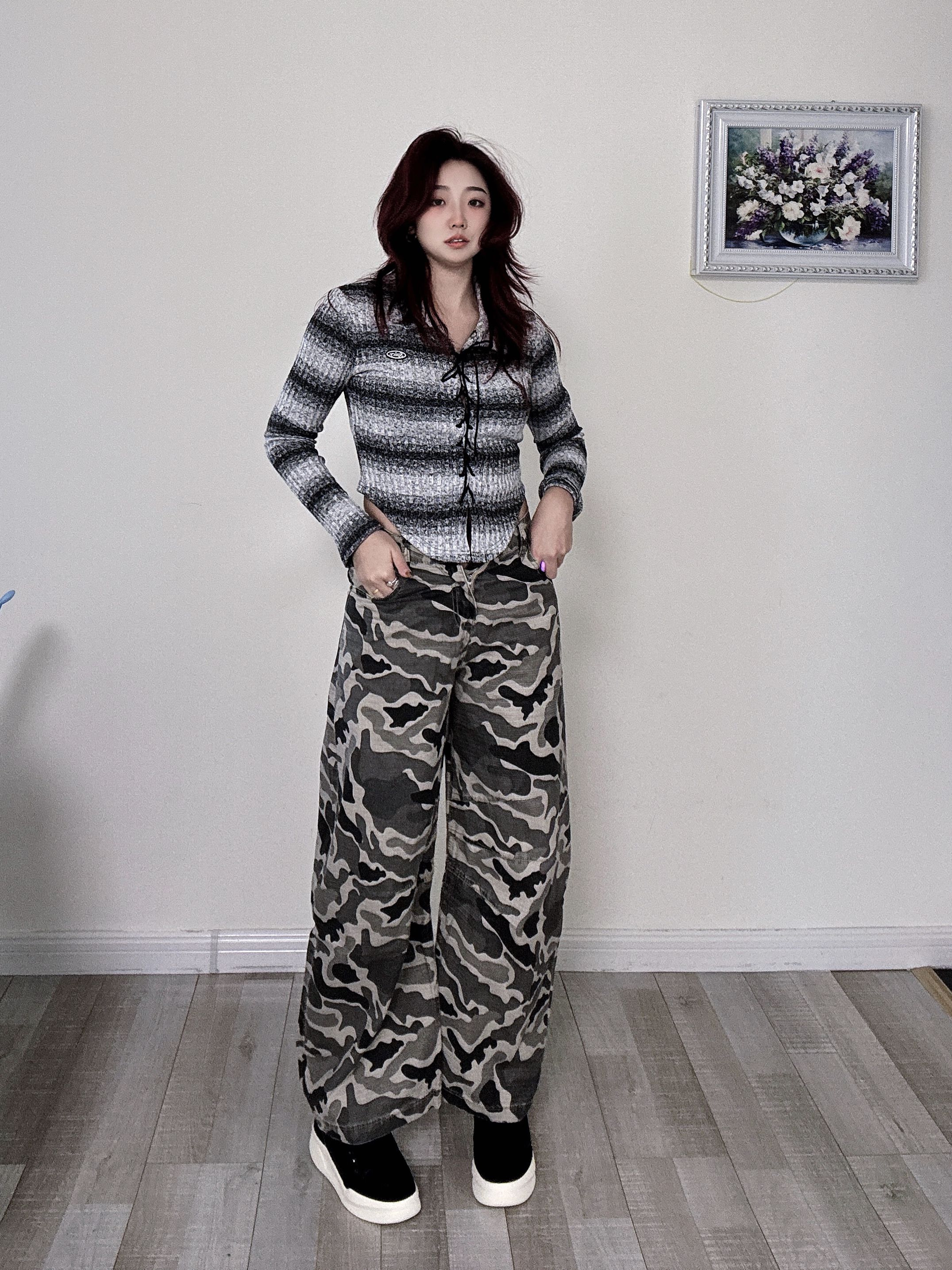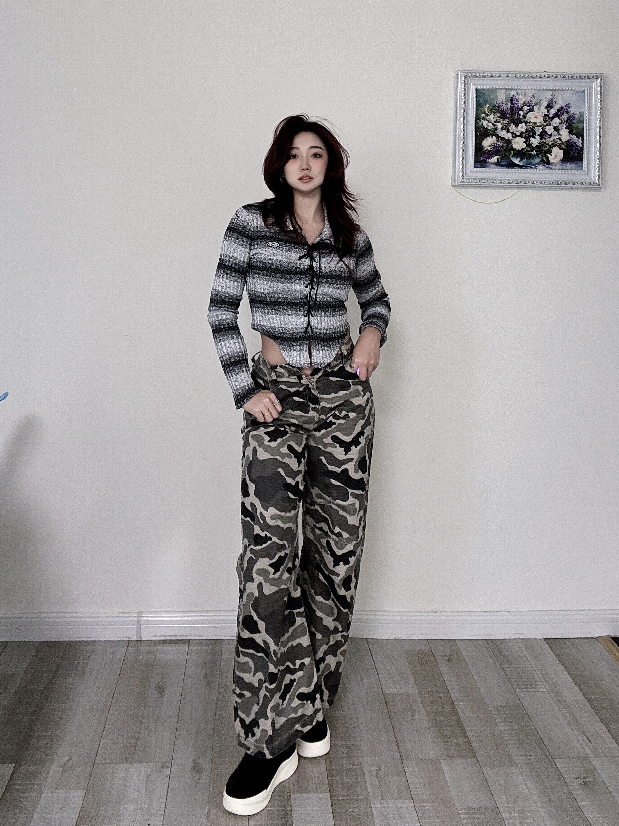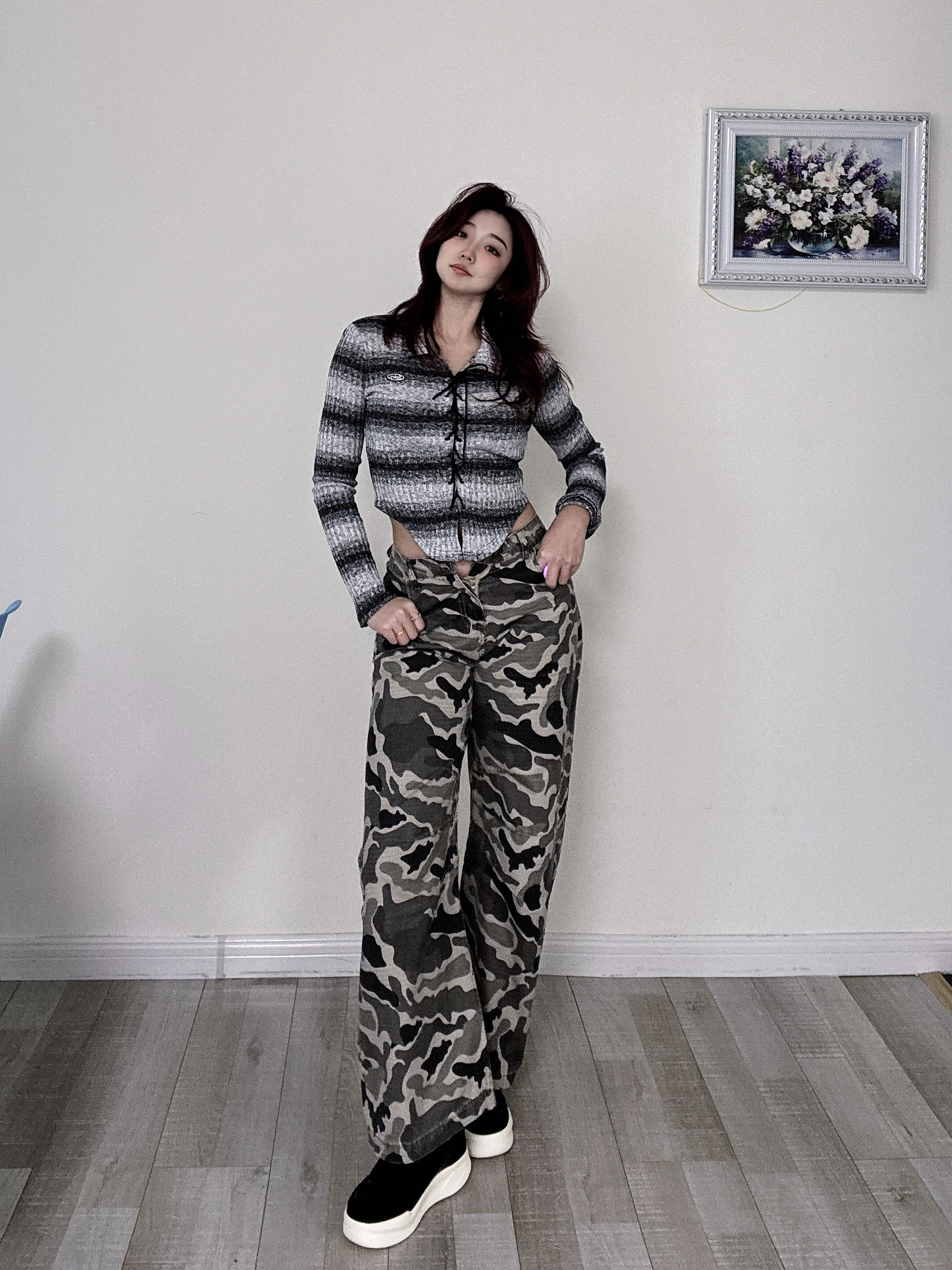 秋冬季节的辣妹穿搭妥妥的来了一波 条纹系带修身上衣➕迷彩阔腿裤 搭配黑色小圆鞋 回头率高了不少 鞋子有点特别的设计 一鞋三穿 鞋舌罩可替换 绒面设计 鞋底还有些厚度 是高弹的材料 长时间走路也很舒适哦~