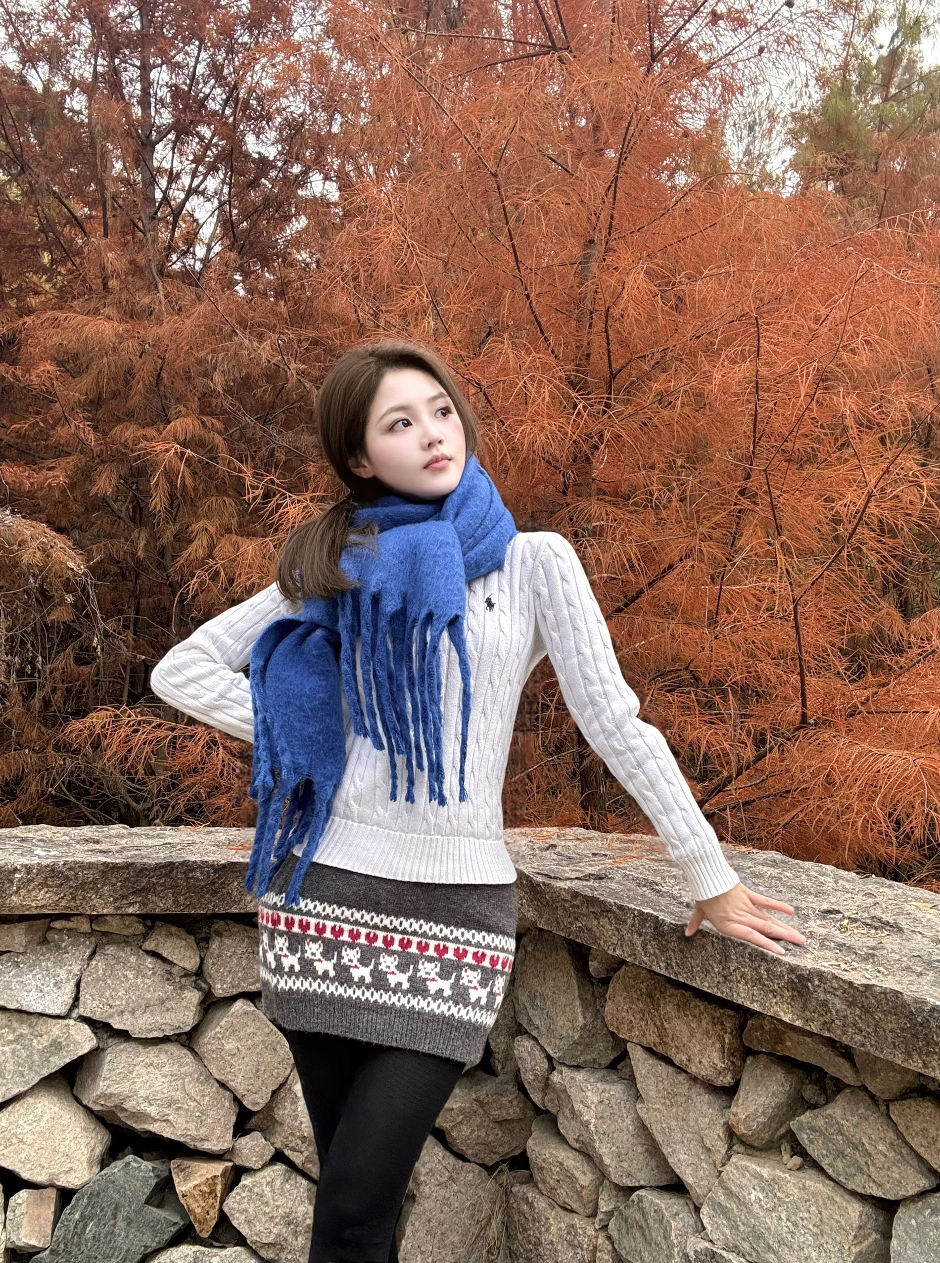 👚:拉夫劳伦白色毛衣,超级好搭配,老钱风十足 👗:毛线裙 下搭黑色丝袜+蓝色围巾+短靴 知性与性感的混搭~ #识货萌新创作营