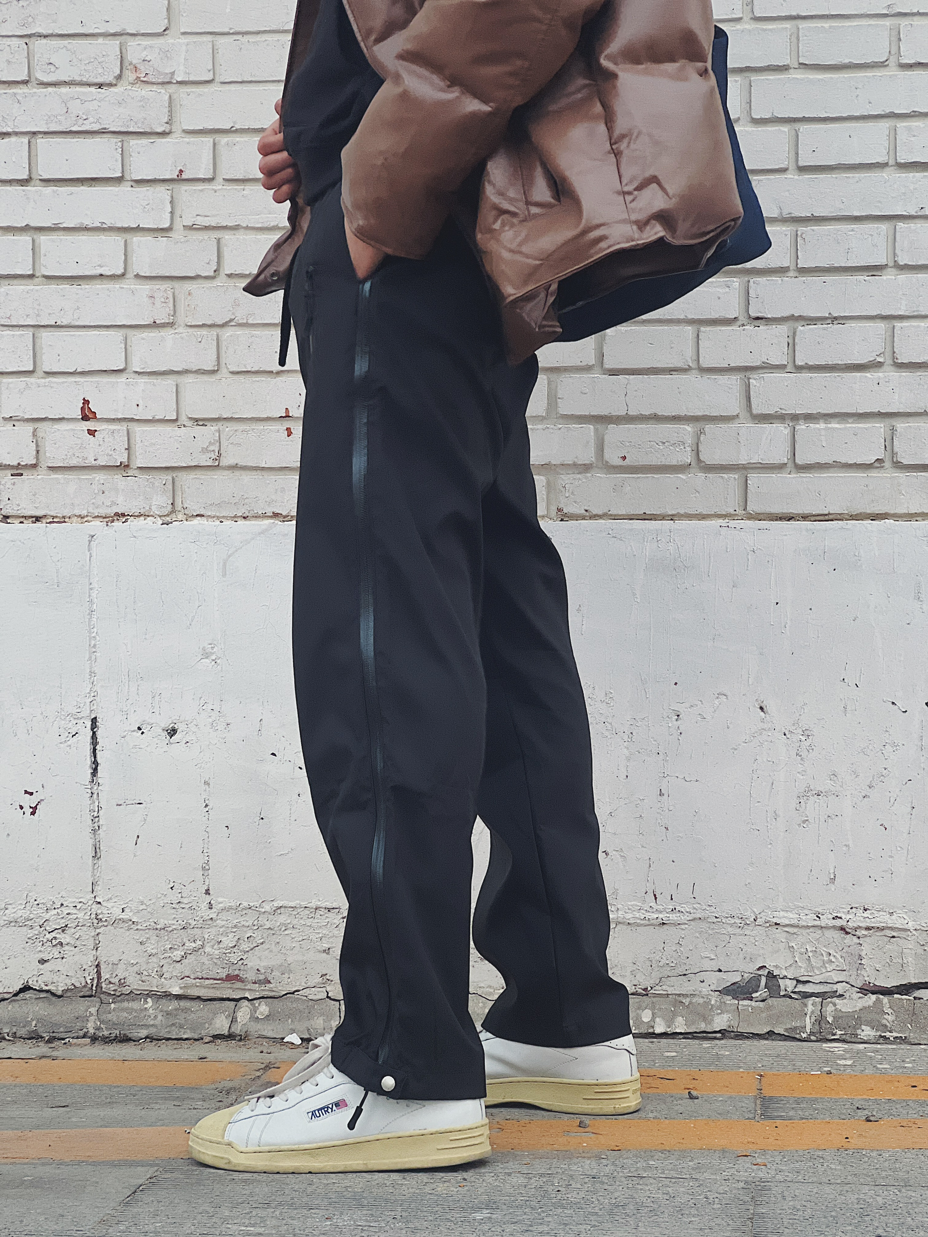城市户外裤,功能可以不多,颜值必须拉满 裤型宽松直筒剪裁修饰腿型,大腿两个装饰拉锁有机能风又显腿细 裤脚按扣拉锁,闭合有束腿裤的效果,打开变阔腿裤,两种感觉,好搭不同鞋型 侧身放风防水拉锁,可以开合,适合夏天运动后通风 防水材质,多功能腰带,适合轻户外