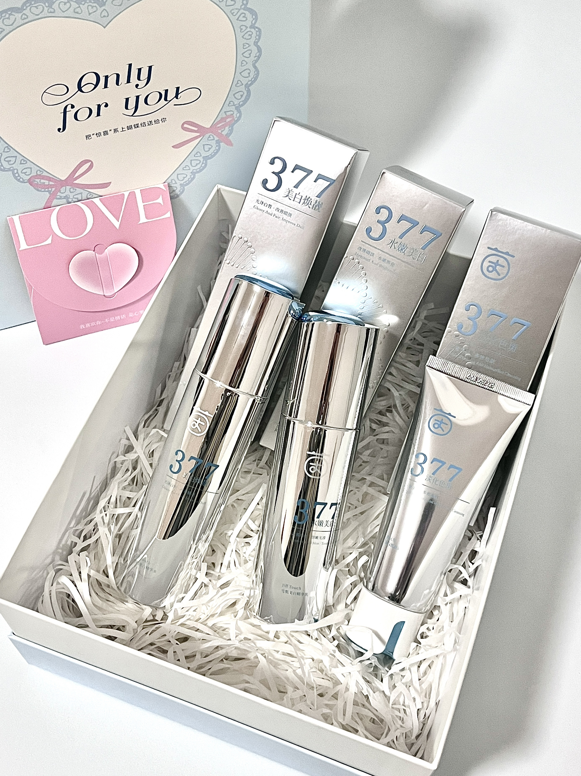 天啦噜! 我发现了一套炒鸡适合送女孩子的礼物 茵倩377发光护肤礼盒 一打开就被这包装蓝白配色给吸引到啦 礼盒里面有精华水+精华乳+洗面奶 它的水乳质地都蛮清爽的 上脸hin温和好吸收不粘腻 洗面奶打出来的泡沫绵密丰富 可以深层清洁肌肤 洗完感觉蛮清爽的但是不干哦~ 因为整套都含有377美白 所以保湿补水的同时还能去黄提亮 我一般都是晚上抹的 的确是觉得小脸透亮了一点吧! 里面还有定制的手提袋...