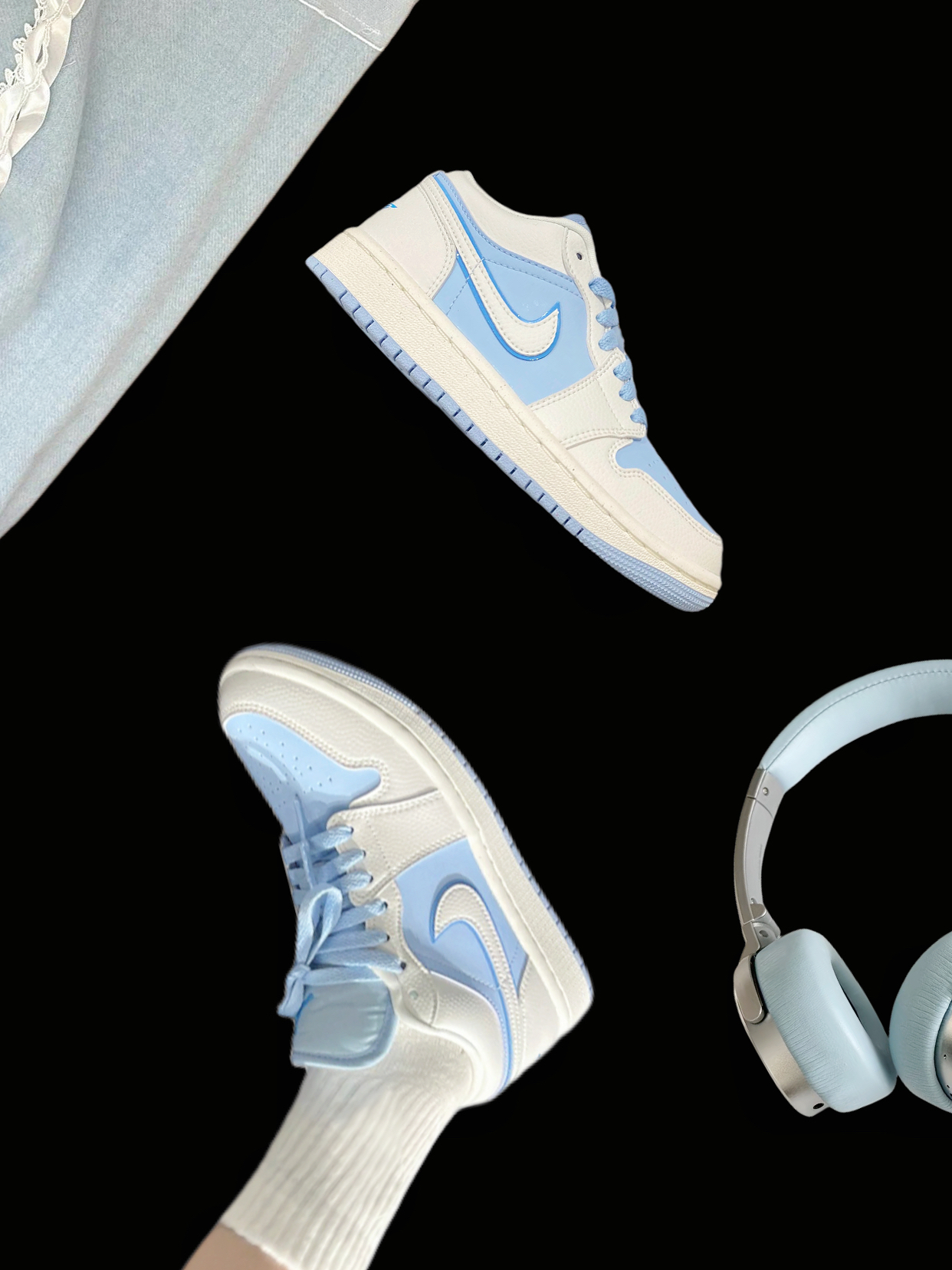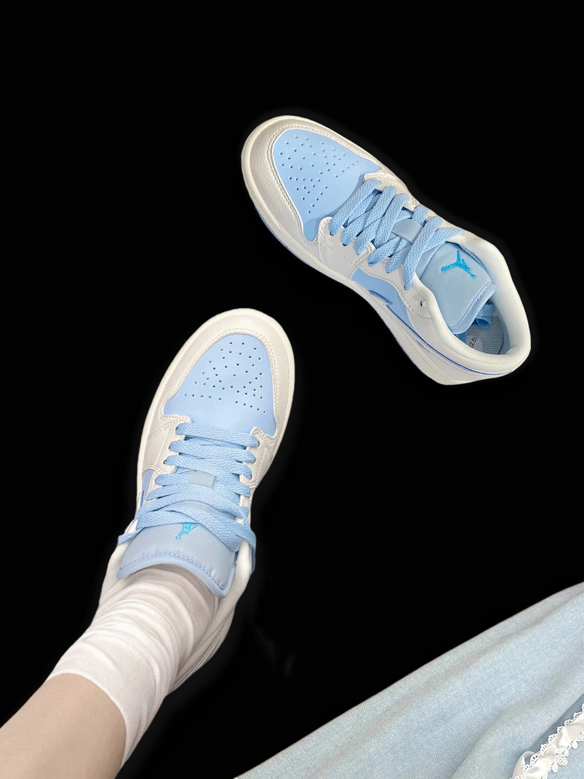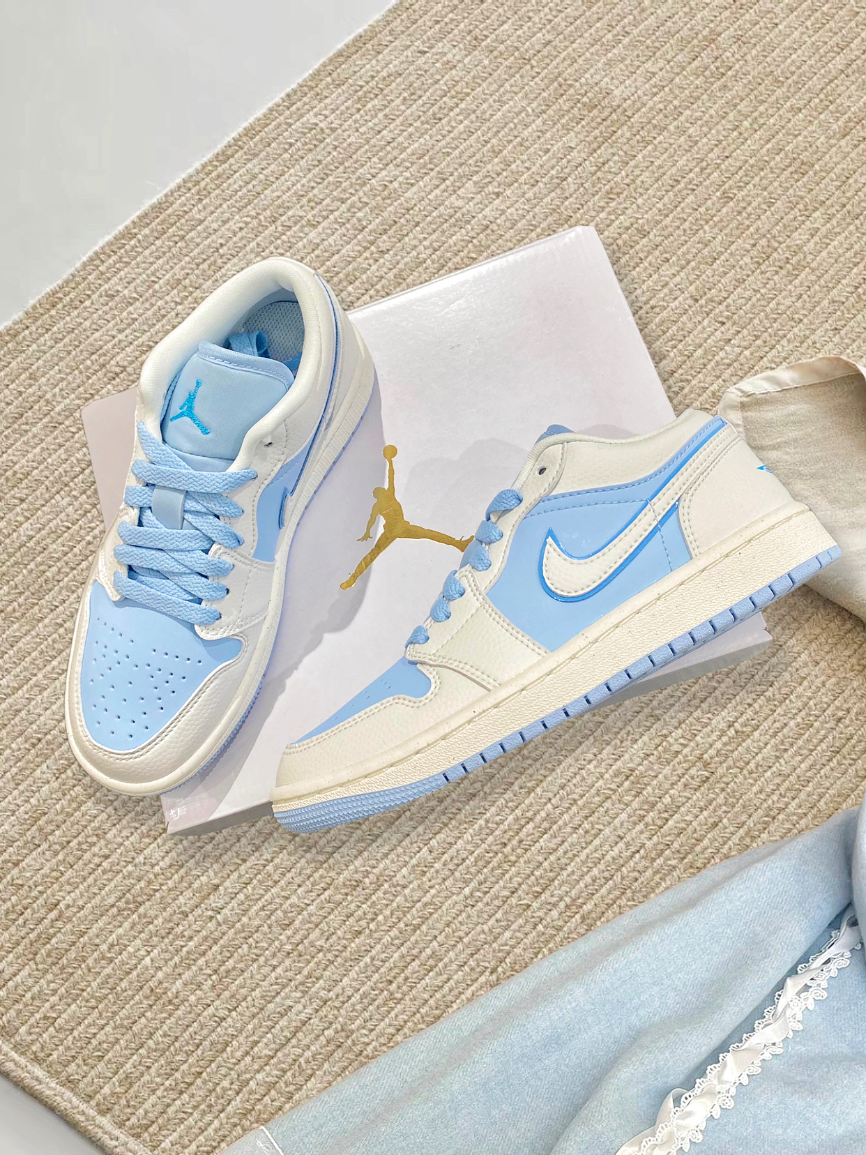 哇,大周末的有被美到! 冰蓝🧊Aj你是懂元气青春的~ 奶油白➕冰蓝勾子, 奶乎乎的太好看咯。 低帮鞋子比较百搭, 穿小裙子和裤子都超美的这双💕