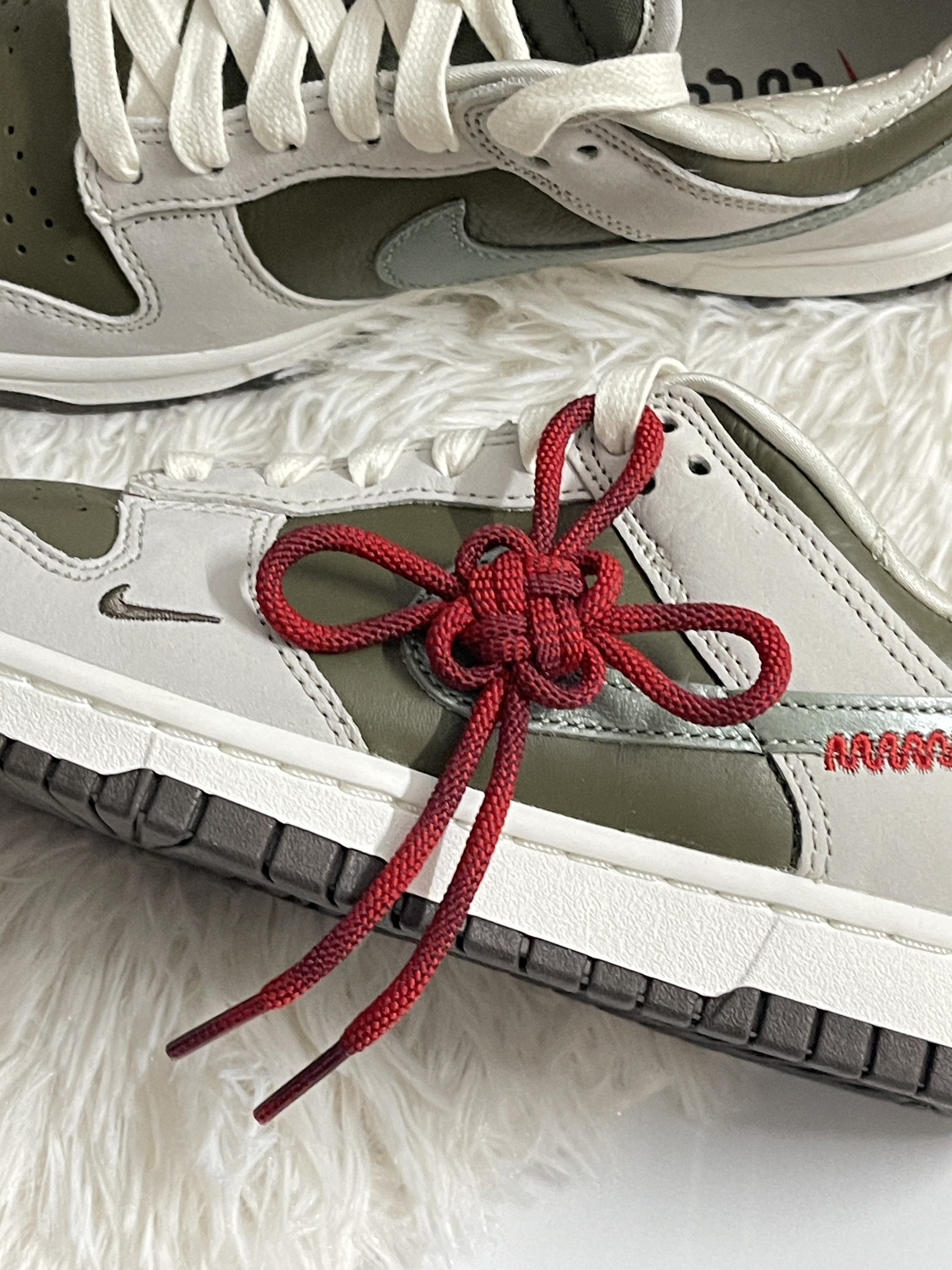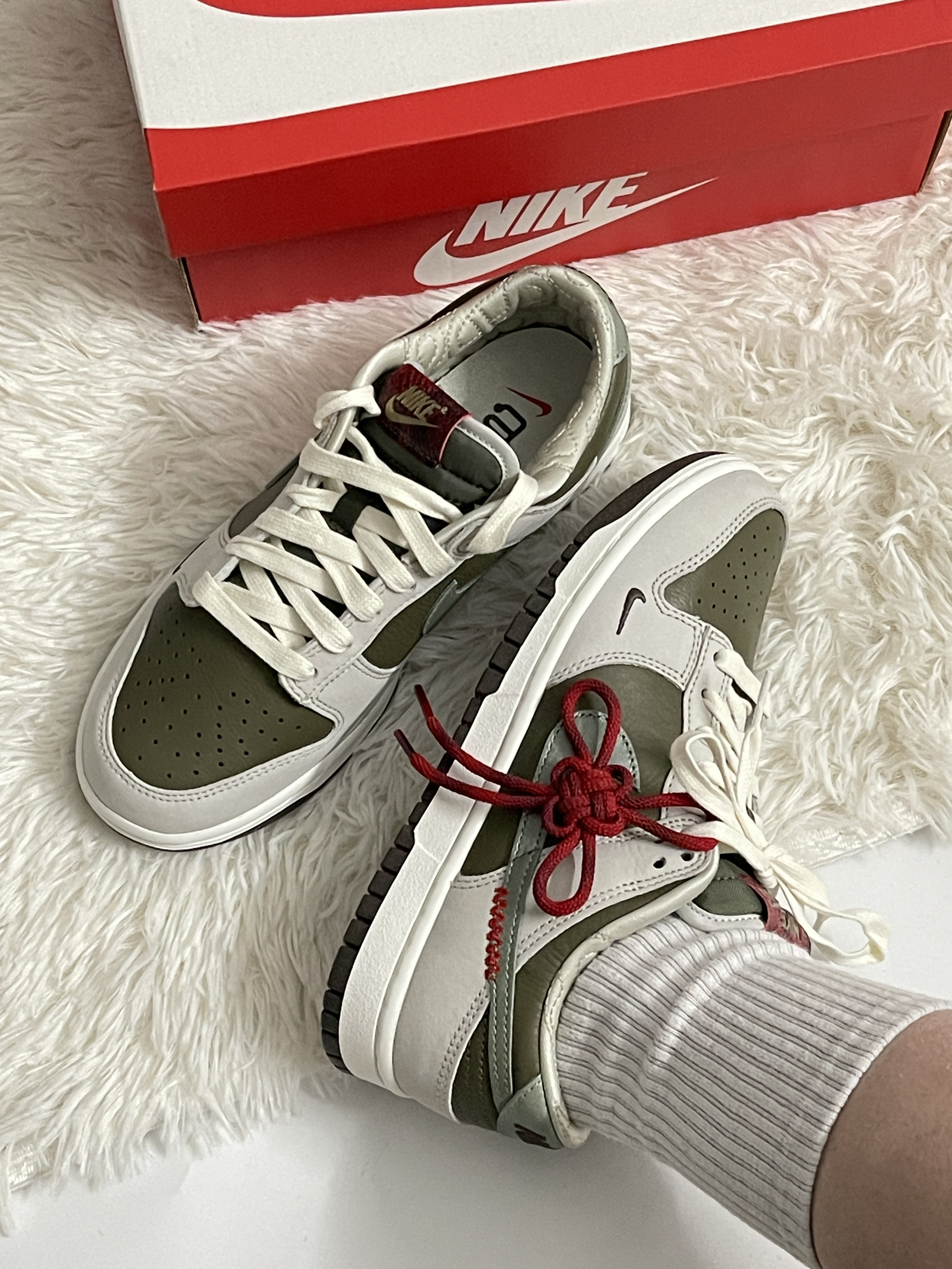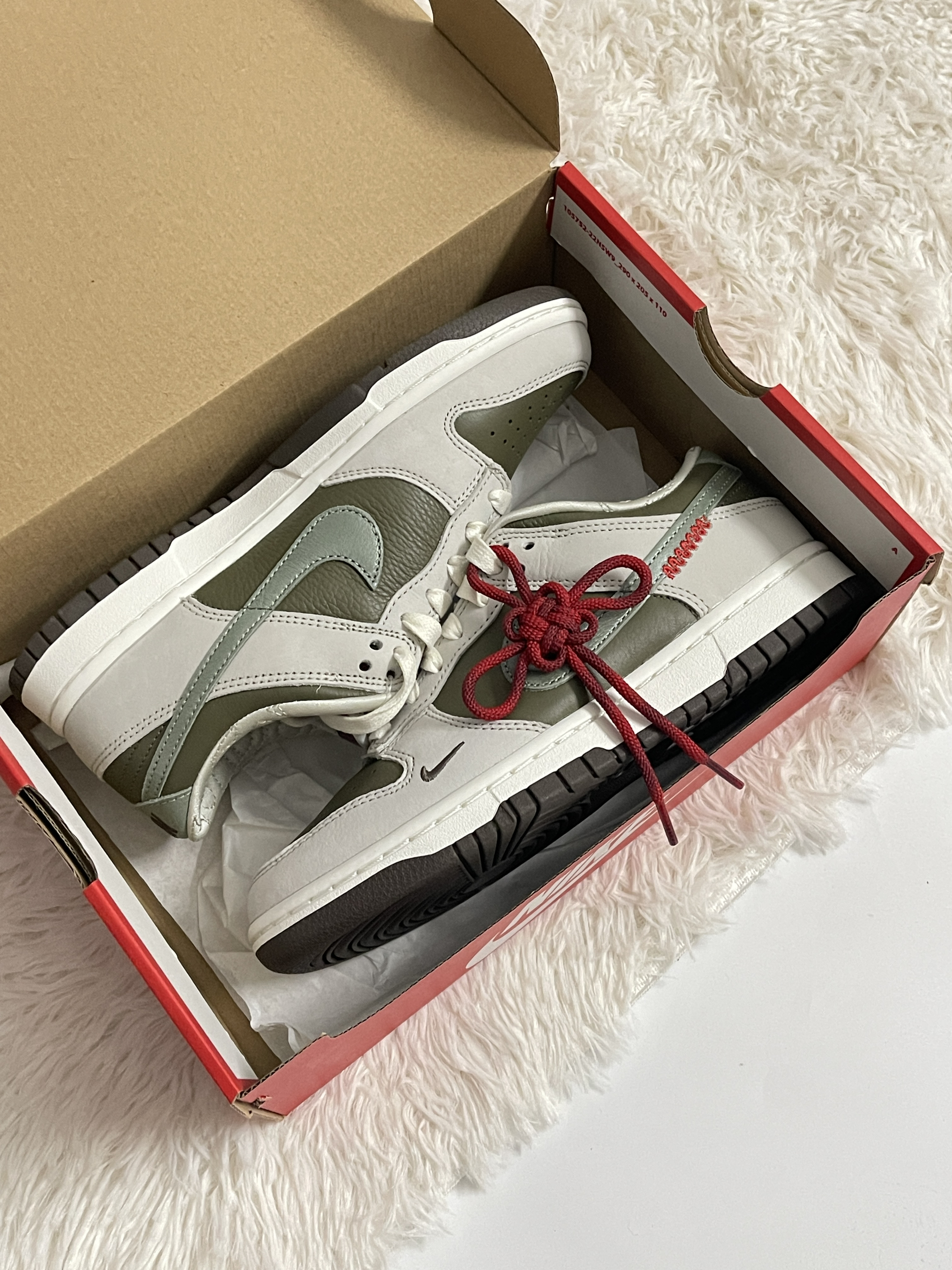 这双Dunk细节真是戳到我了! 整体的配色就很蛇年了 而且中国结的设计也是很少见 这次蛇年的加入让我觉得新年氛围都浓厚了 鞋子的皮质也很厚实 另外我想分享的还是鞋内层 做薄了很多但是鞋内层也是有菱形格的加持 不会影响舒适度 Swoosh的位置也是做了红绳编织的小细节 胖脚试穿正常码购入就好了