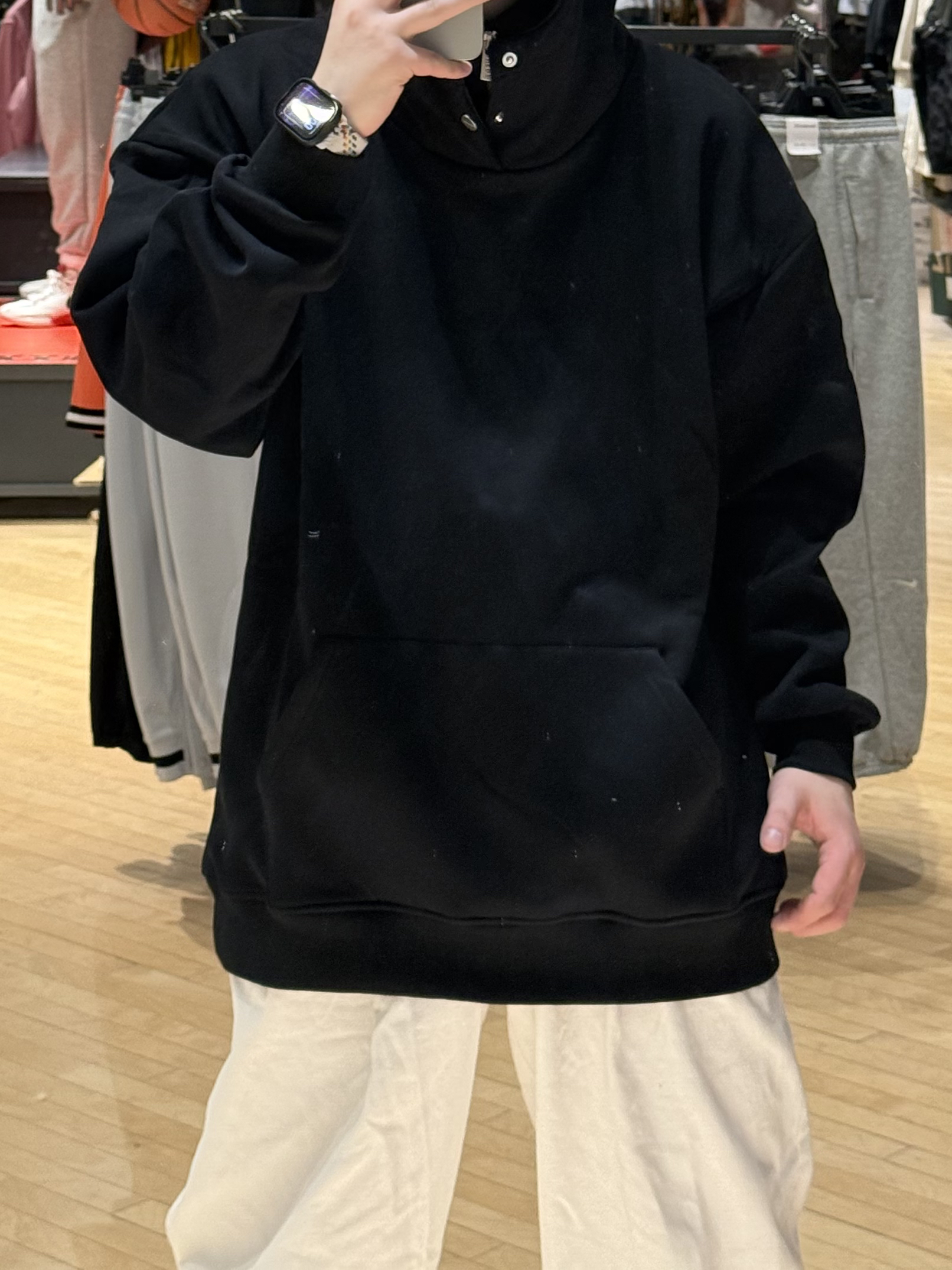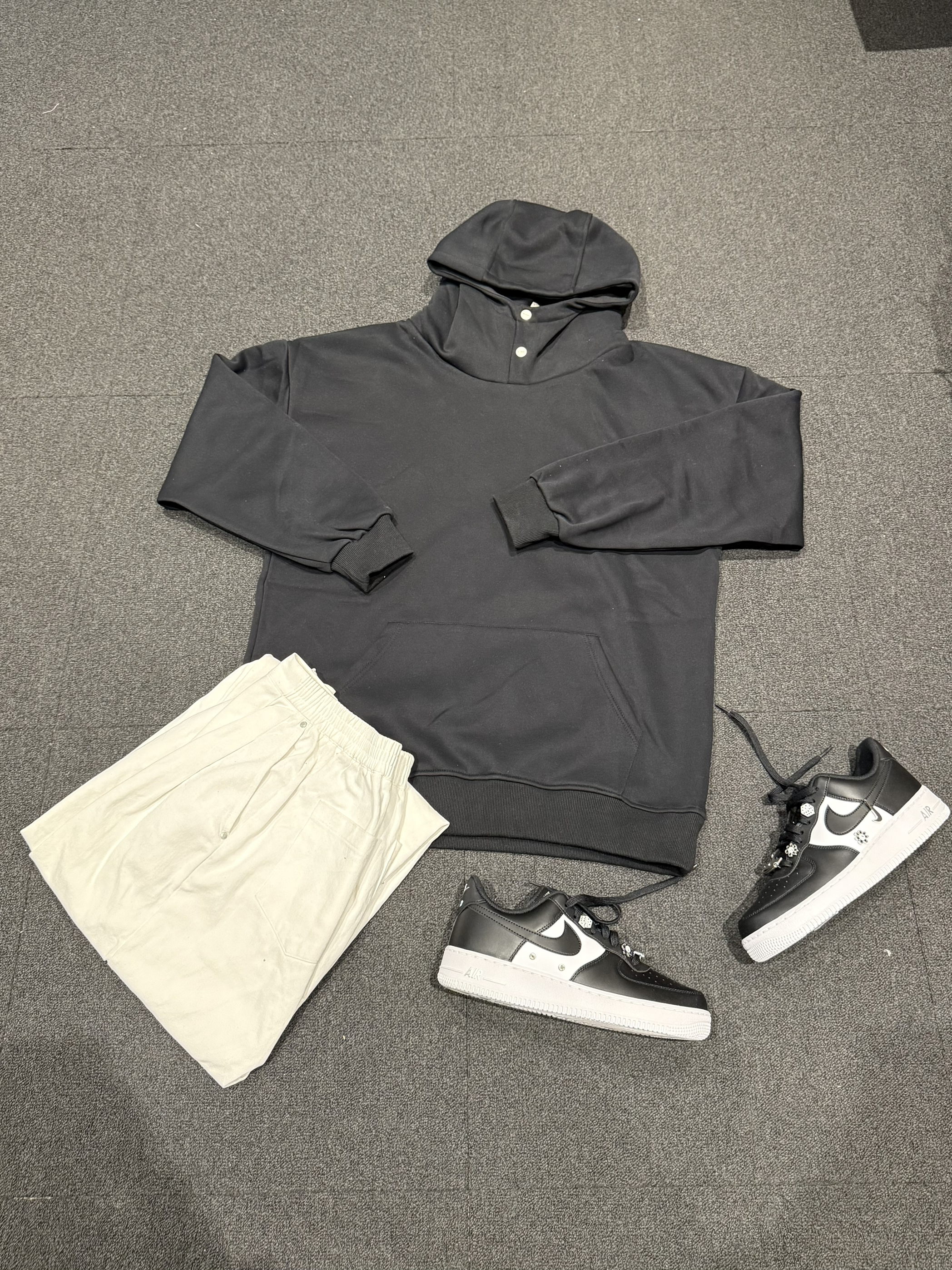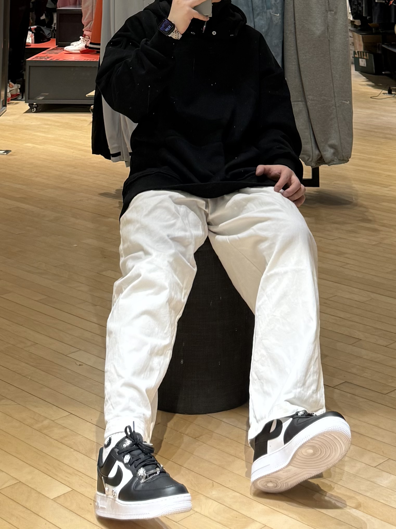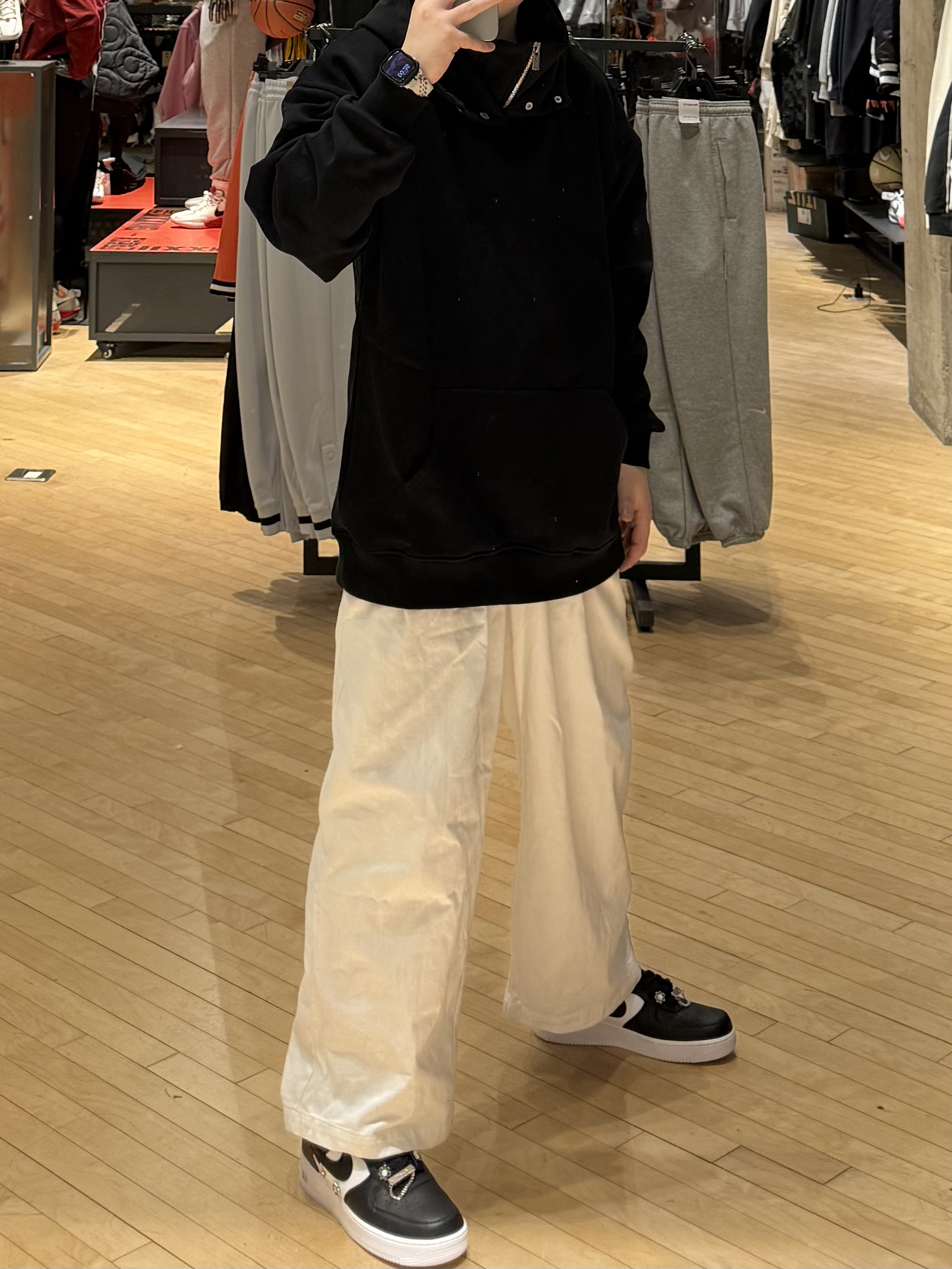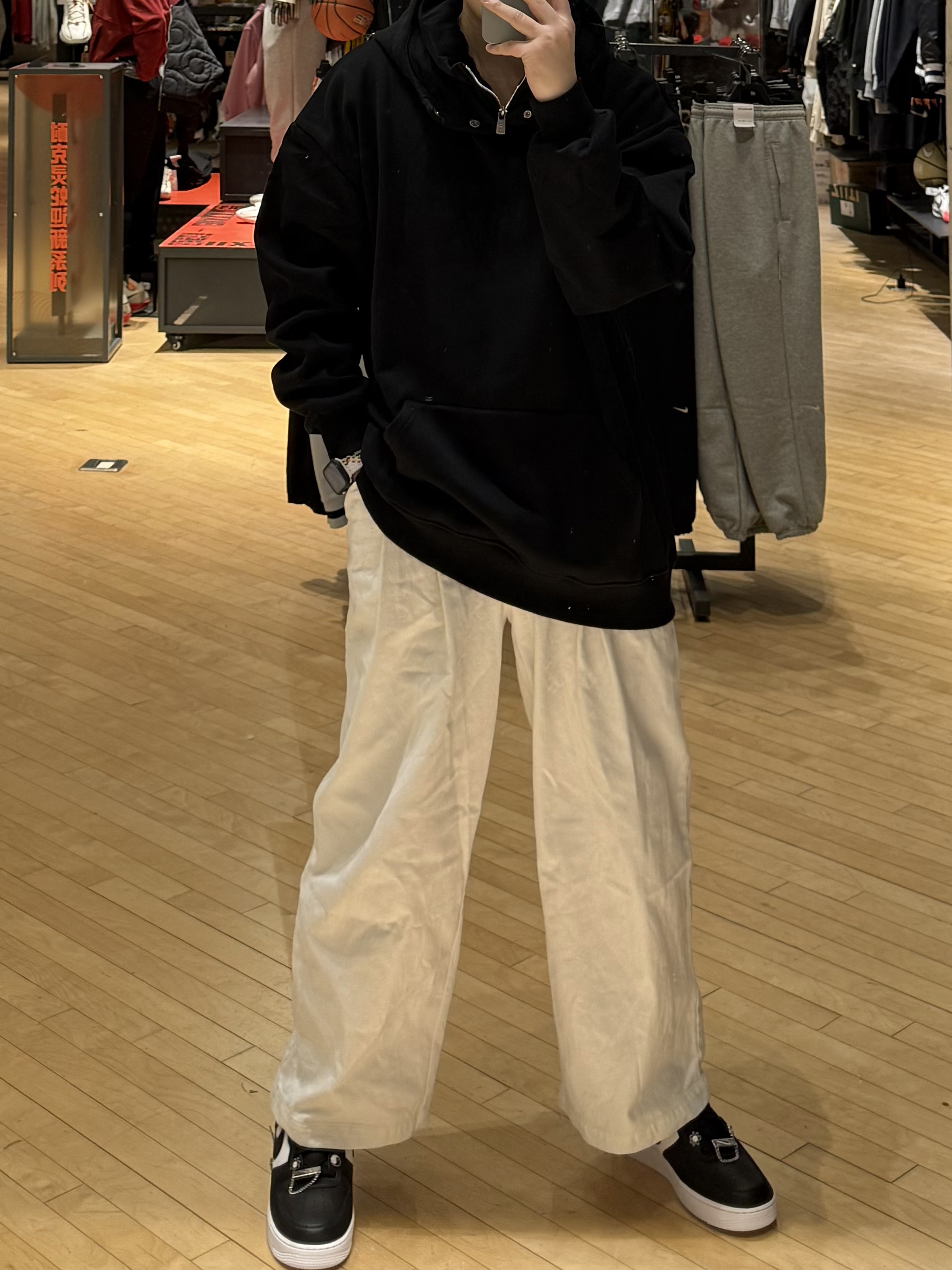 ✨今日份穿搭分享✨ 黑色纯色 连帽卫衣➕白色直筒长裤➕Nike Air Force 1黑白,最近我的通勤“时尚单品” 纯黑连帽卫衣,纯黑的颜色➕宽松的版型真的一整个百搭不出错,加上面料软软乎乎的,贴身穿亲肤又舒适,不管是出门通勤还是上班工作都很合适,是我冬日通勤少不了的“时尚单品”。