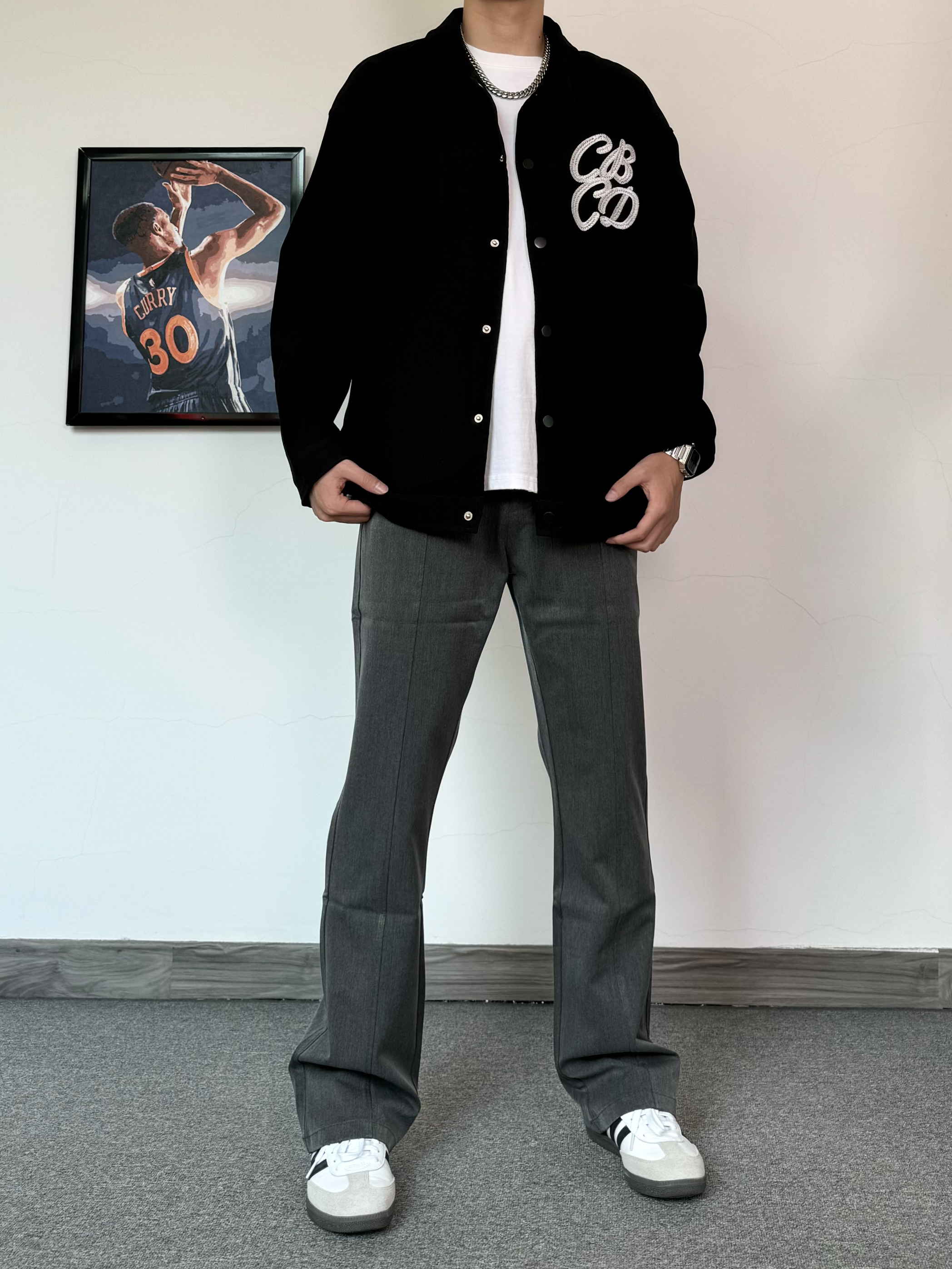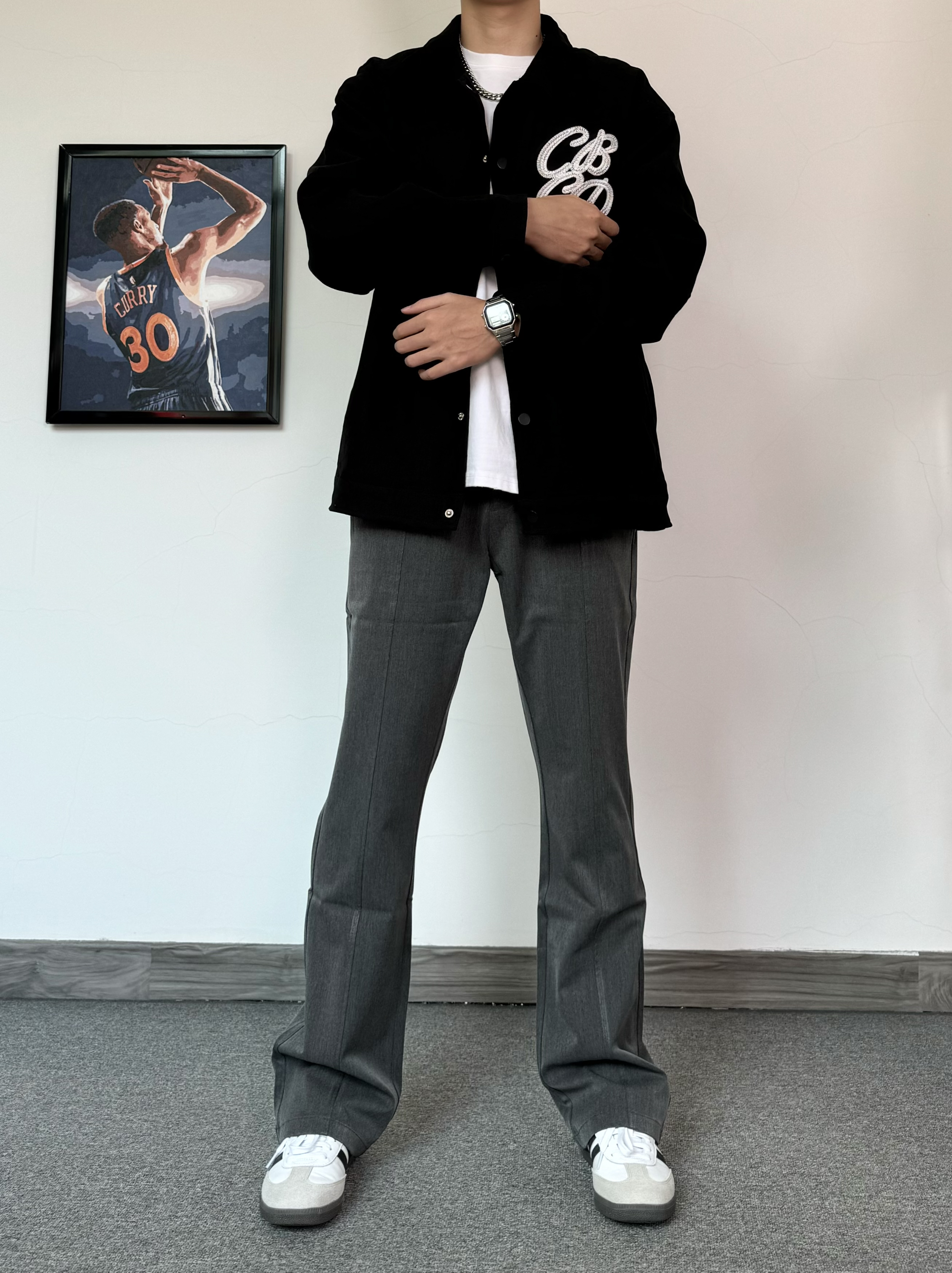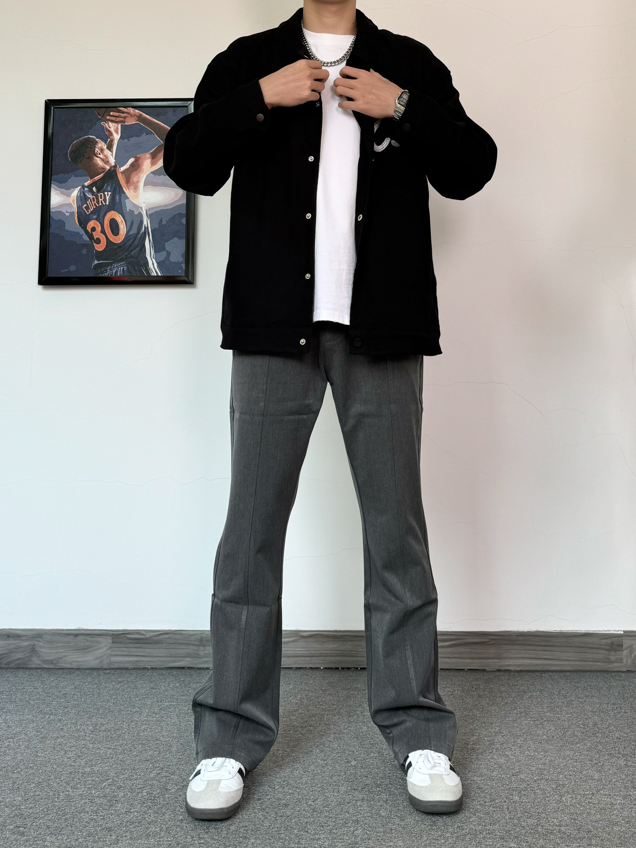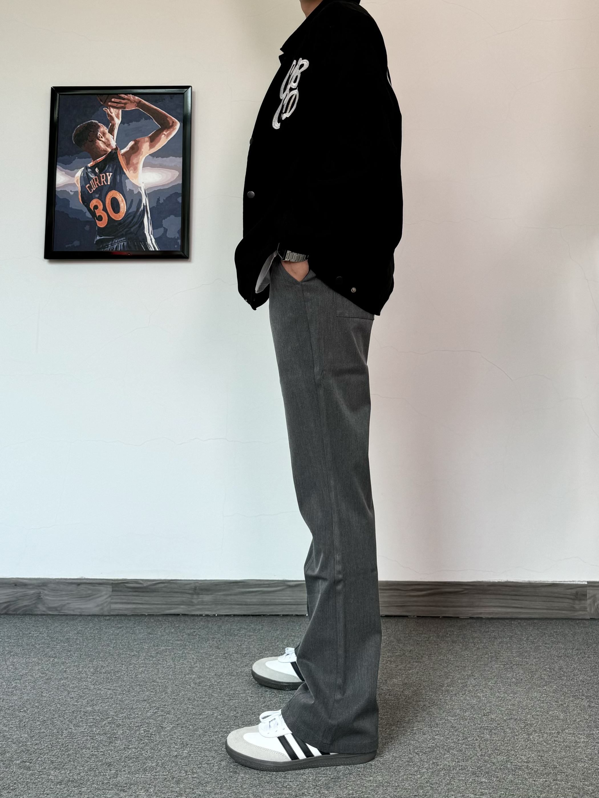 黑色夹克尊嘟穿不腻~ 搭配灰色微喇版型休闲裤 主打一个简约百搭✔️ 脚踩经典阿迪德训鞋 街头氛围感拿捏的死死的!