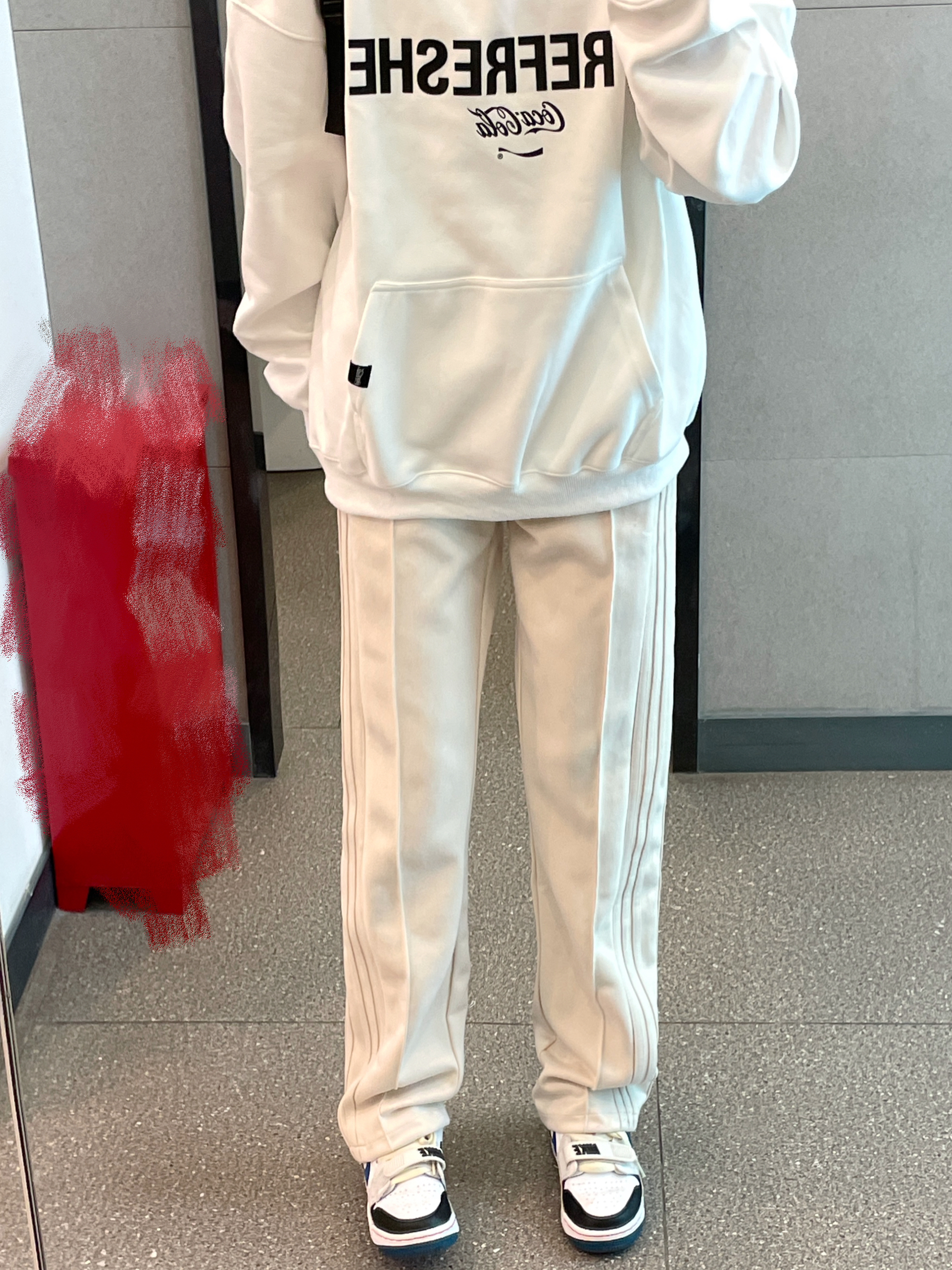 👔 :可口可乐白色连帽卫衣 👖 :coldstone杏色麂皮条纹裤 🎒 :Kappa红色双肩包