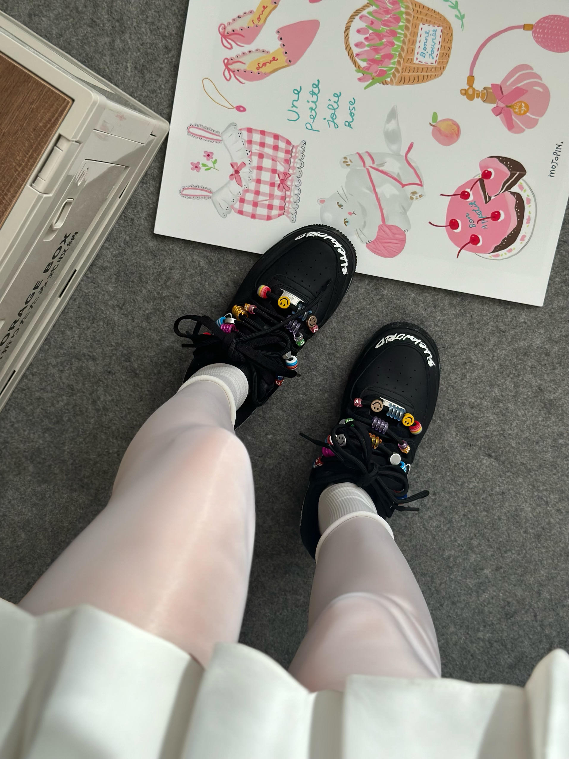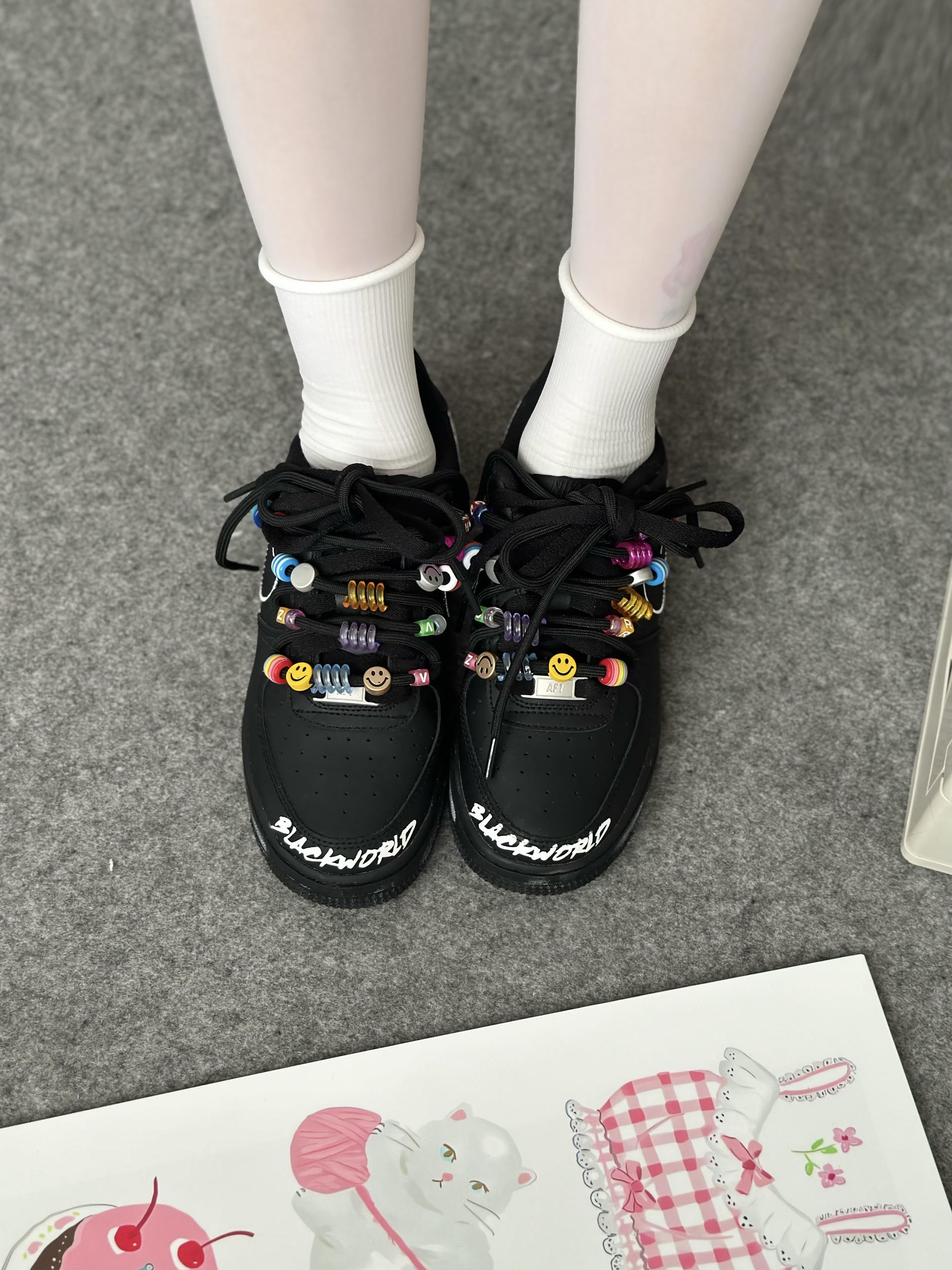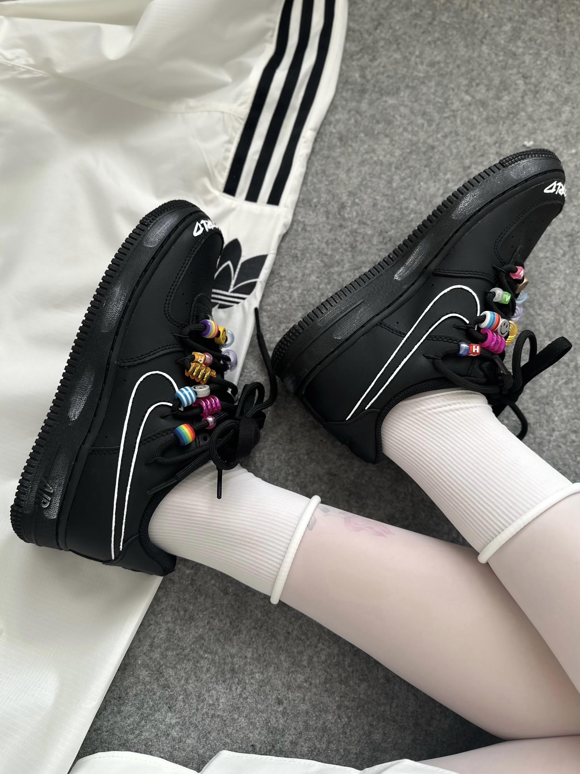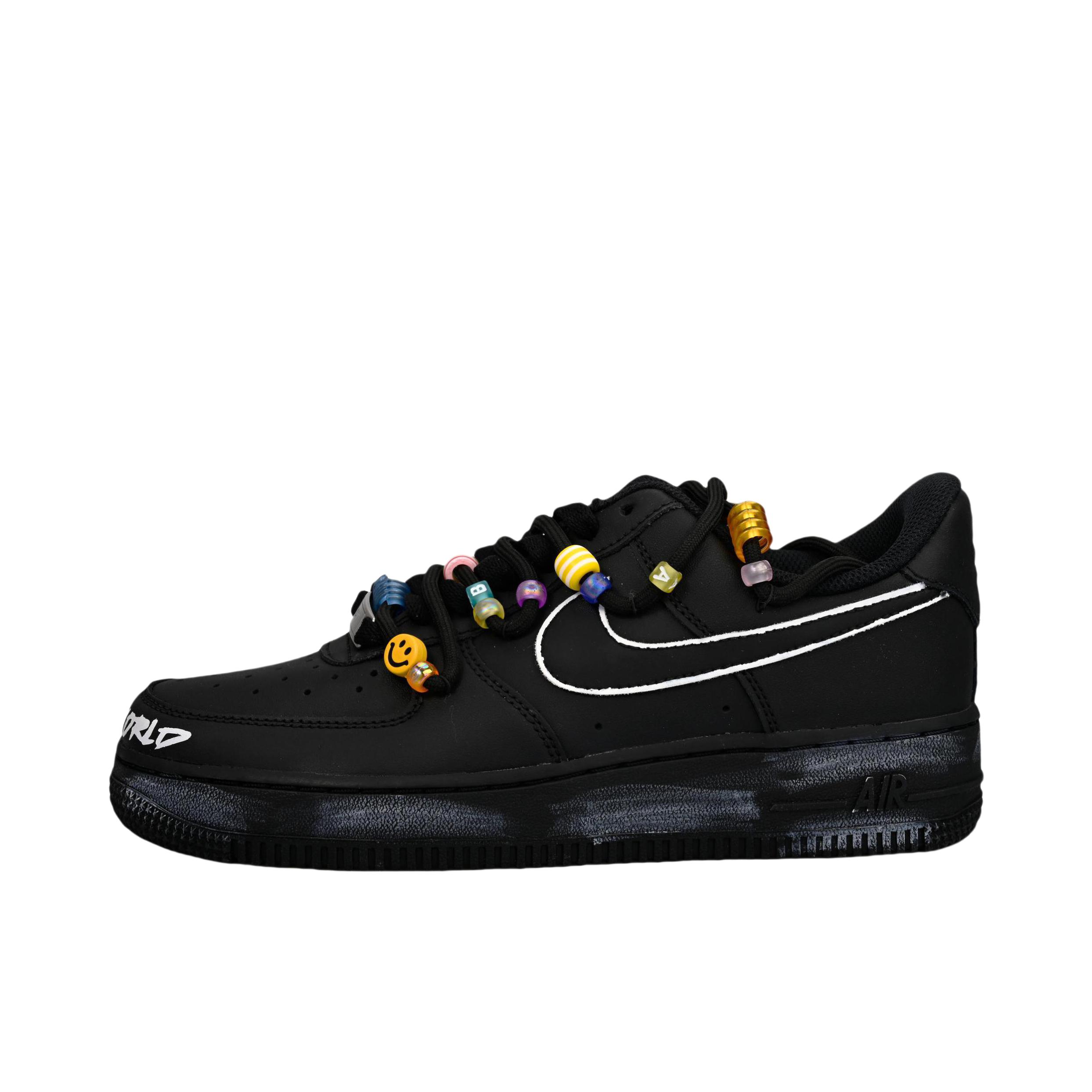 全黑的空军有点帅呀 鞋带上点缀了彩色的串珠 鞋头还有白色涂鸦 基础黑色系百搭又休闲~ 搭牛仔裤或裙子都不错!
