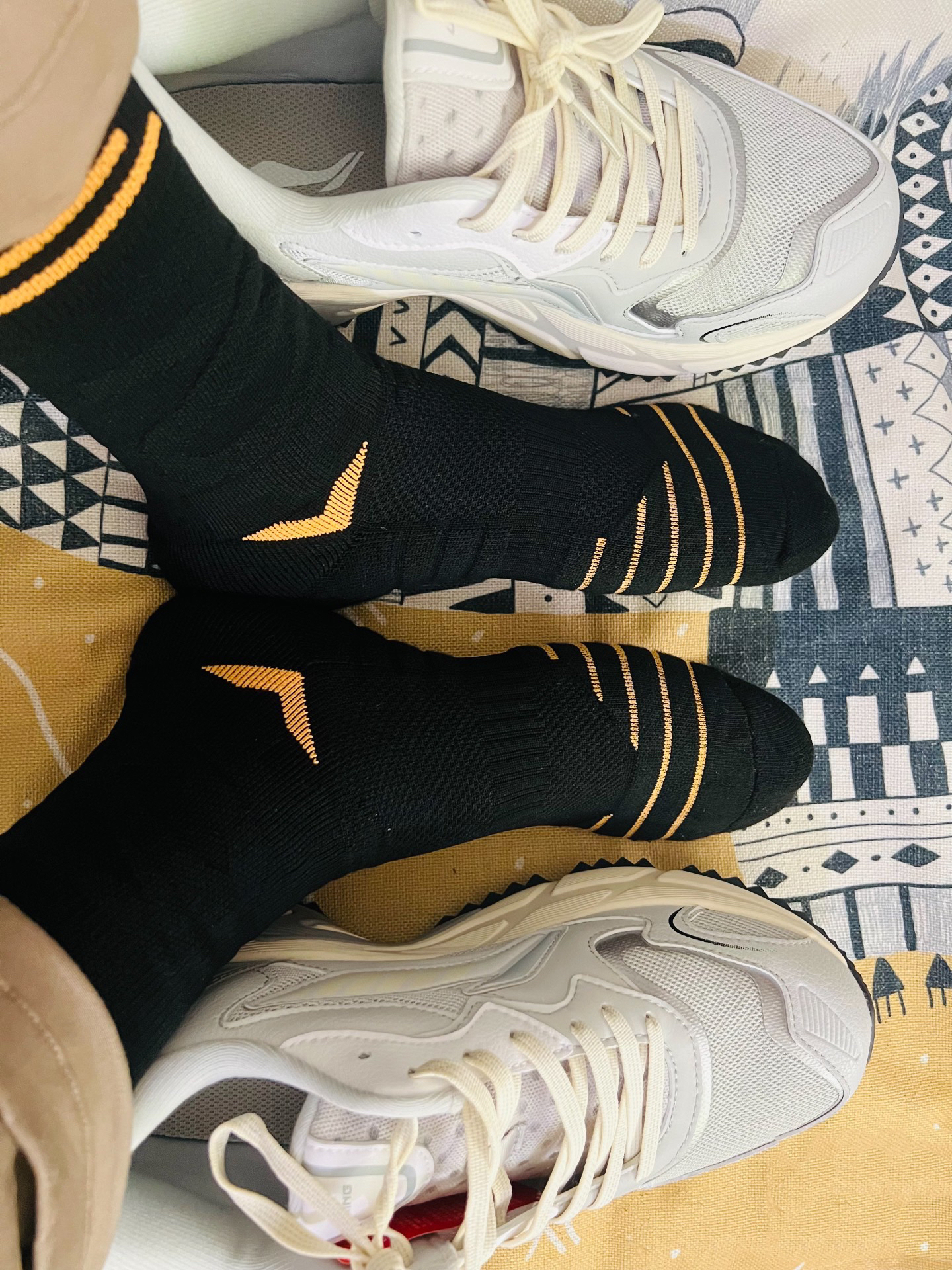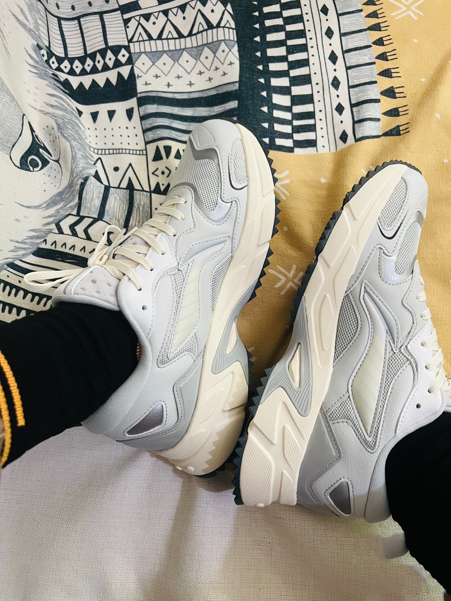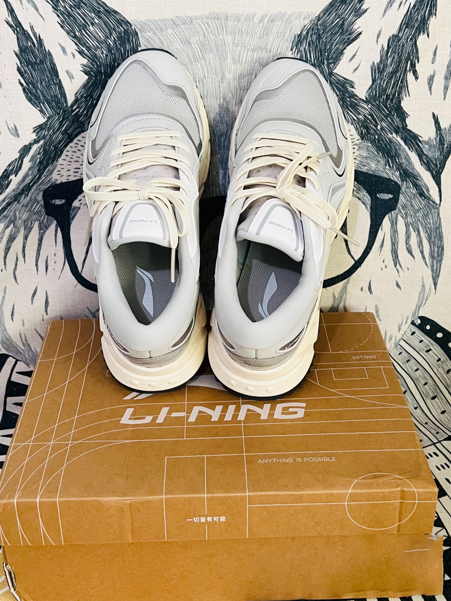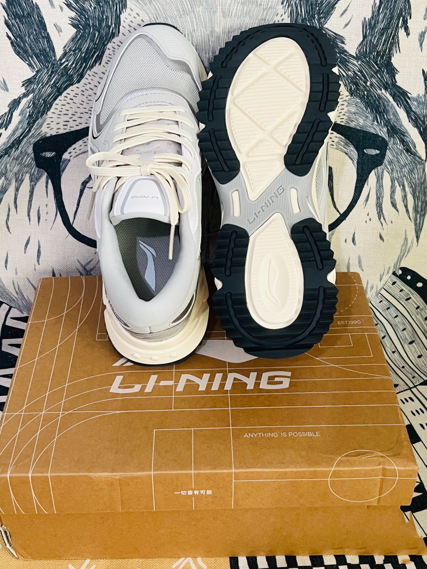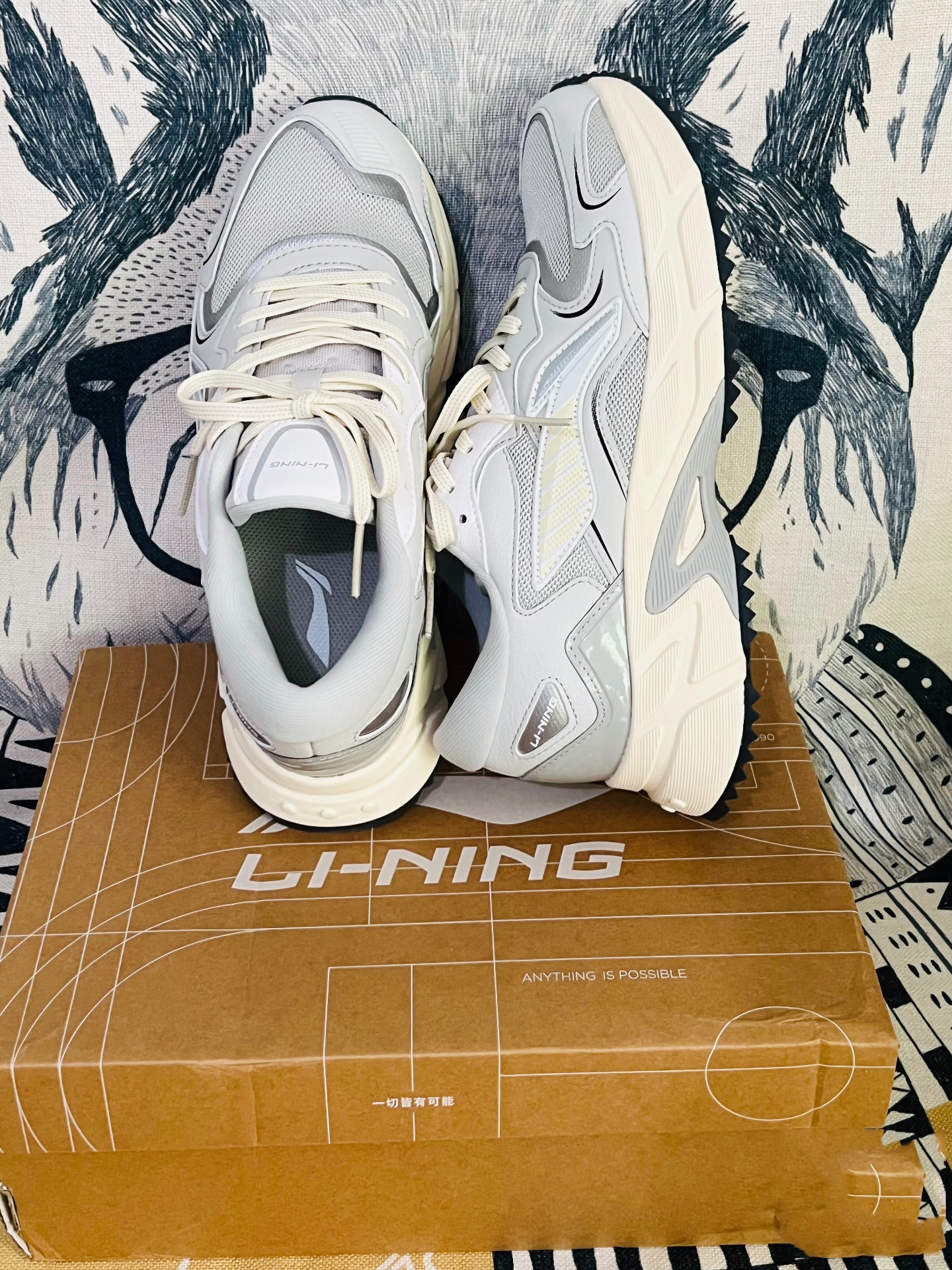 这款李宁灰色跑步鞋颜值方面还是可以的,灰色主色十李宁大logo +鞋底条纹防滑。 上脚感觉重量会比夏季的跑步鞋重一点点,鞋面是网面多层的,比较适合秋冬日常穿搭,休闲跑步登山也是可以的,鞋底防滑设计的不错,建议购买大0.5尺码。 袜子穿的是猫人厚底的,活动的时候买的,质量一看就很ok,穿着也很舒服。
