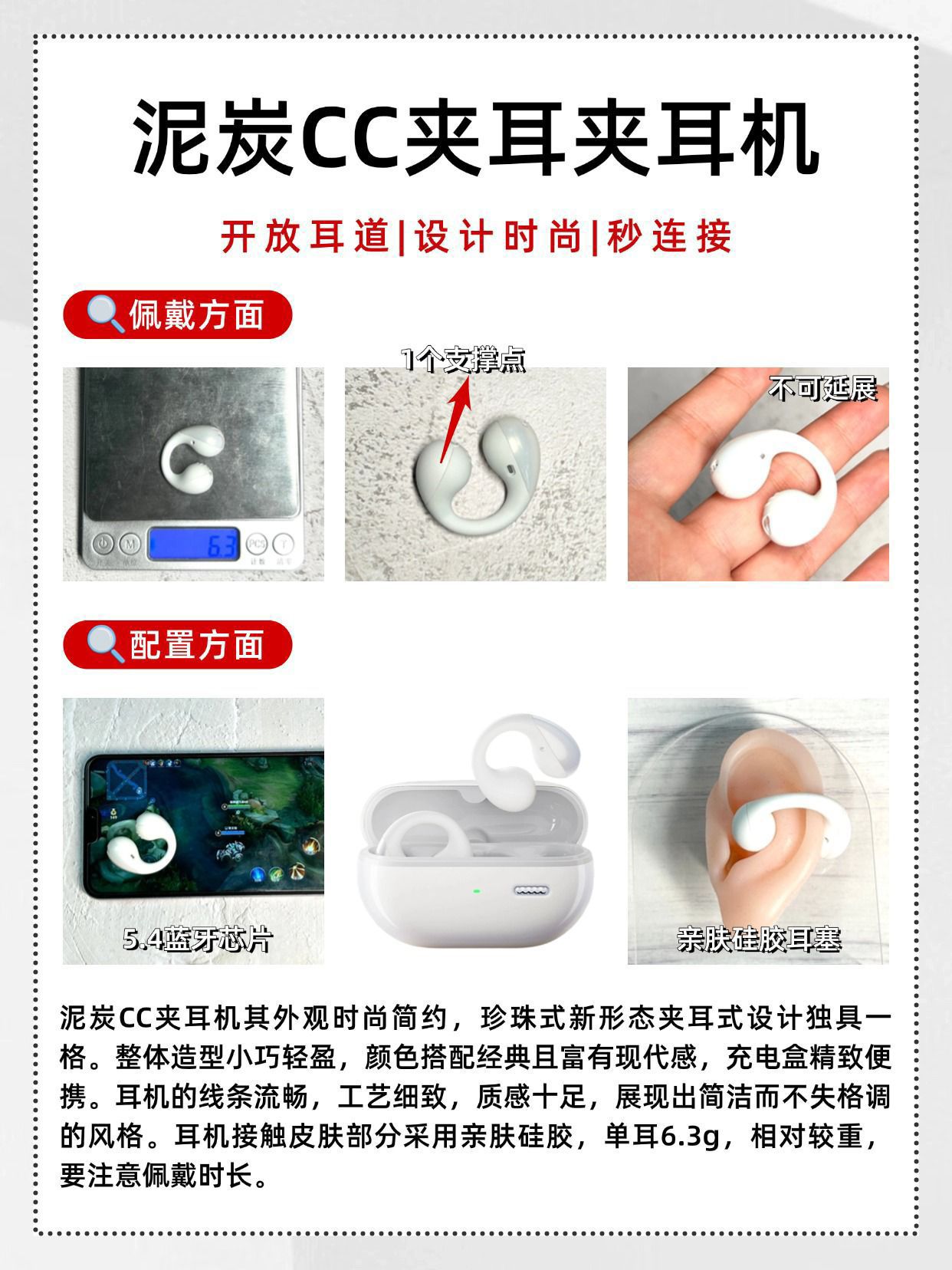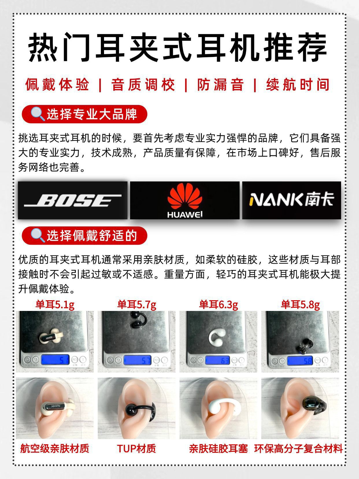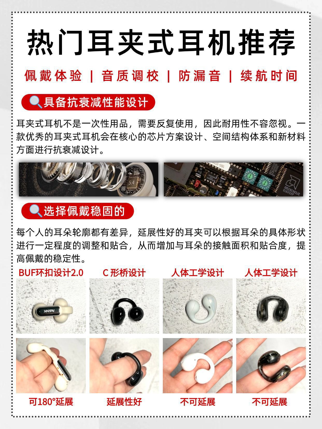 ❌拒绝盲目跟风,耳夹式耳机这样选! 第一次用耳夹式耳机,不知道怎么挑?🙋 那一定要收藏这篇攻略📒! ✔挑选耳夹式耳机的时候,要首先考虑专业实力强悍的品牌,它们具备强大的专业实力,技术成熟,产品质量有保障,在市场上口碑好,售后服务网络也完善。 ✔优质的耳夹式耳机通常采用亲肤材质,如柔软的硅胶,这些材质与耳部接触时不会引起过敏或不适感。重量方面,轻巧的耳夹式耳机能极大提升佩戴体验。 ✔耳夹...