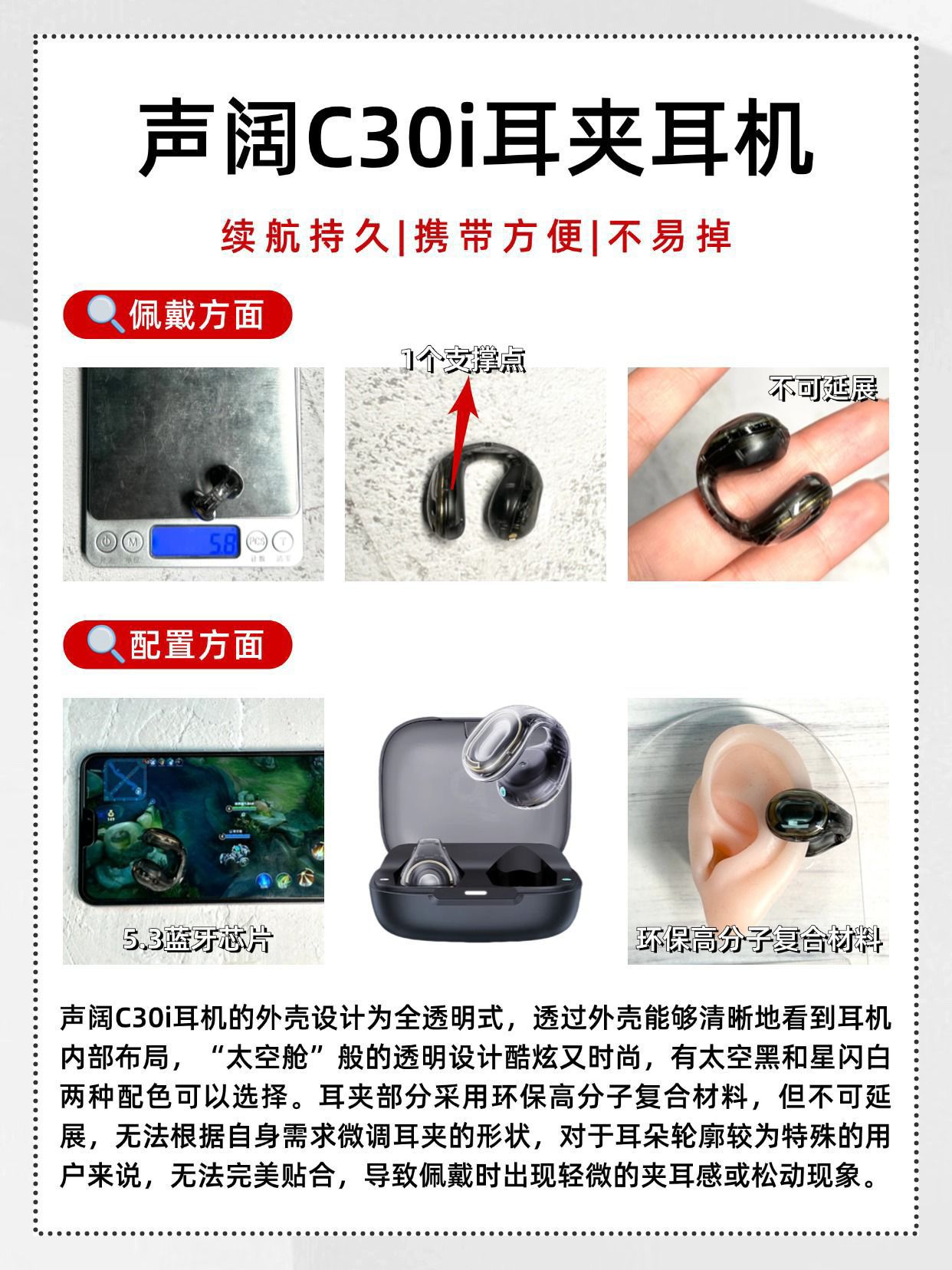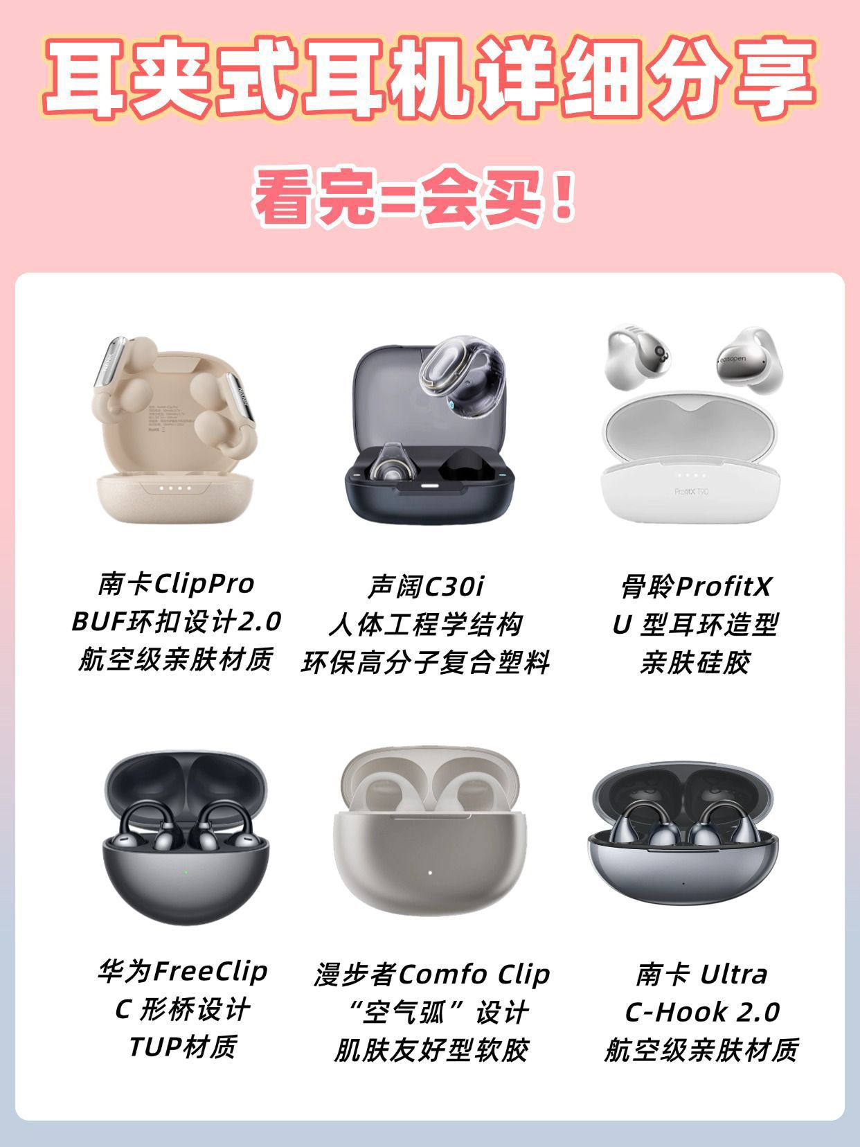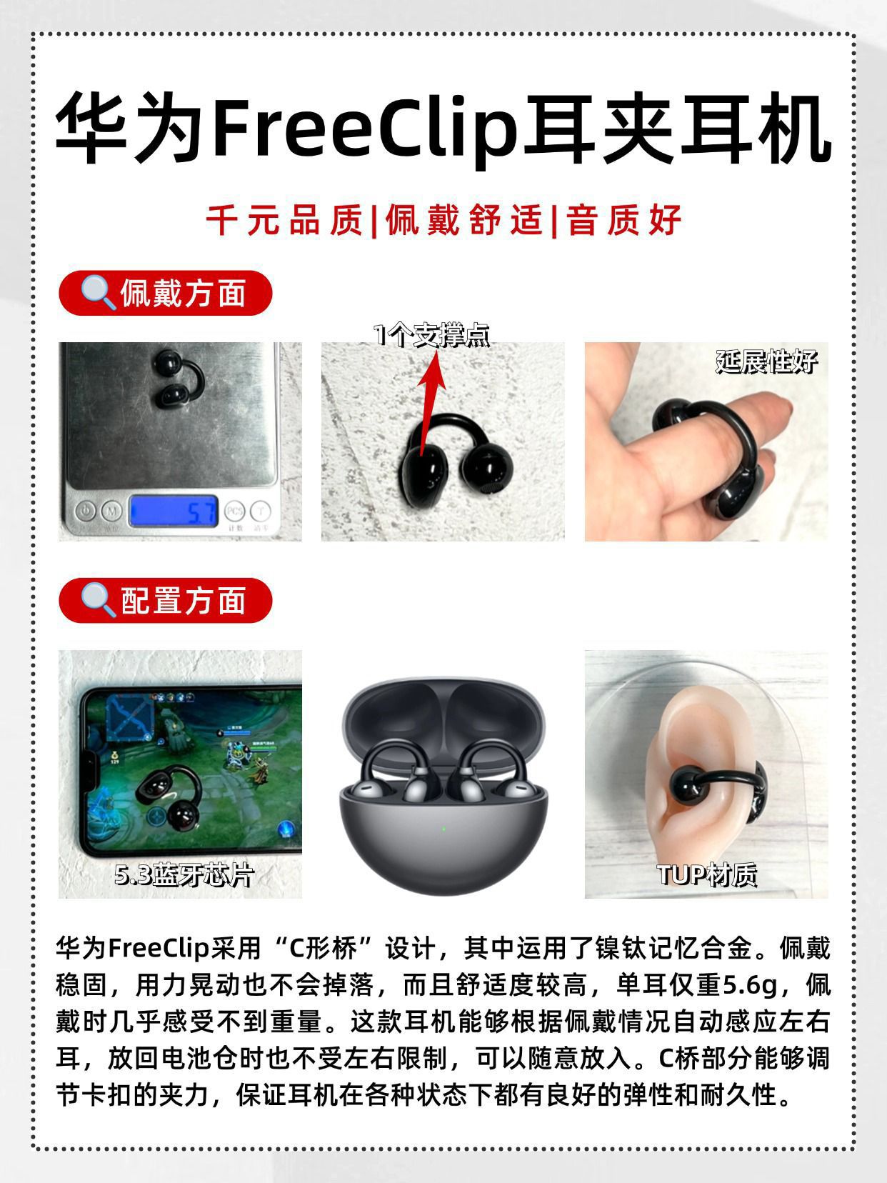 ❌拒绝盲目跟风,耳夹式耳机这样选! 第一次用耳夹式耳机,不知道怎么挑?🙋 那一定要收藏这篇攻略📒! ✔挑选耳夹式耳机的时候,要首先考虑专业实力强悍的品牌,它们具备强大的专业实力,技术成熟,产品质量有保障,在市场上口碑好,售后服务网络也完善。 ✔优质的耳夹式耳机通常采用亲肤材质,如柔软的硅胶,这些材质与耳部接触时不会引起过敏或不适感。重量方面,轻巧的耳夹式耳机能极大提升佩戴体验。 ✔耳夹...