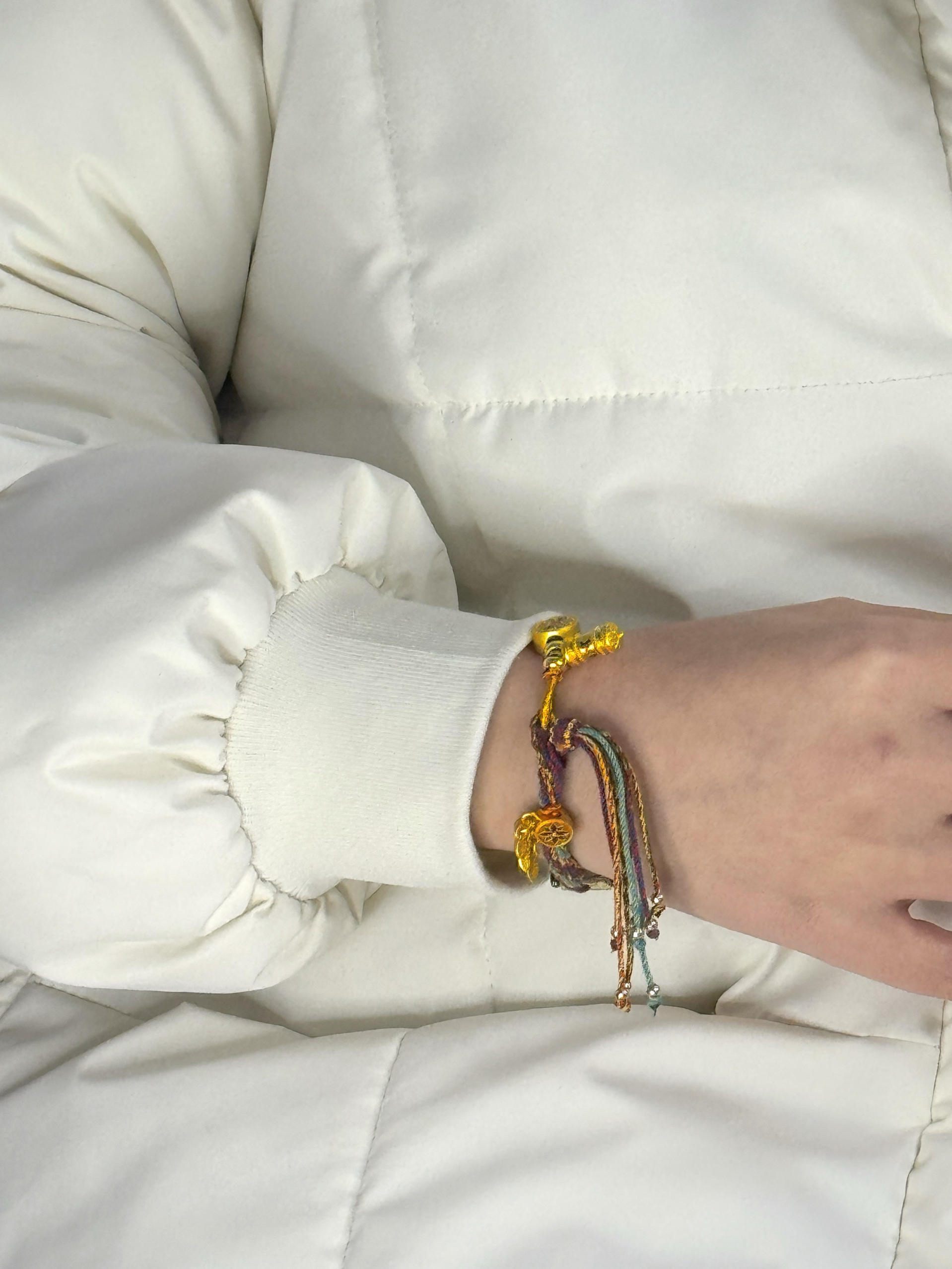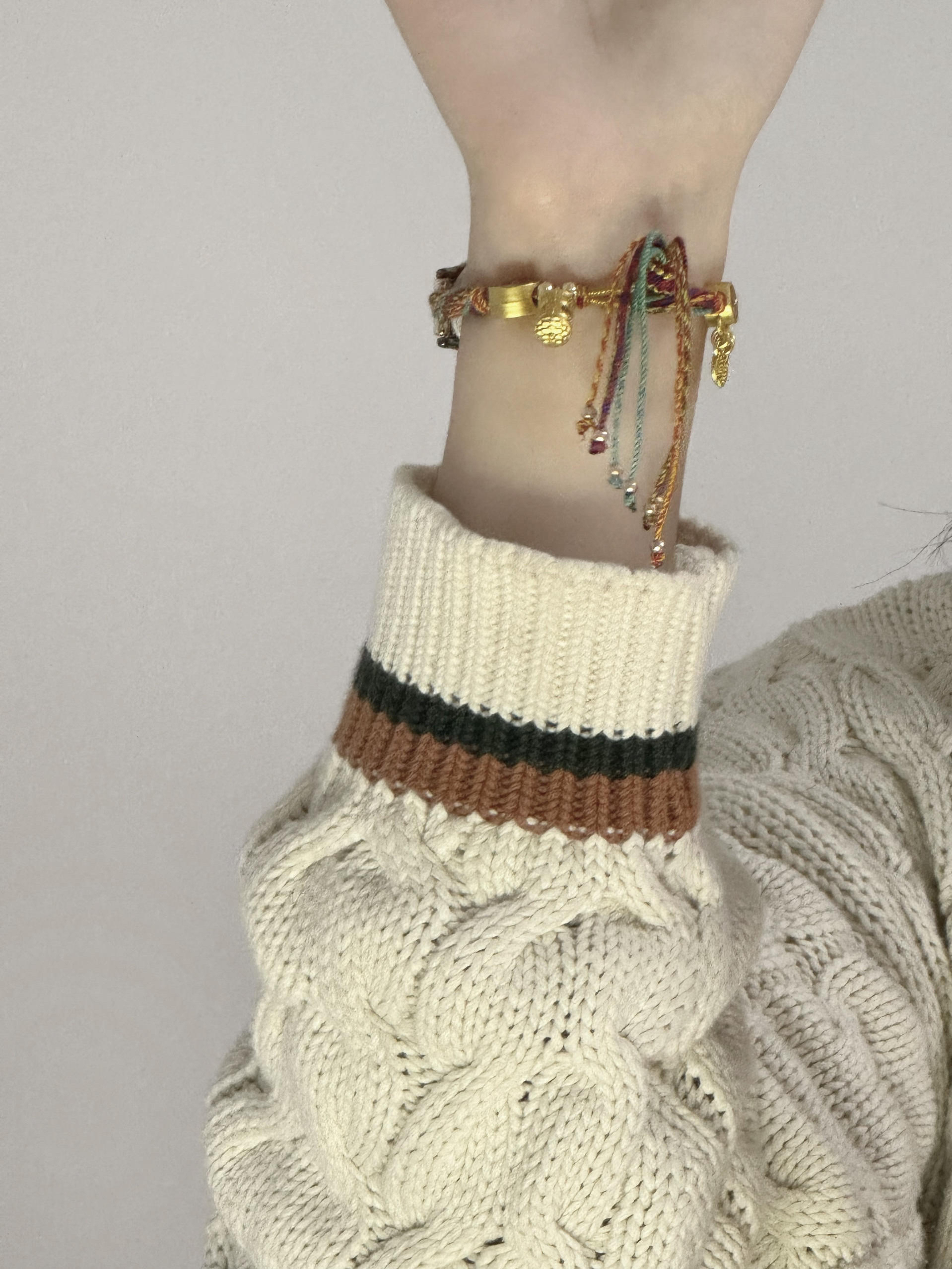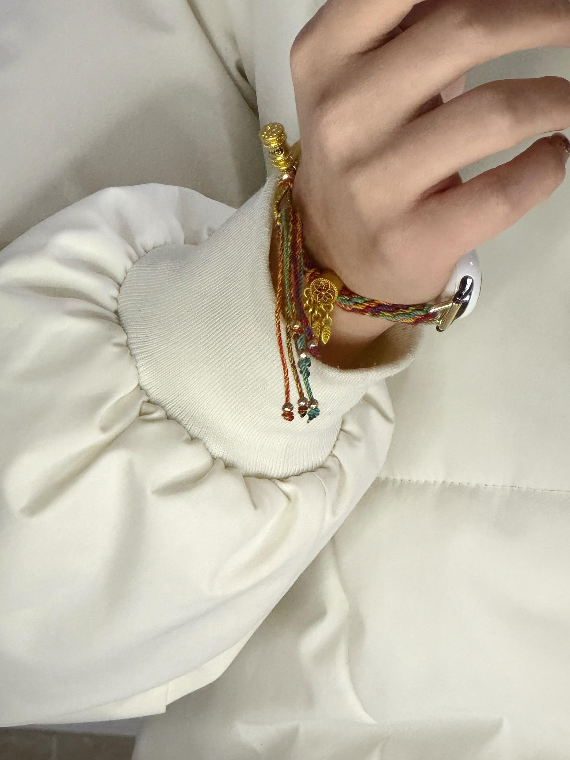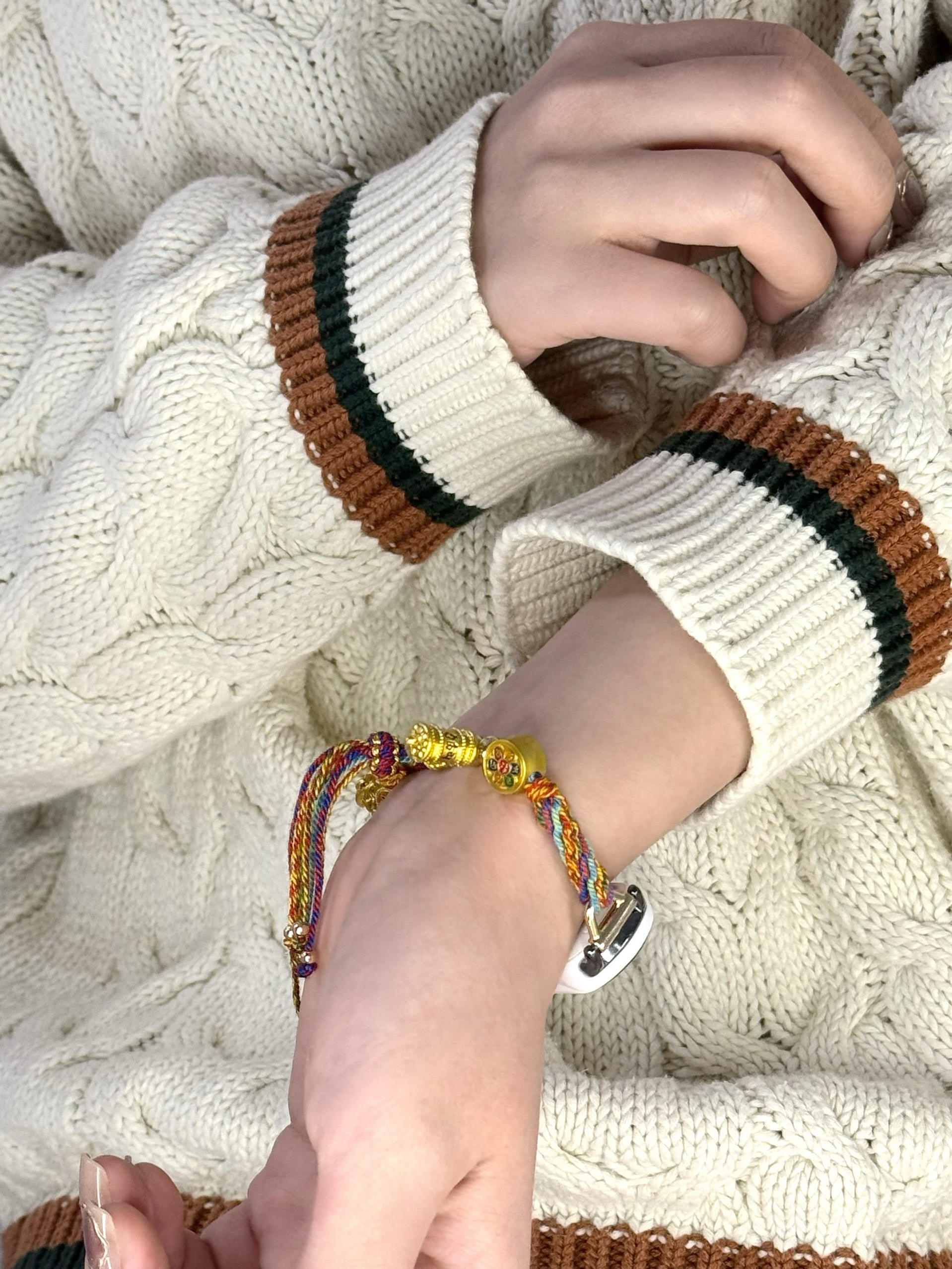 超级适合新年~ 如果是本命年什么的 我感觉单戴红绳的换成戴这个好像也还不错 我买的是彩色款的~ 长度是可以调节的 还是蛮方便的嘻嘻 不过表带上面的饰品会稍微有一点容易在手上压出印子 两头编织的比较粗 拿起来会稍微比较硬一点