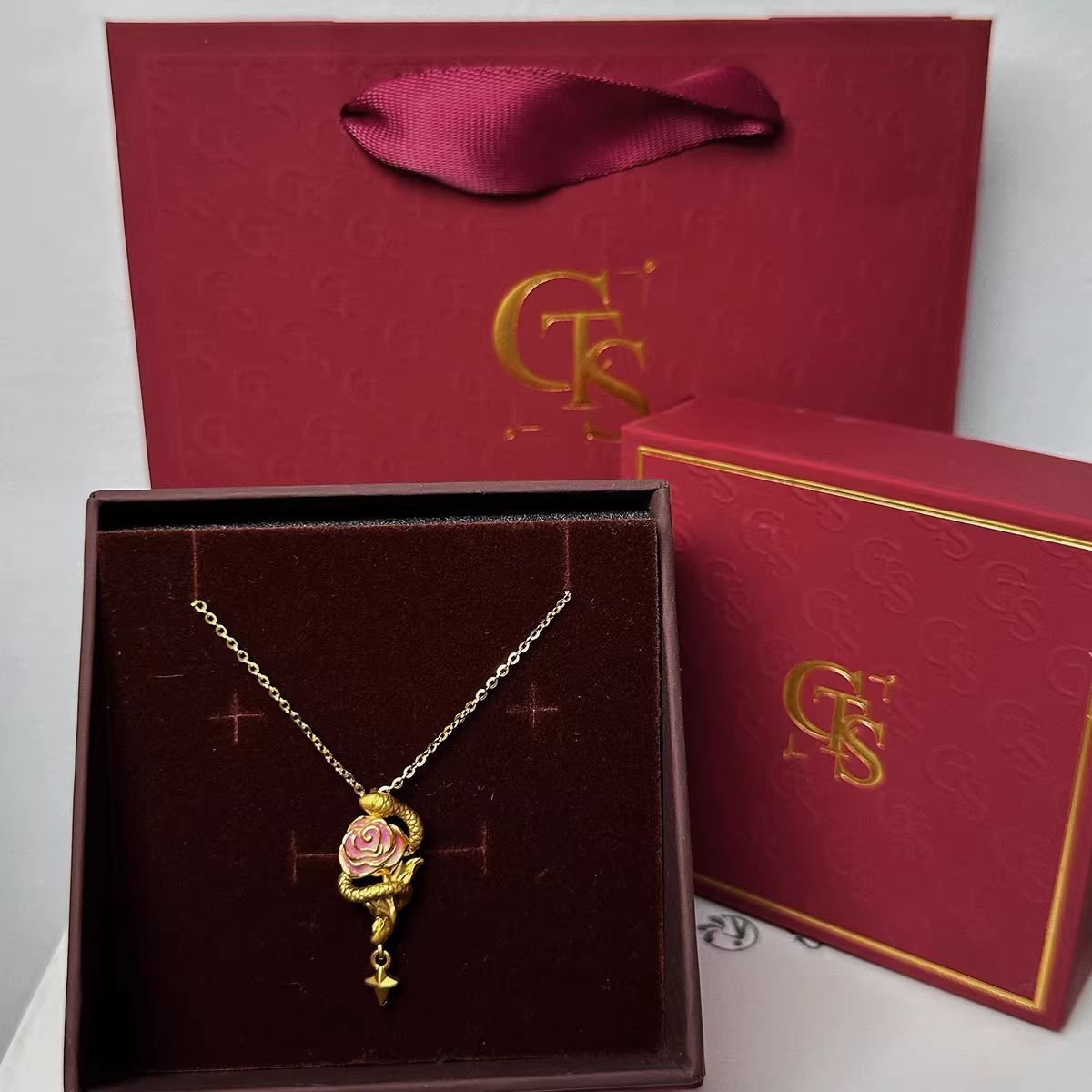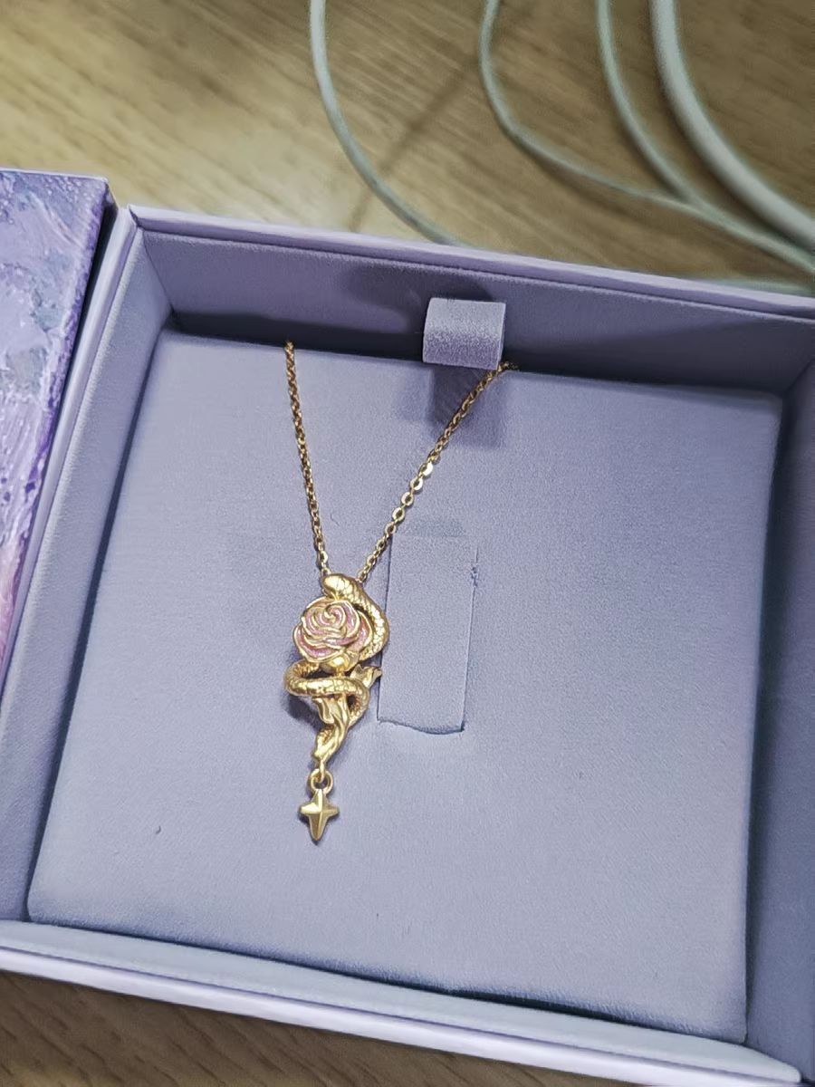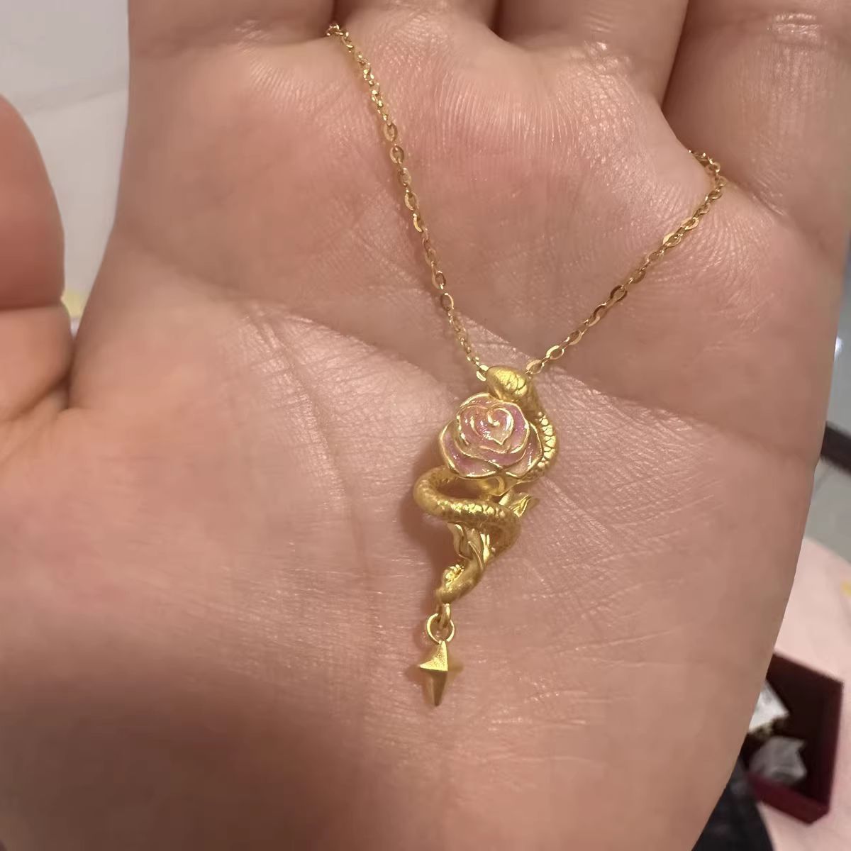 现在1g的黄金怎么也这么美啊小蛇缠绕着一朵玫瑰挺潮酷的一条项链加上玫瑰,潮酷和梦幻的碰撞玫瑰晚上发光就会成为一朵艳丽的大红色玫瑰而且蛇还是明年的生肖