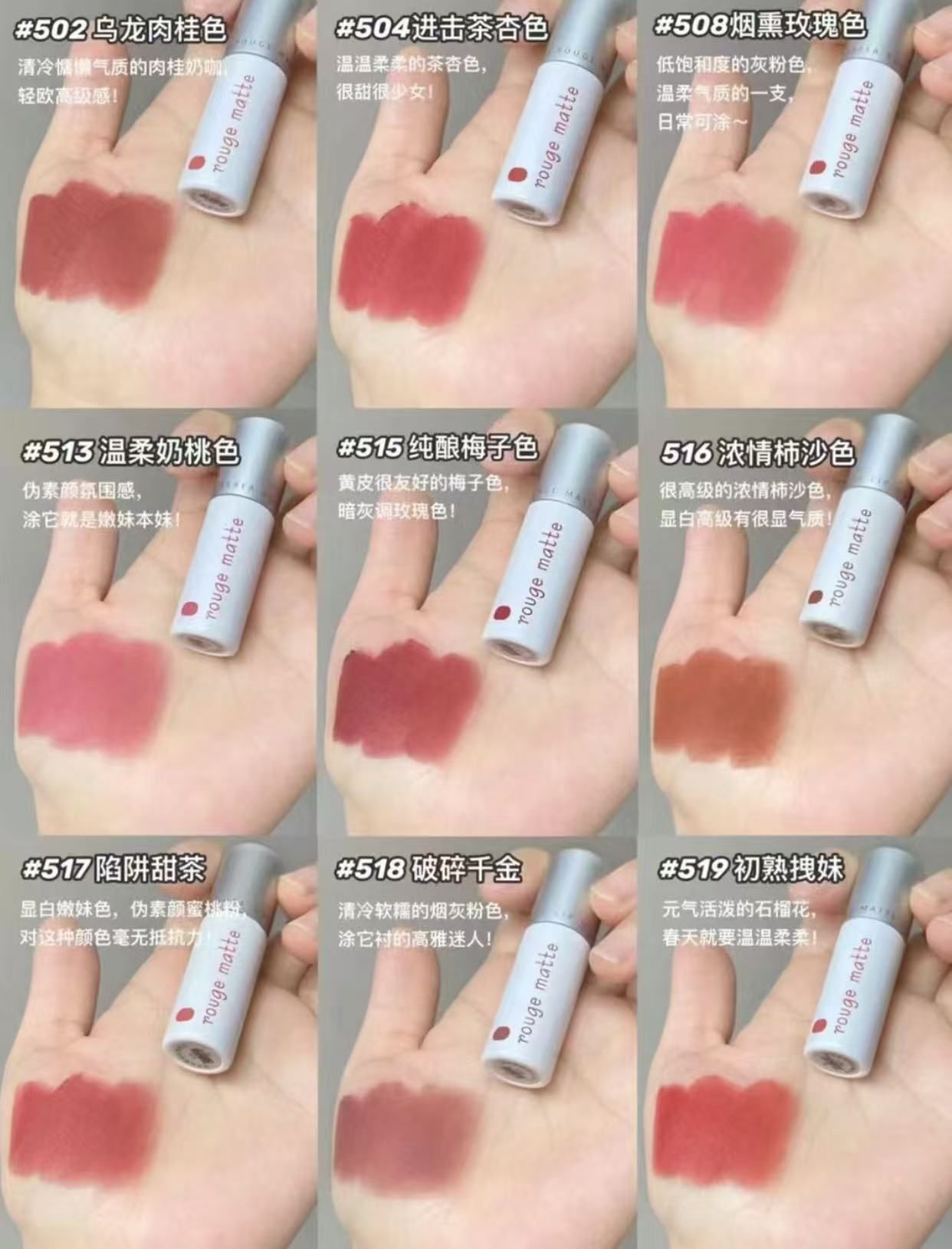 本篇笔记关联了芭贝拉 雾感丝滑唇泥 丝绒不掉色哑光 2g 502乌龙肉桂色 、芭贝拉 雾感丝滑唇泥 丝绒不掉色哑光 2g 515纯酿梅子色、芭贝拉 雾感丝滑唇泥 丝绒不掉色哑光 2g L01薄暮烟沙等商品,为用户提供真实的使用体验和购买参考。