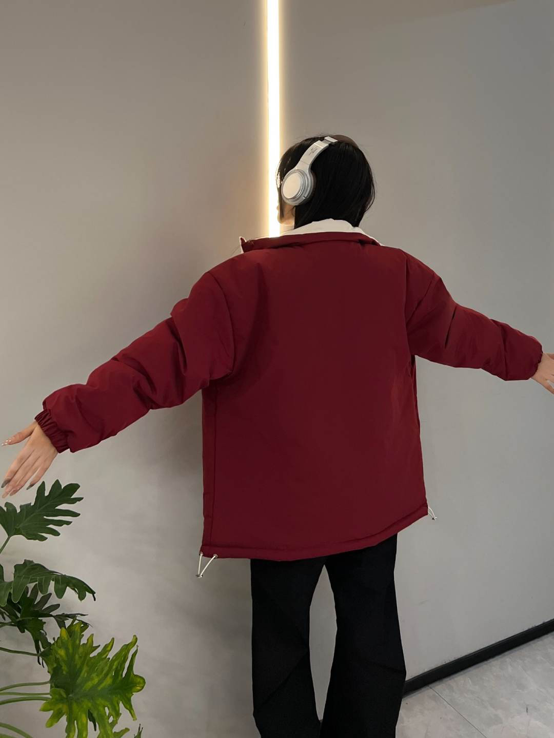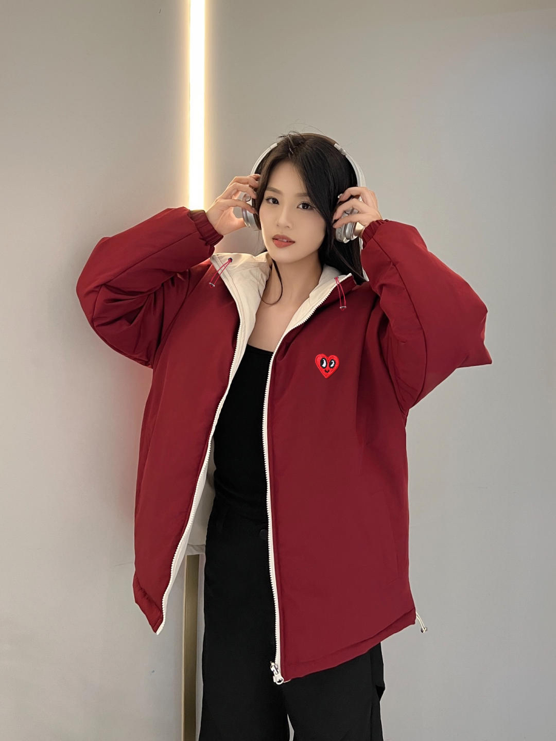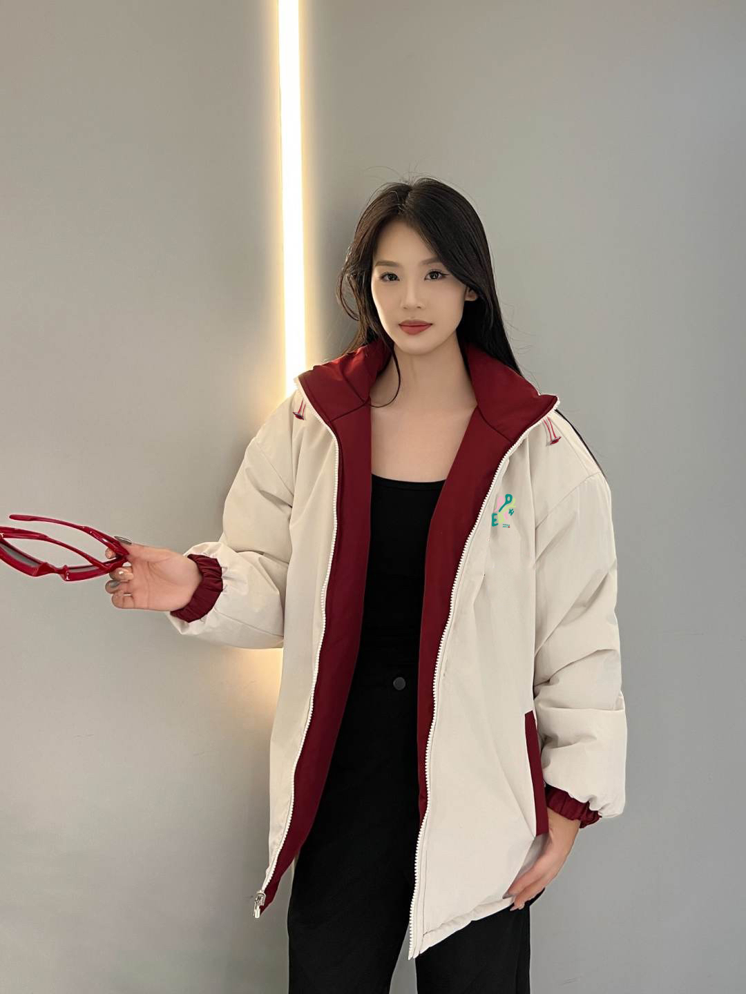 一件等于两件这个性价简直不要太高了!宽松的版型上身竟然很显瘦,保暖度也是够够的,红白的配色很好看,两面都好搭配,红色也很提气色,下身随意搭配一条黑裤就很好看呐~