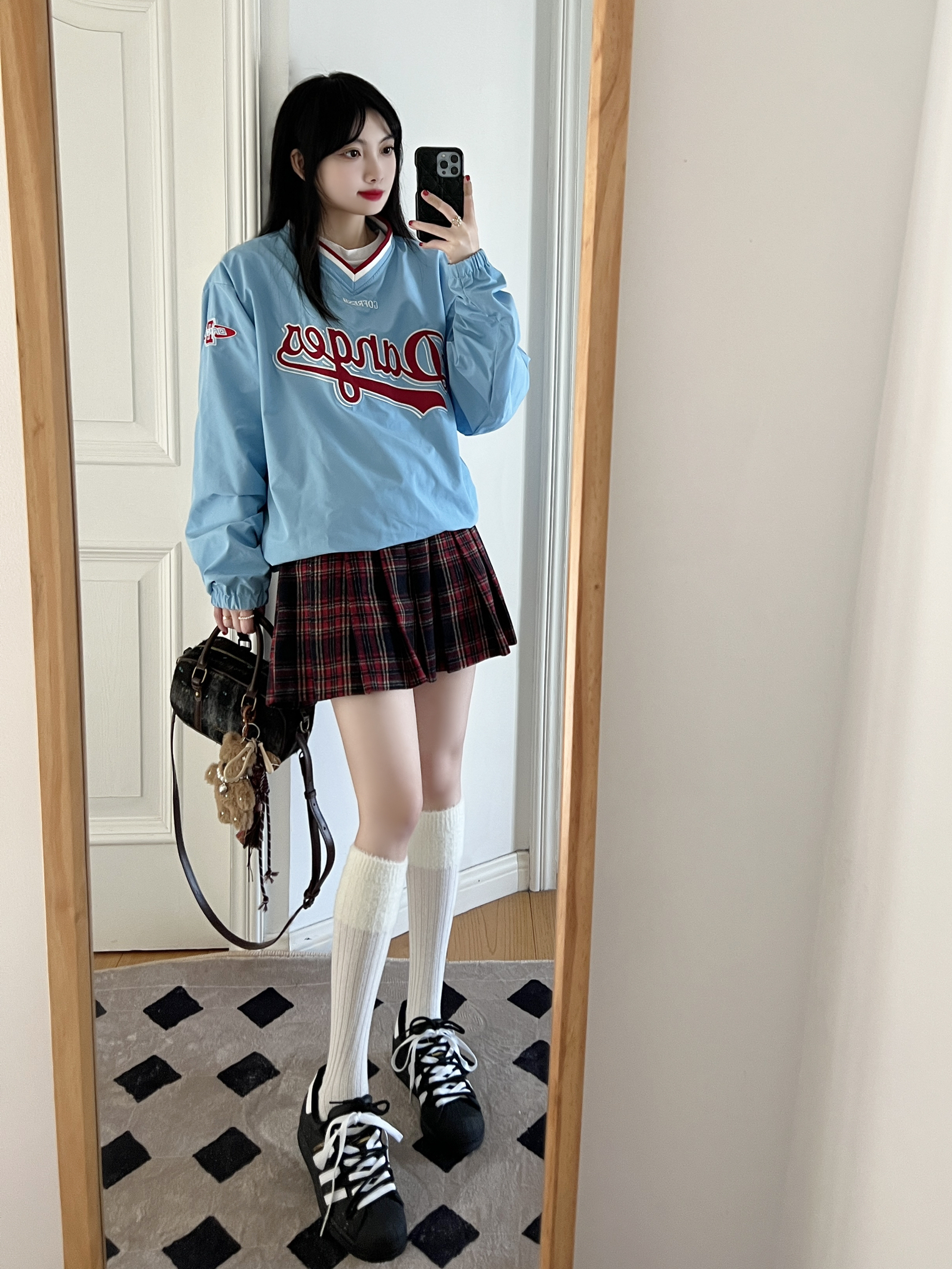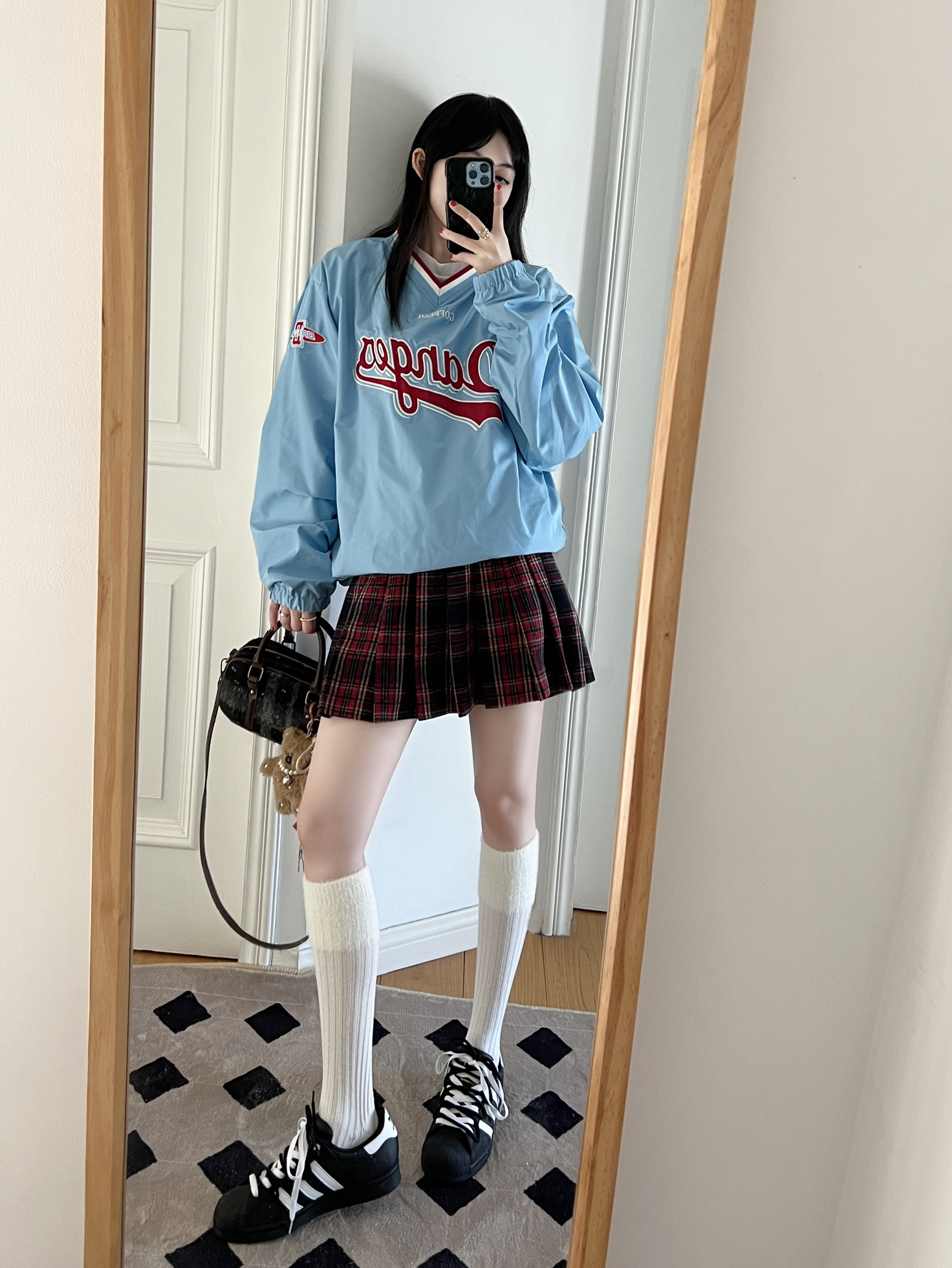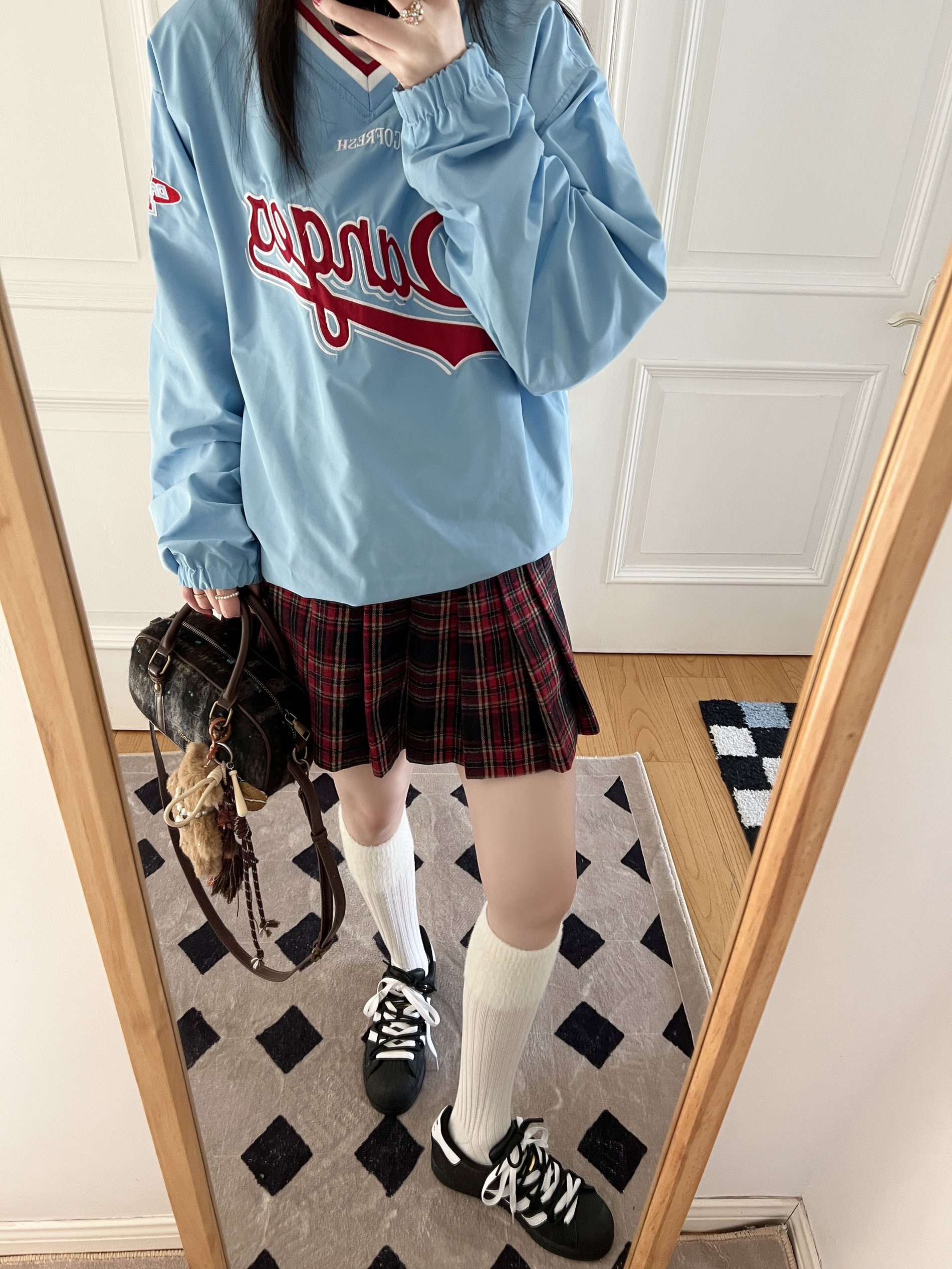 今日份的adidas girl穿搭来啦❕ 美式复古卫衣⚾️➕格纹百褶裙📚 不得不说这个蓝色真的好亮眼✨很显白 搭配红色格纹百褶裙🎀很有少女感 很适合2025开春的时候穿~