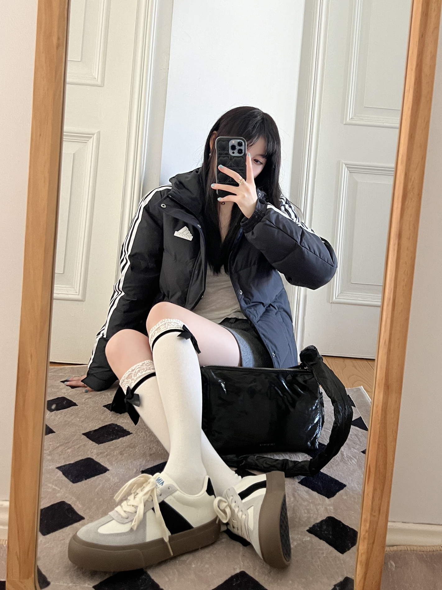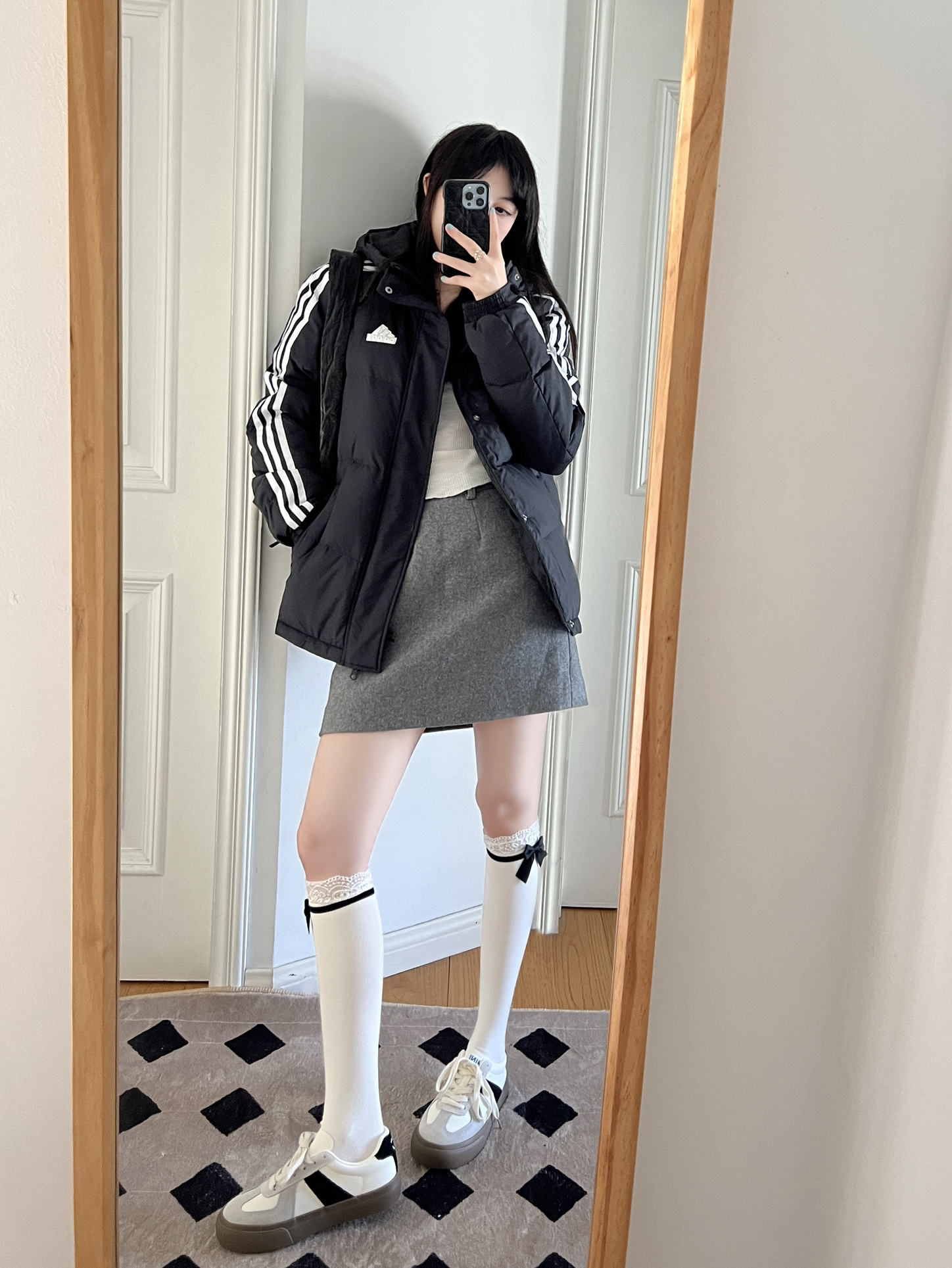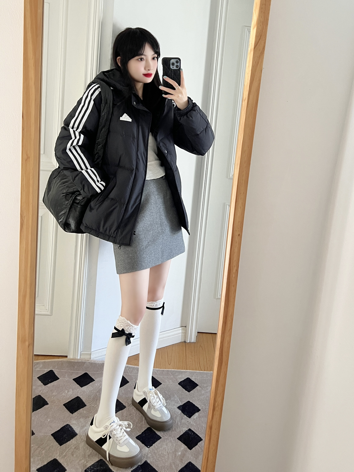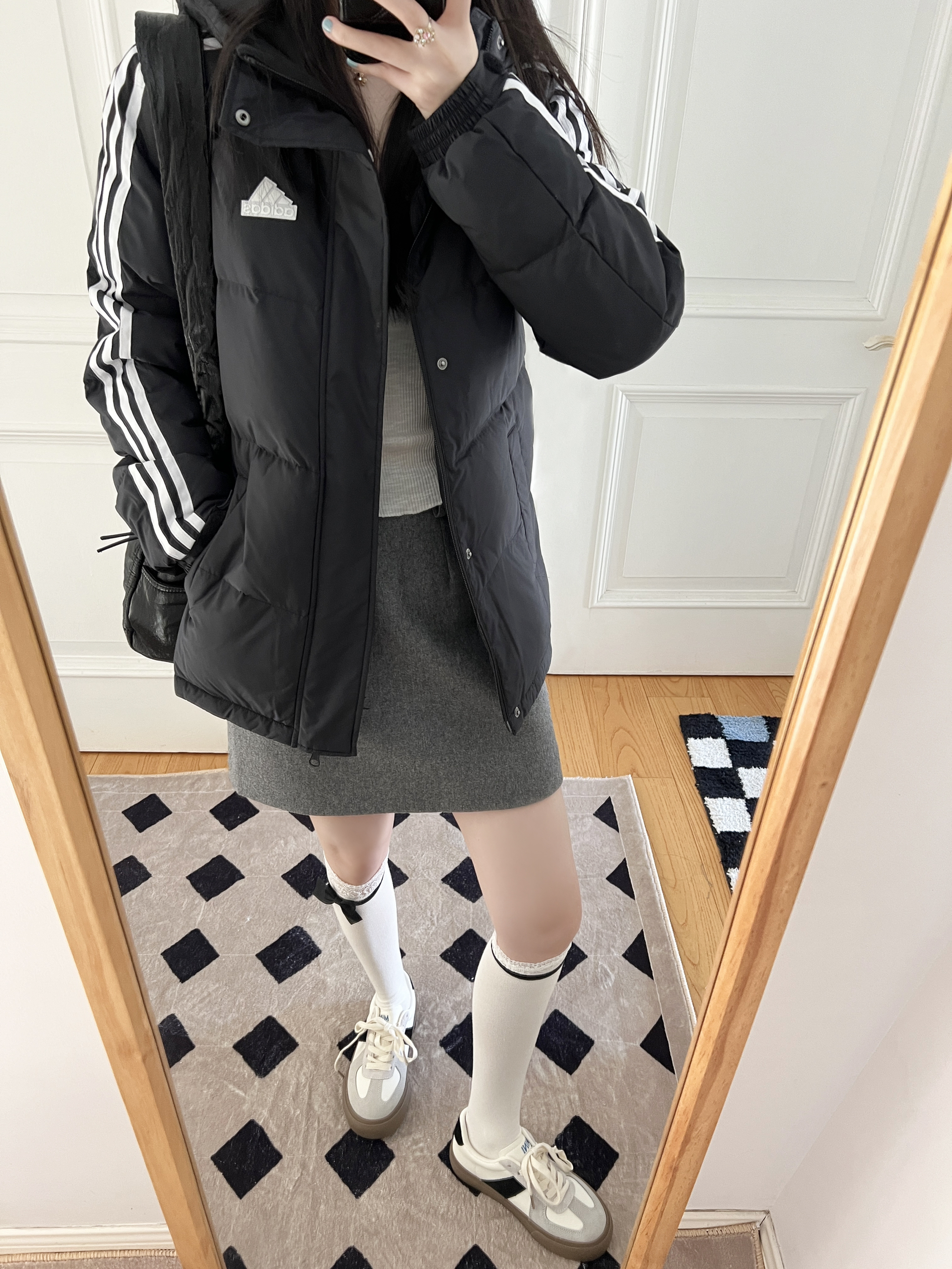 今日份的adidas girl穿搭来啦❕ 美式复古羽绒服❄️➕灰色毛呢裙🩶 搭配蝴蝶结🎀长筒袜又甜又酷 可以给整体穿搭增加不少时髦感🫶🏻