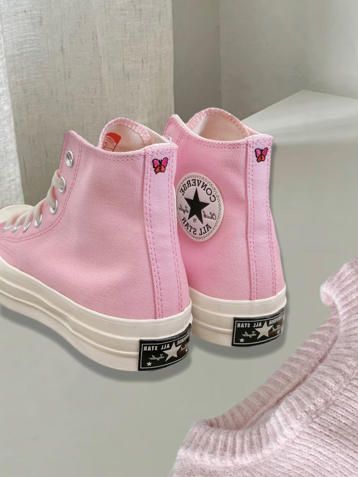 今天是被Converse美到的一天~ 透明果冻大底好喜欢💕! 鞋尾刺绣精致小蝴蝶, 是我超喜欢的少女粉🥹🍧