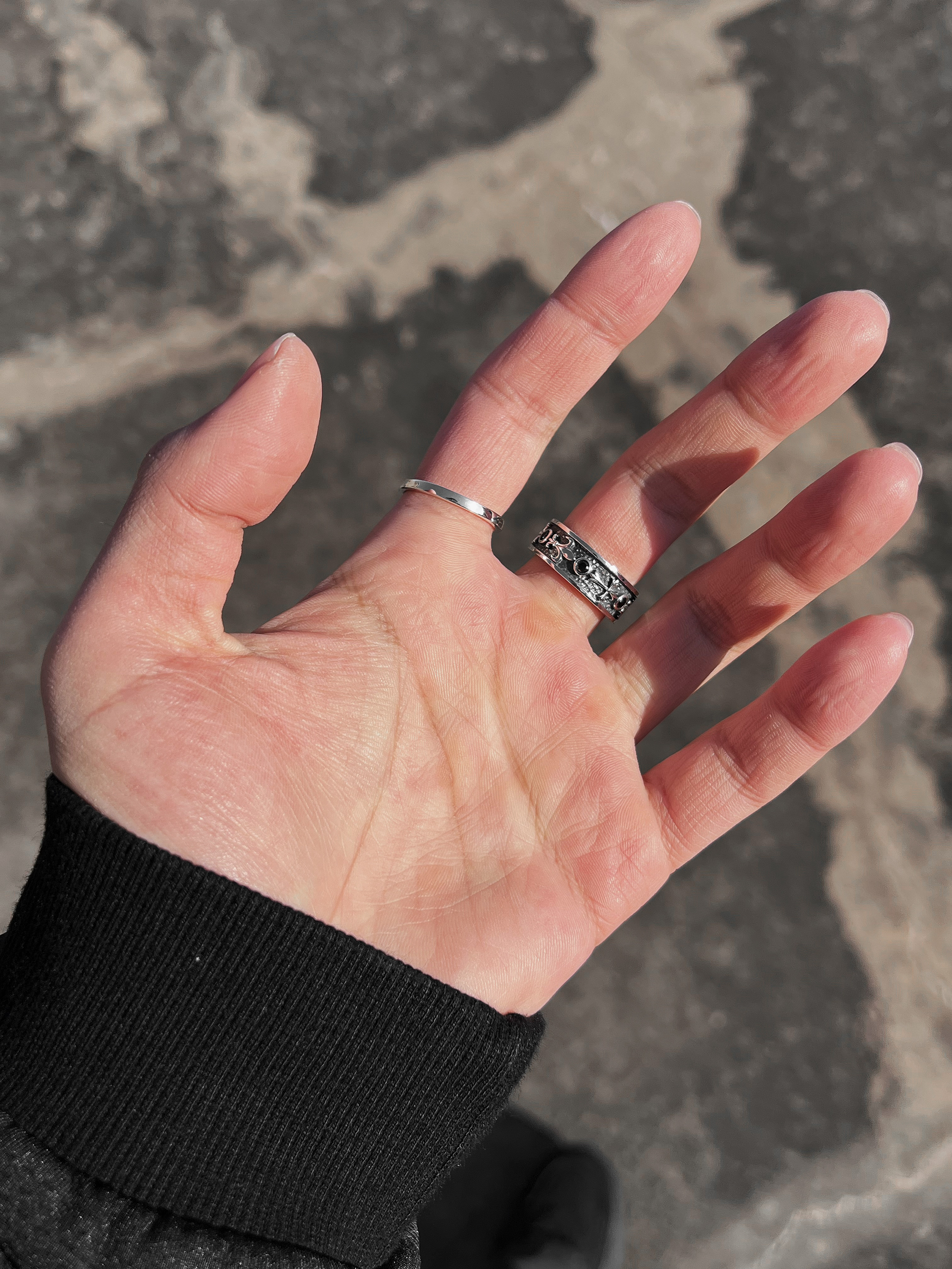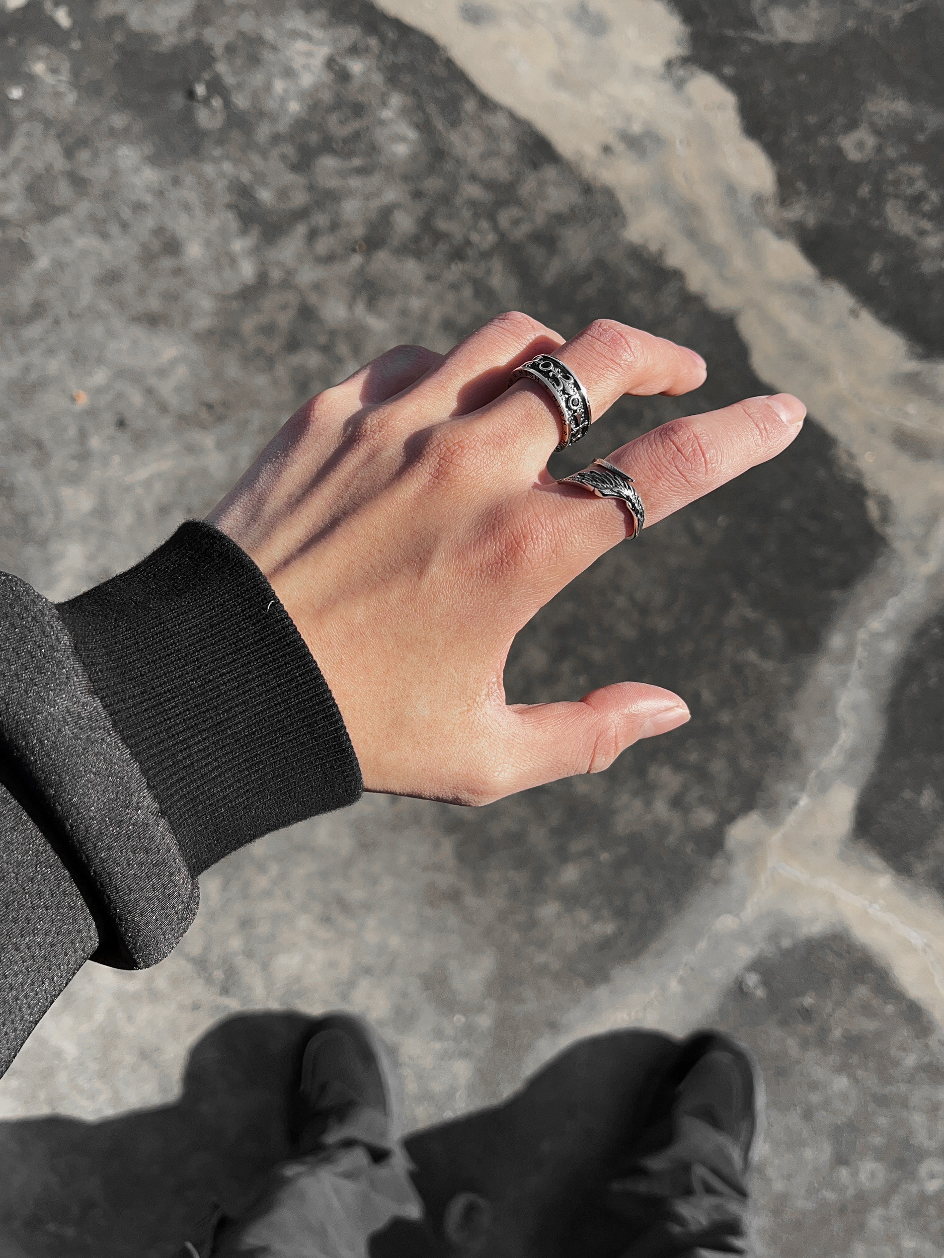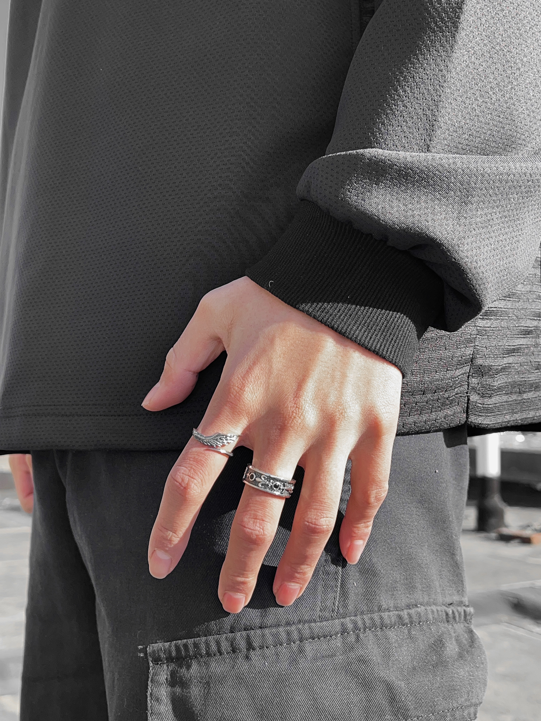 新年有新衣服 新配饰当然不能少了 今天出街手上带了俩个纯银的小众戒指 贼有设计感 一个是天使之翼 翅膀上的羽毛非常立体 用了做旧部分熏黑工艺 一个是鸢尾花环绕设计 花身光泽感不错 两个搭配穿戴效果真的爆炸 痞帅痞帅的~