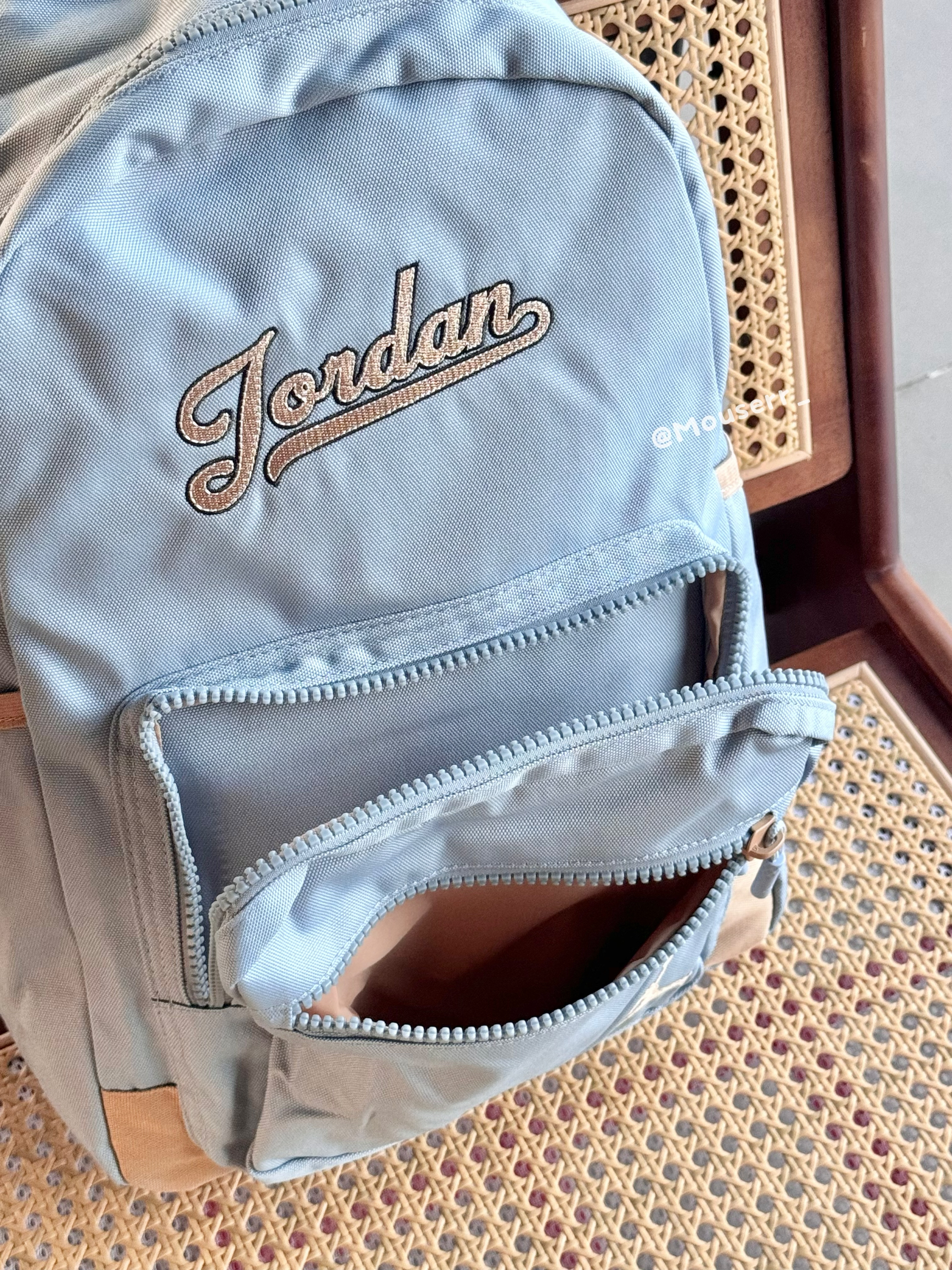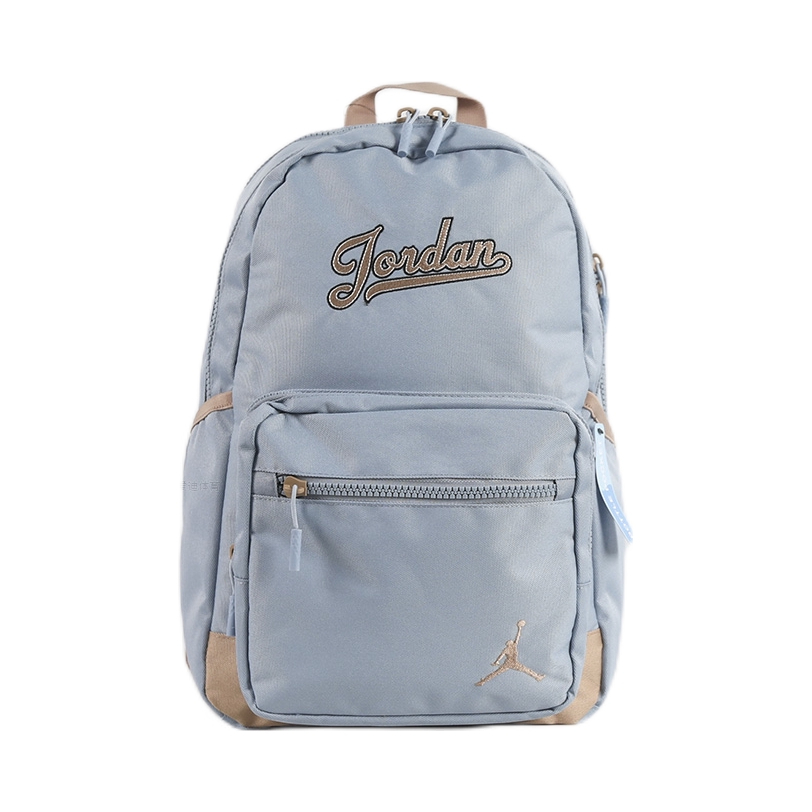 今天来给你们分享一款超级清新的乔丹双肩包啦🧐 👀双肩包是浅蓝色的,正面有一个拉链口袋,上面绣着“Jordan”字样,包的右下角还有乔丹的飞人logo,设计简约又时尚。 🌟这款双肩包的材质很轻便,背起来很舒服。而且它的容量也很可观,书本、文具、化妆品之类的都可以轻松装下。