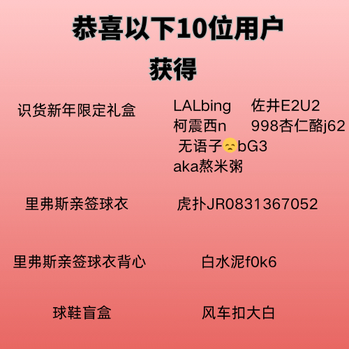 1⃣获得现金返现奖励的用户可在APP内【我的】—【返现】中查看~ 奖励发出后会以站内消息形式推送通知,可按提现页面的操作进行提现。 2⃣获得无门槛购物返现券的中奖用户可在在【我的】-【优惠券】中进行返现券查询。奖励发出后会以站内消息形式推送通知,返现券将于发出后一个月失效,请及时使用,逾期自动作废,识货APP不做任何补偿。 3⃣实物(球衣、球鞋、礼盒等)中奖用户于2024年1月19日23:59:5...