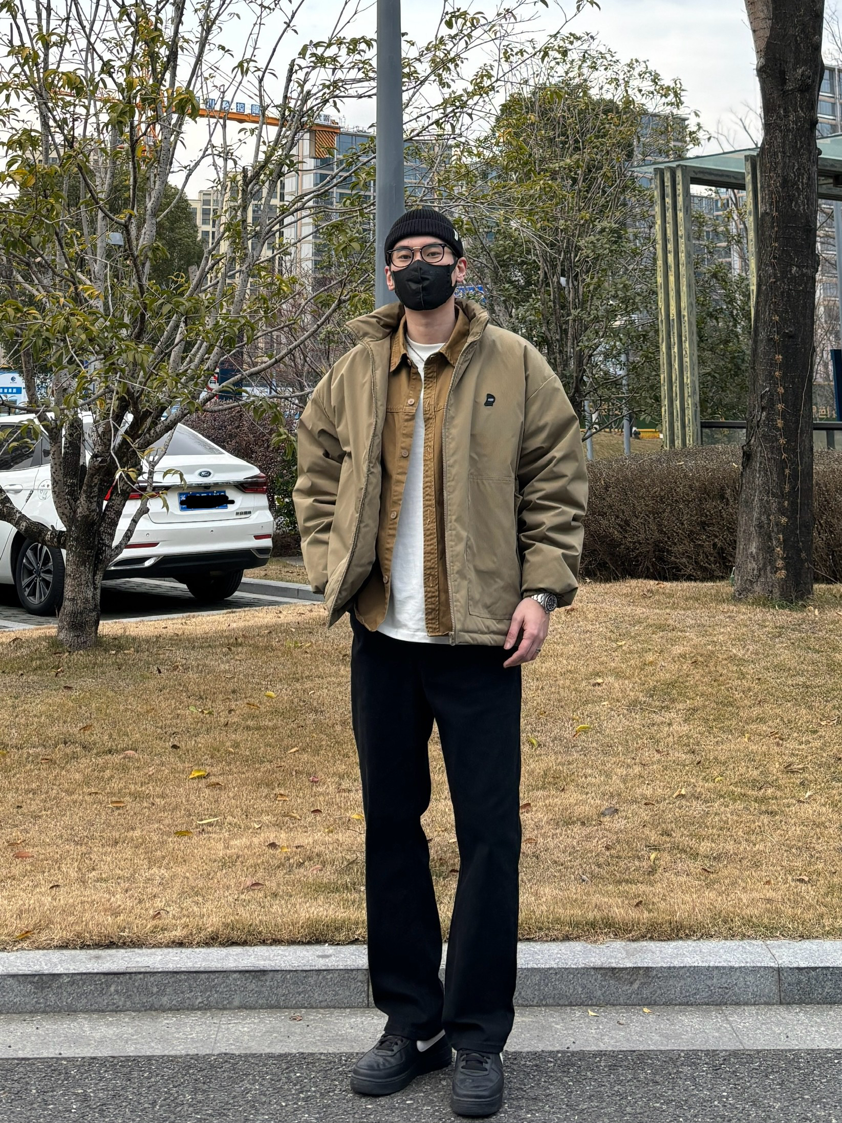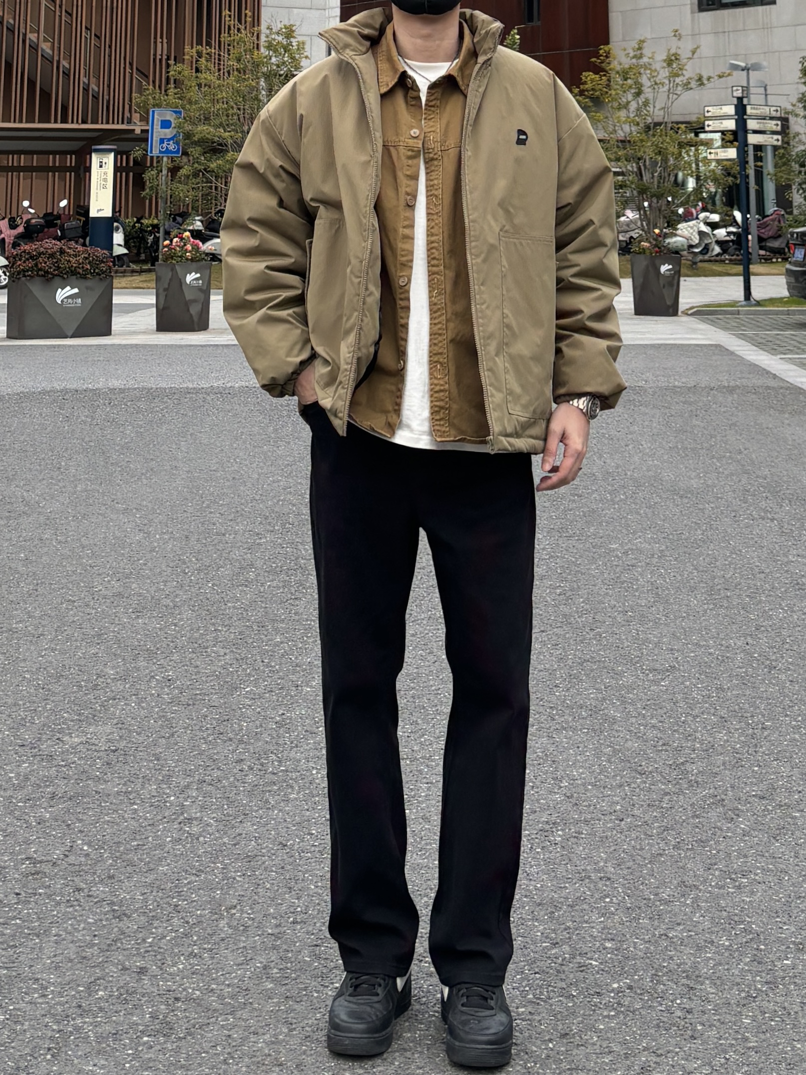 今天这套先用卡其色做旧工装衬衫做叠穿 ⬇️ 裤子选择显腿长腿直的黑色直筒水洗牛仔裤 ⬇️ 鞋子上脚经典百搭的黑色系af1 ⬇️ 接着套上卡其绿宽松阔版小刺绣立领棉服夹克 ⬇️ 最后戴一顶棒球帽呼应下裤子鞋子的颜色 - 今日搭配 衣服裤子:NICE LILI 鞋子:AF1