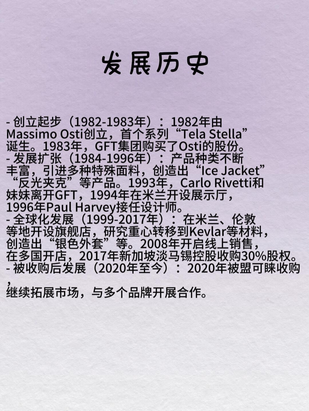 - 全球化发展(1999-2017年):在米兰、伦敦等地开设旗舰店,研究重心转移到Kevlar等材料,创造出“银色外套”等。2008年开启线上销售,在多国开店,2017年新加坡淡马锡控股收购30%股权。